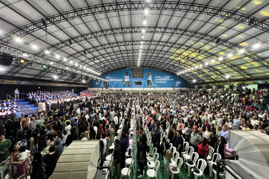 A segunda noite de colação de grau da Cidade Universitária foi realizada neste sábado, 14, no Ginásio Moreninho. A cerimônia reuniu concluintes de 25 cursos dos Institutos de Química (Inqui), Física (Infi) e Matemática (Inma) e das Faculdades de Engenharias, Arquitetura e Urbanismo e Geografia (Faeng); Artes, Letras e Comunicação (Faalc); e de Ciências Humanas (Fach).