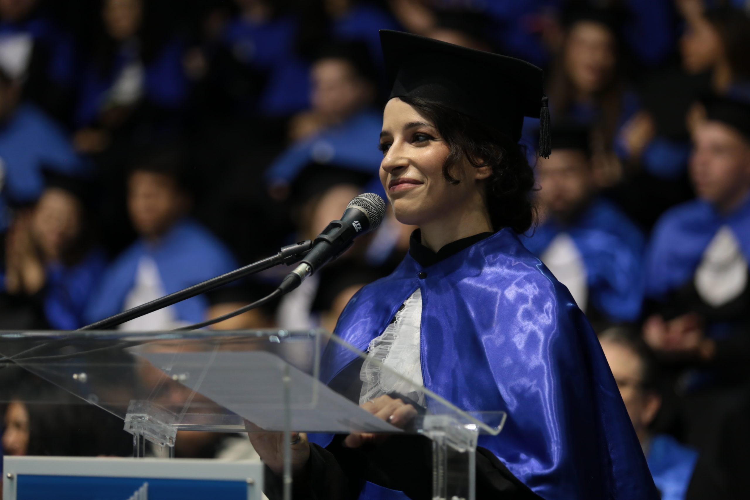 Em nome de todas as turmas, a formanda do Curso de Licenciatura em História da Fach e oradora, Bárbara Rodrigues Beretta, discursou sobre o sonho que se tornou realidade e os desafios da profissão. “Nos últimos quatros anos, poucas coisas me orgulharam tanto quanto falar em nome dos meus colegas. Somos um grupo plural, formado por indivíduos com amor pela História, mas que escolheram diversos caminhos dentro da Universidade. Cada um de nós construiu uma jornada única. Nosso primeiro ano de forma virtual, passamos por um momento histórico de caos, mas perseveramos. Nós sonhávamos que um dia chegaríamos aqui e nós conseguimos, temos conhecimento para contribuir com a sociedade, graças a educação pública. Estamos aqui hoje e agradeço a toda a sociedade que contribuiu com isso. Professores são formados na Universidade, exige coragem e amor, precisamos resistir aos discursos que afetam a educação, celebramos hoje uma conquista e assumimos o compromisso de mudar a sociedade. Chegou a nossa vez de exigir e proteger os direitos conquistados”.