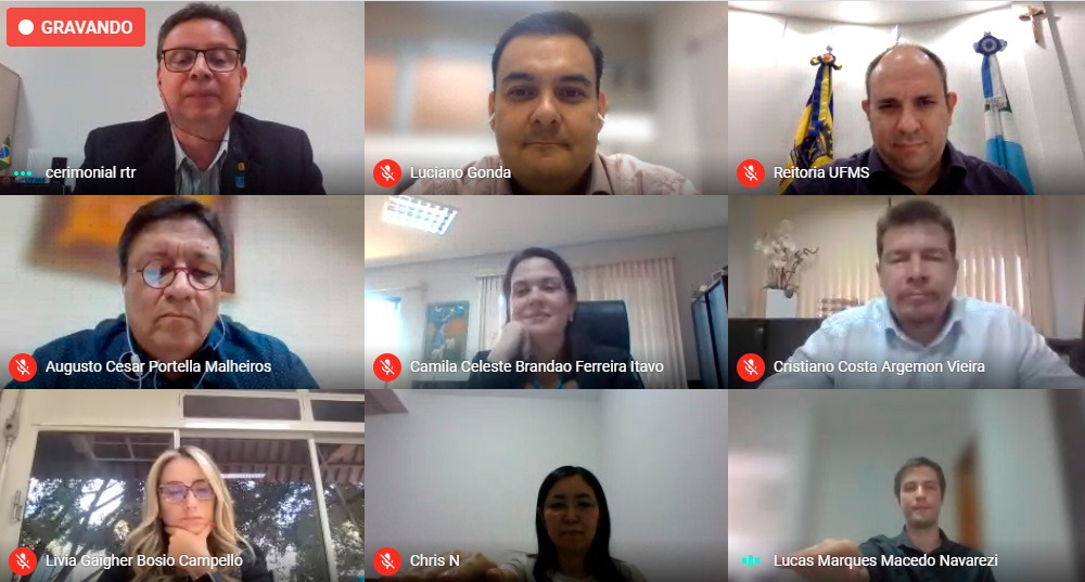O reitor Marcelo Turine e a vice-reitora Camila Ítavo deram posse em solenidade realizada por videoconferência, nesta quinta-feira, 20, a seis novos servidores. Quatro deles para o cargo de técnico-administrativo, sendo: Rafael Cavalcante do Nascimento e Lucas Marques Macedo Navarezi, lotados na Agência de Tecnologia de Informação e Comunicação (Agetic); Mauro dos Santos de Arruda e Christiane Nishibe, lotados na Agência de Educação Digital e a Distância (Agead); e duas professoras: Xiomara Esther Vazquez Carrazana, para o Campus de Três Lagoas; e Joice Chiareto, que vai atuar no Campus do Pantanal.
