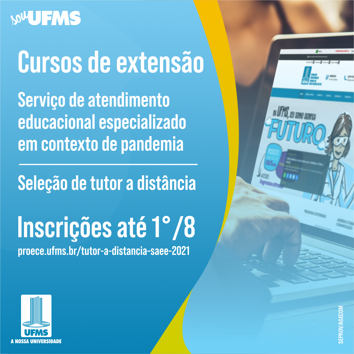 Interessados em atuar como tutor a distancia no curso de extensão “Atendimento educacional especializado em contexto de pandemia” têm até 1º de agosto para se candidatarem. As inscrições são gratuitas e podem ser feitas no site proece.ufms.br/tutor-a-distancia-saee-2021.