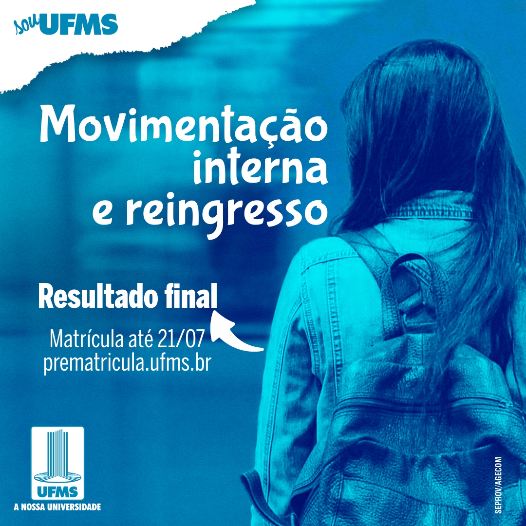 A matrícula dos selecionados para reingresso e movimentação interna na UFMS pode ser feita até as 23h59 de hoje, 21 de julho. A lista com o resultado pode ser acessada no portal de Ingresso.