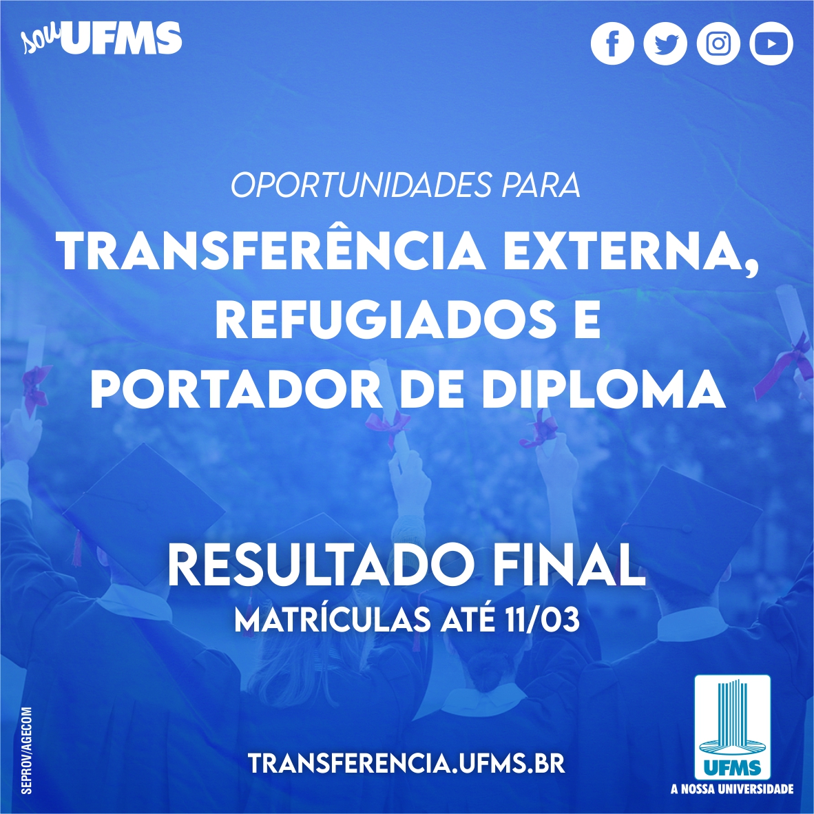 O resultado final do processo seletivo com a lista de selecionados e a convocação para matrícula podem ser acessados no site ingresso.ufms.br. A matrícula deve ser feita no site transferencia.ufms.br, com o preenchimento do cadastro acadêmico e anexação do requerimento de matrícula e demais documentos indicados no edital.