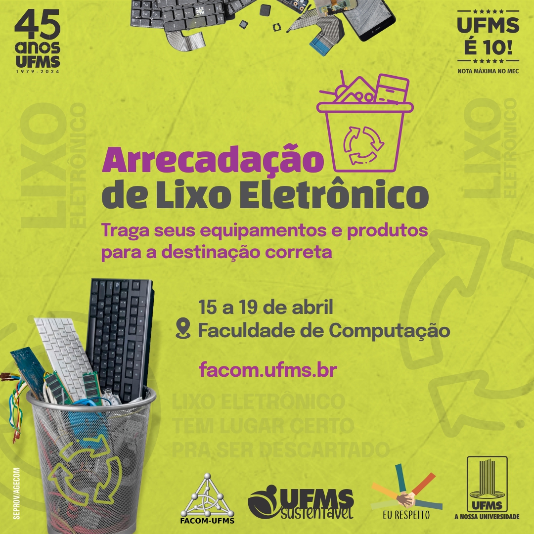 Os aparelhos eletrônicos fazem cada vez mais parte do nosso cotidiano, mas com o avanço da tecnologia, grande parte destes equipamentos se tornam substituíveis em pouco tempo, levantando a questão: o que fazer com o lixo eletrônico? Professores e estudantes da Faculdade de Computação (Facom) se unem na tentativa de auxiliar a população no descarte correto dos materiais eletrônicos com a 4ª Semana de Arrecadação de Lixo Eletrônico, entre os dias 15 e 19 de abril, das 7h às 21h, na Cidade Universitária.