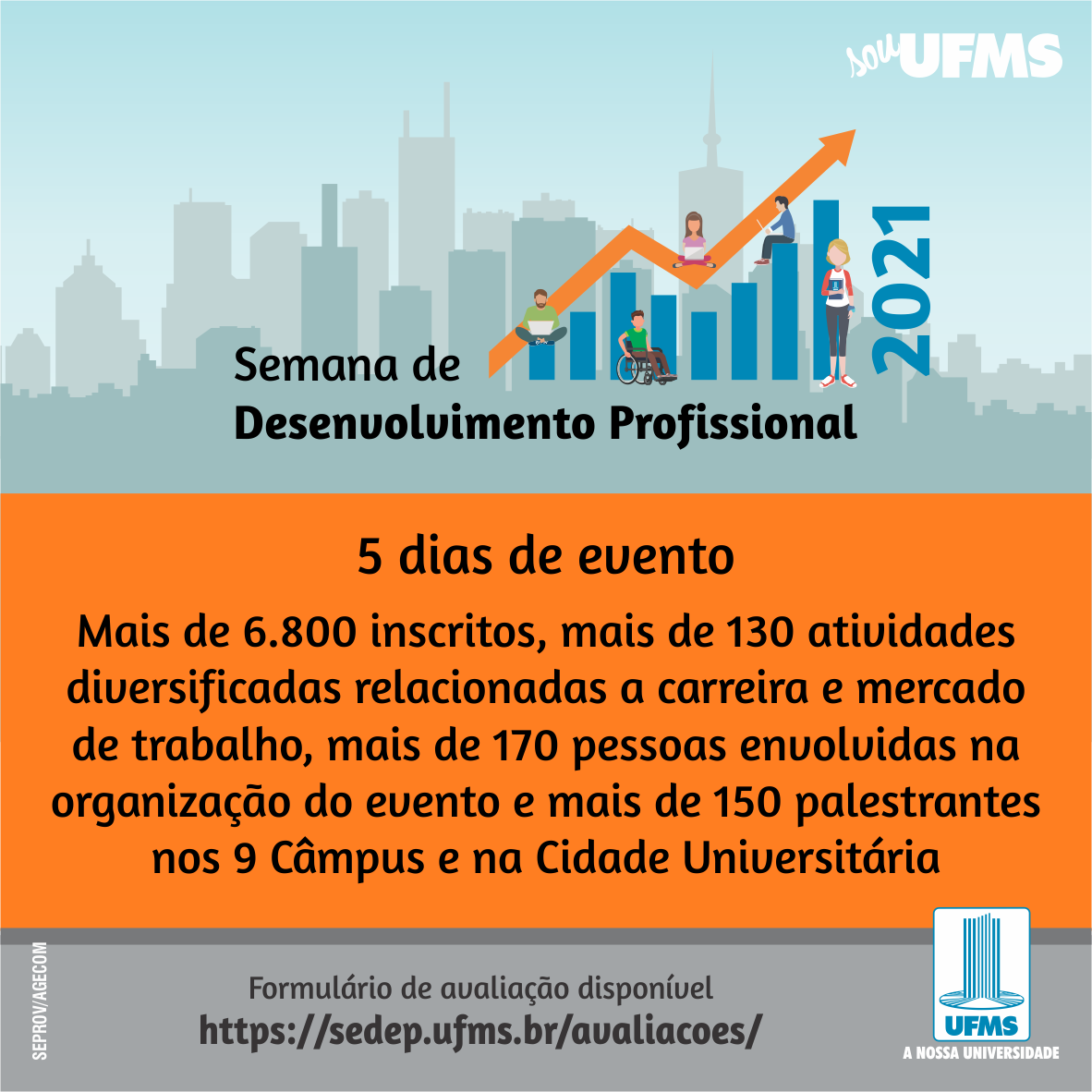 A 5ª edição da Semana de Desenvolvimento Profissional teve 6,8 mil pessoas inscritas em 130 atividades relacionadas a carreira e mercado de trabalho. Foram cinco dias do evento que reuniu 150 palestrantes e envolveu 170 pessoas de todos os nove câmpus, além da Cidade Universitária. Ao término das atividades desta sexta-feira, 6, último dia de evento, está disponível o formulário de avaliação. Para preencher basta clicar aqui.