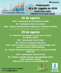 A abertura será no dia 28, no anfiteatro do Corredor Central, com a apresentação do Coro Feminino da UFMS e a palestra “Desenvolvimento Profissional e o Mercado de Trabalho”, com o presidente do Conselho Regional de Administração de Mato Grosso do Sul (CRA-MS), Alex Sandre Rodrigo Cazelli.