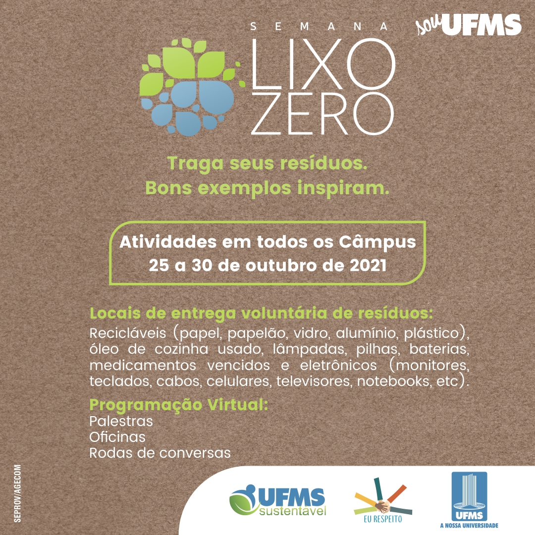 A Semana Lixo Zero é uma ação criada pelo Instituto Lixo Zero Brasil, realizada anualmente em mais de 170 cidades em todo o país, e a UFMS se tornou parceira em 2019, por intermédio da professora Karina Ocampo Righi, da Faculdade de Engenharias, Arquitetura e Urbanismo e Geografia (Faeng). Ela é uma das embaixadoras do Instituto e, nos últimos dois anos, coordenou as atividades da Semana na Cidade Universitária, em Campo Grande.