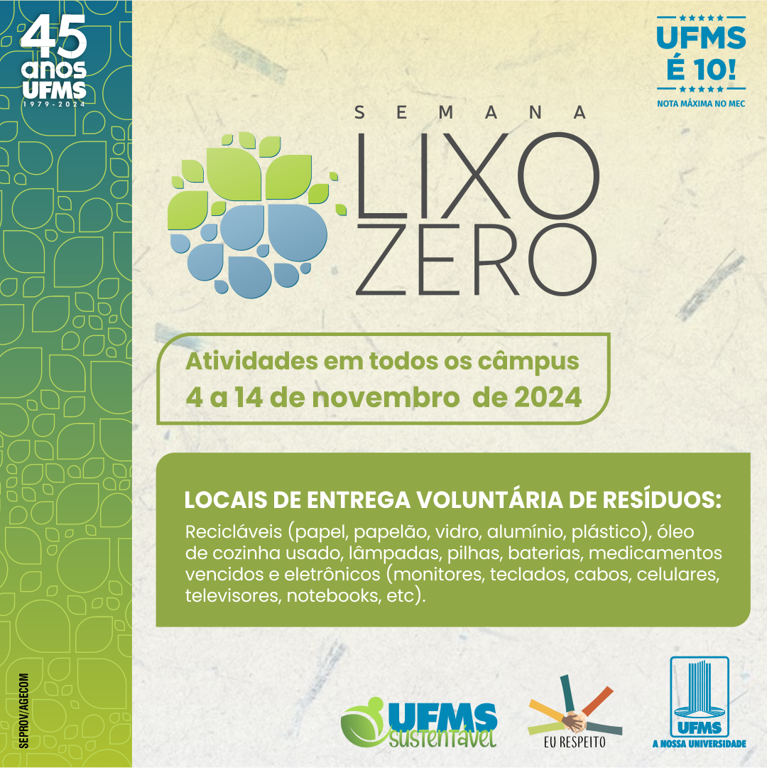 Entre os dias 4 e 14 de novembro, a Universidade promove a Semana Lixo Zero em todos os câmpus. A ação tem como objetivo promover a conscientização sobre a gestão de resíduos, incentivar práticas sustentáveis e engajar a comunidade na redução do desperdício. Serão promovidas diversas atividades, como a coleta de lixo eletrônico, criação de hortas, coleta de tampinhas, plantio de árvores, palestras e exibição de filmes e documentários temáticos sobre sustentabilidade.