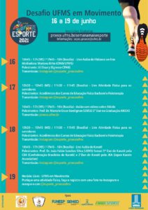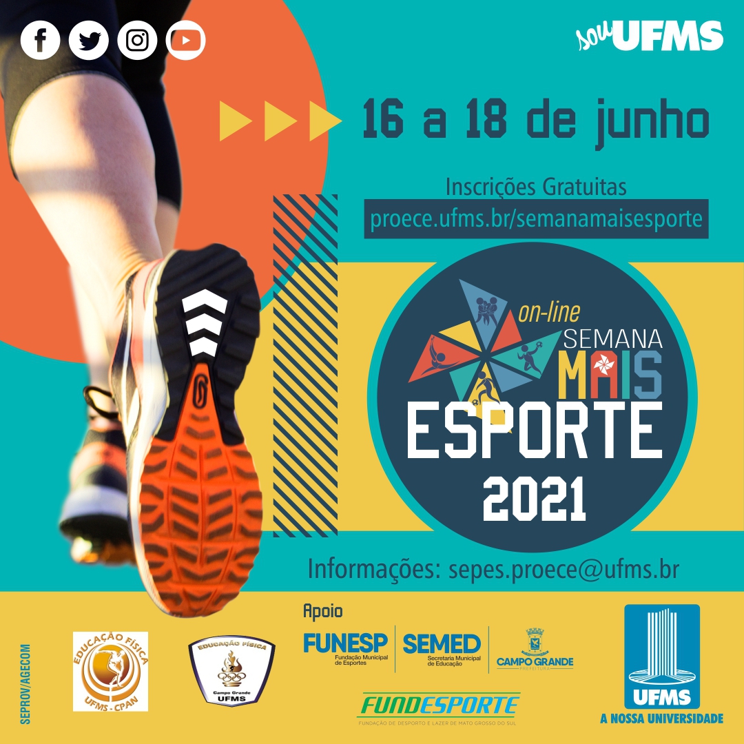 A Semana Mais Esporte chega a sua terceira edição com diversas atividades virtuais voltadas para toda a comunidade. O objetivo é sensibilizar e promover o interesse pela prática de atividade física e esportiva, promovendo a integração entre os estudantes, servidores e professores da UFMS, bem como atletas, estudantes de outras instituições de ensino e profissionais de Educação Física de Mato Grosso do Sul.