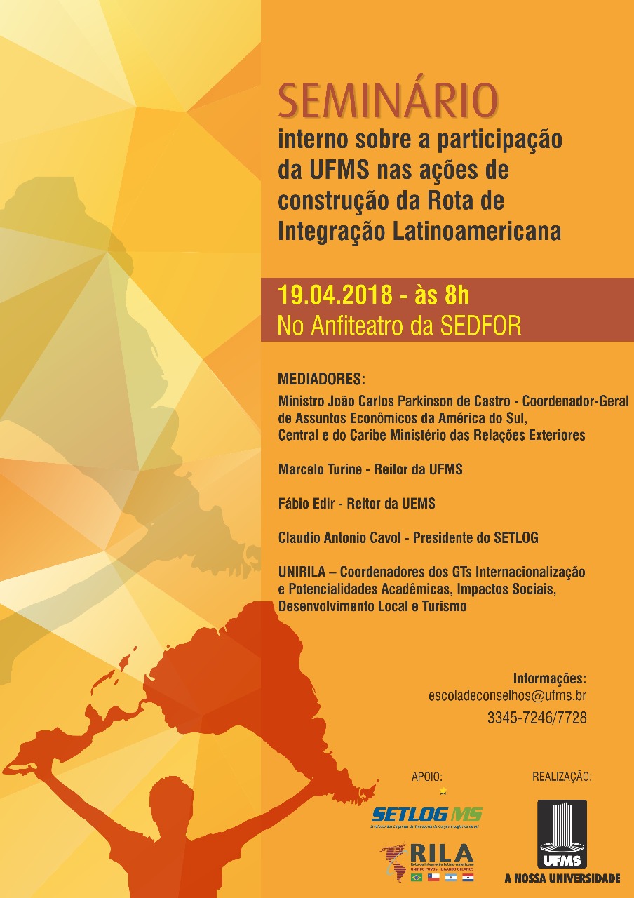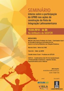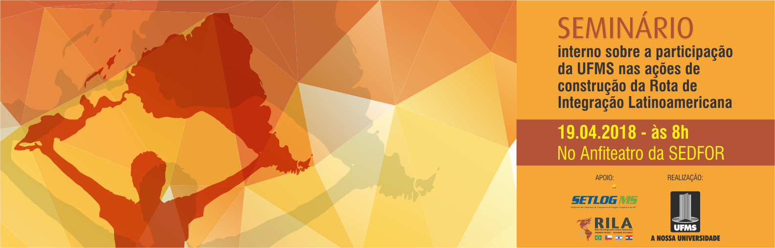 No dia 19 de abril, no auditório da Secretaria Especial de Educação a Distância e Formação de Professores (SEDFOR) será realizado o “Seminário interno sobre a participação da UFMS nas ações de construção da Rota de Integração Latinoamericana”. O evento será a partir das 8h e é voltado a servidores das Pró-Reitorias, direção de Faculdades, Escola, Institutos, Câmpus, Coordenações de Programas de Pós-Graduação e de Extensão, pesquisadores, extensionistas e acadêmicos das diversas áreas.