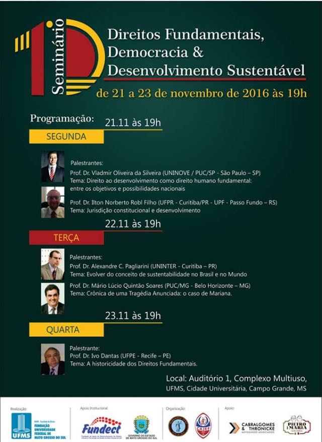 De 21 a 23 de novembro a Faculdade de Direito (Fadir) realiza no Complexo Multiuso o 1º Seminário Direitos Fundamentais, Democracia e Desenvolvimento Sustentável. O evento é voltado a discentes da graduação e pós-graduação da Instituição e as atividades são sempre no período noturno, a partir das 19h.