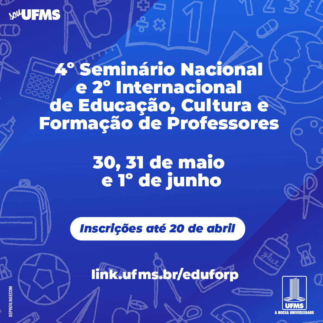 Estão abertas as inscrições para o 4º Seminário Nacional e 2º Internacional de Educação, Cultura e Formação de Professores. Os interessados poderão submeter os trabalhos para o evento, que será realizado entre os dias 30 de maio e 1º de junho.