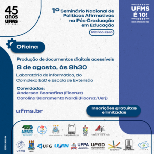 No dia 8 de agosto, das 8h30 às 12h30, o evento também promove uma oficina sobre Produção de documentos digitais acessíveis, com os pesquisadores da Fiocruz Anderson Boanafina e Carolina Sacramento Nardi, também professora da UERJ. O encontro será no Laboratório de Informática do Complexo EaD e Escola de Extensão, localizado no setor 2 da Cidade Universitária. As inscrições são gratuitas, com vagas limitadas.