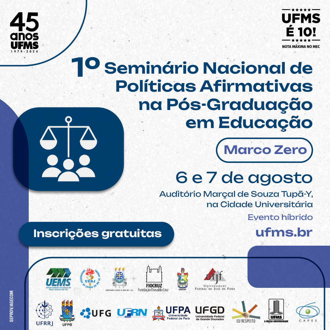 Estudantes de graduação e pós-graduação, professores, técnicos-administrativos e pesquisadores de instituições de ensino superior e membros da comunidade externa podem se inscrever para participar do 1º Seminário Nacional de Políticas Públicas Afirmativas na Pós-Graduação em Educação – Marco Zero. O evento será realizado em formato presencial e on-line nos dias 6 e 7 de agosto, no Auditório Marçal de Souza Tupã-Y, na Cidade Universitária.