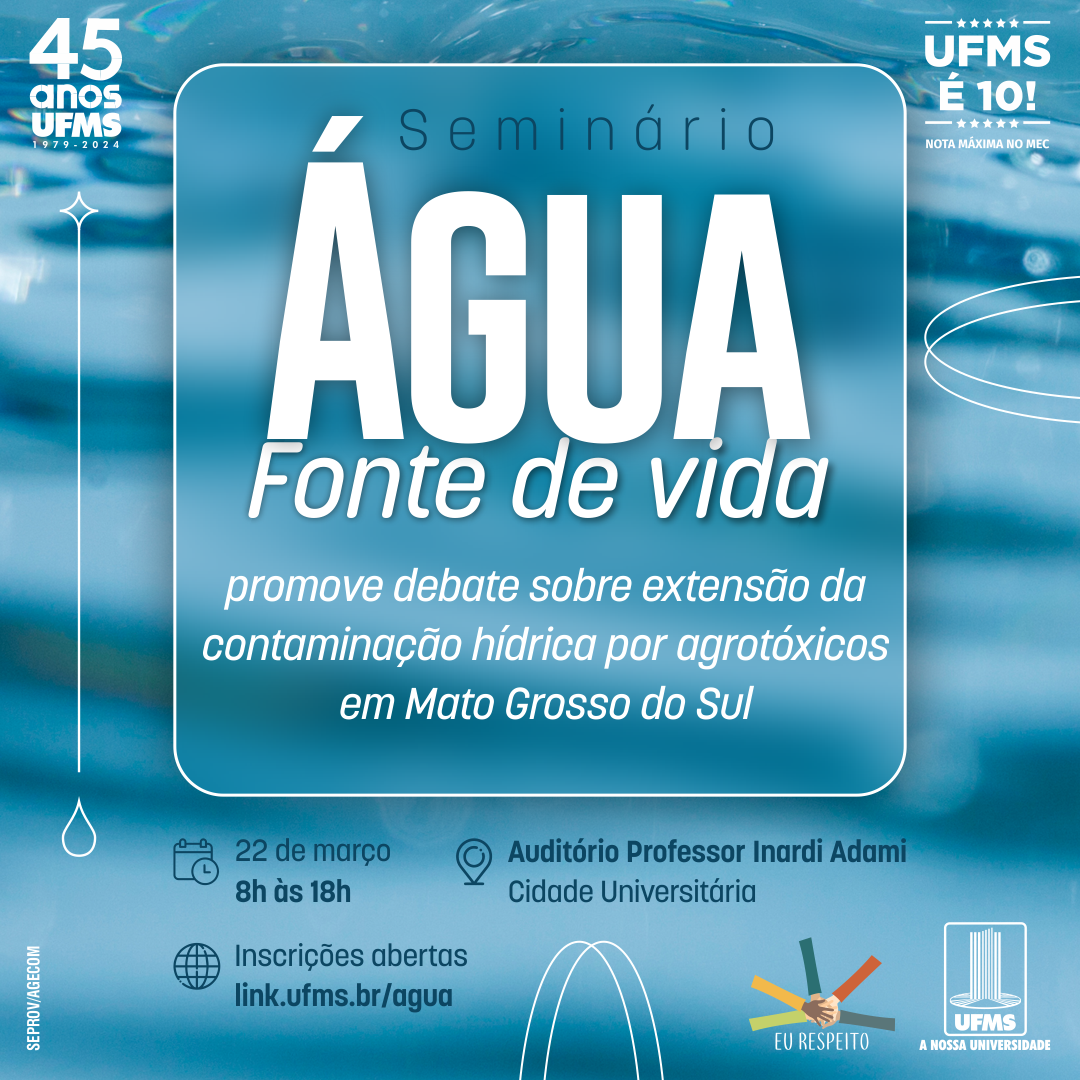 A contaminação por agrotóxicos em Mato Grosso do Sul é tema do seminário Água: Fonte de Vida, realizado nesta sexta-feira, 22, na Cidade Universitária. O encontro organizado pela UFMS, em parceria com a Superintendência-Geral de Atenção à Saúde do Estado e a Superintendência do Instituto Brasileiro do Meio-Ambiente e dos Recursos Naturais Renováveis, é aberto ao público e as inscrições devem ser feitas no formulário on-line até quinta-feira, 21. O seminário será presencial, no Auditório Professor Inardi Adami, também conhecido como LAC, das 8h às 18h.