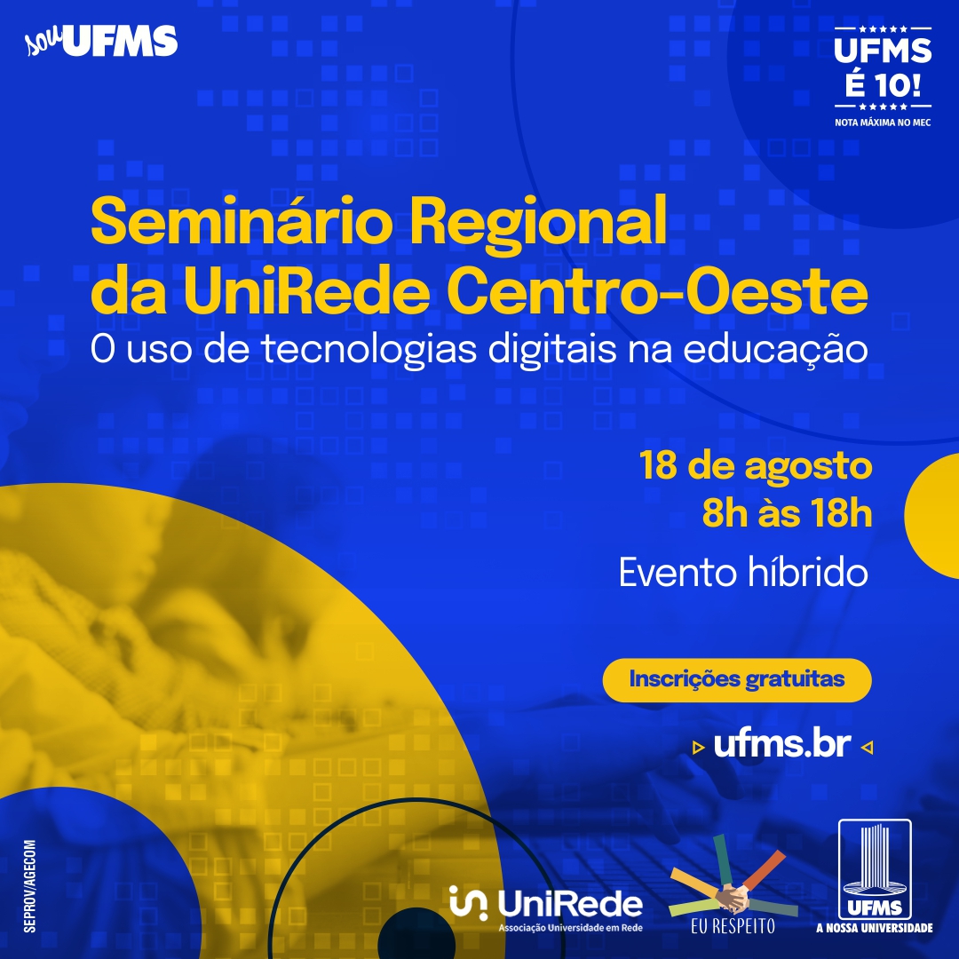 No dia 18 de agosto, das 8h às 16h, a UFMS e a Associação Universidade em Rede (UniRede) promovem o Seminário Regional da UniRede Centro-Oeste, com o tema Educação a Distância: políticas públicas, gestão, governança e qualidade.