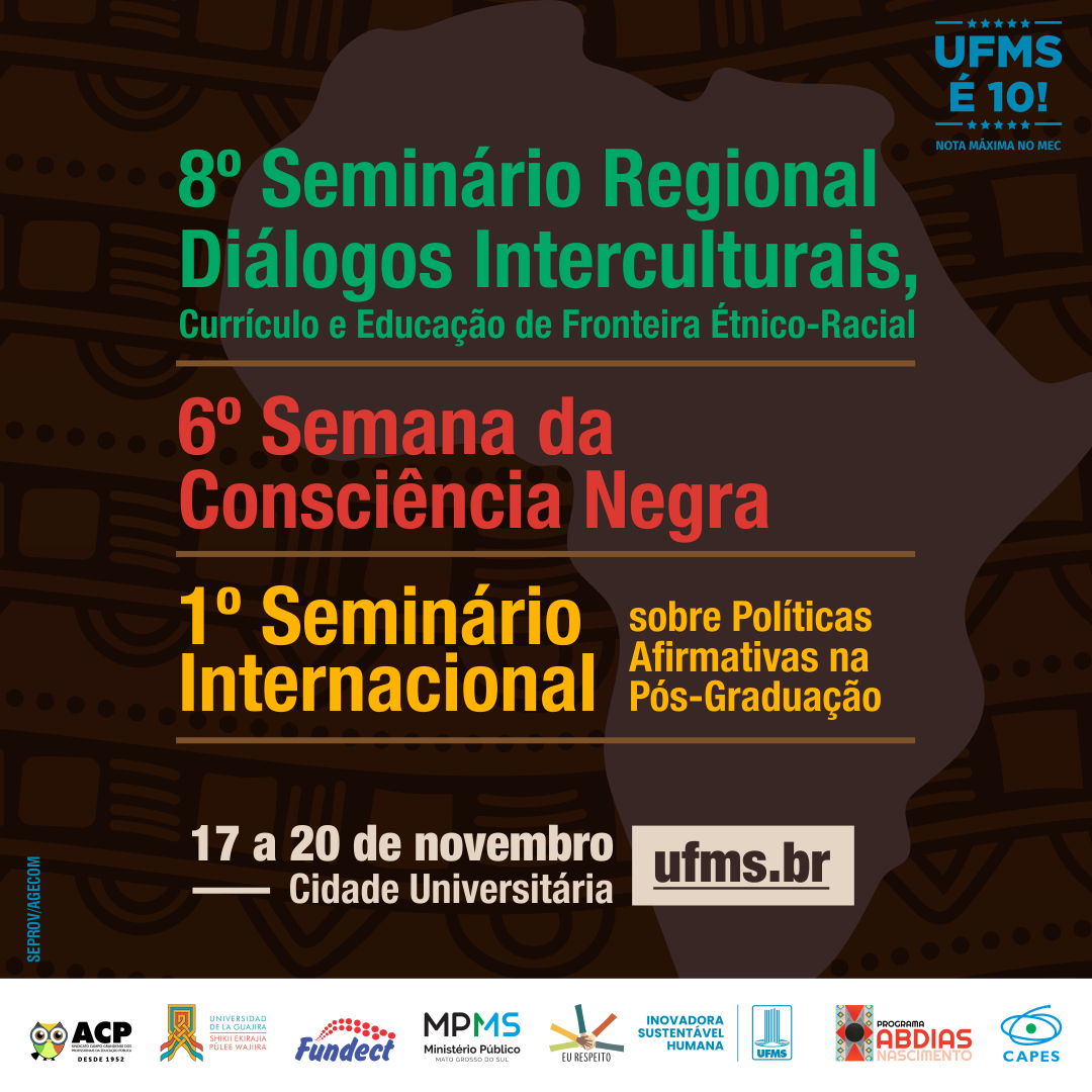 De 17 a 20 de novembro, serão realizados o 8º Seminário Regional: Diálogos Interculturais, Currículo e Educação de Fronteira Étnico-Racial, a 6ª Semana da Consciência Negra e o 1º Seminário Internacional sobre Políticas Afirmativas na Pós-Graduação. A programação será híbrida, com atividades on-line e também presenciais na Cidade Universitária e em outros locais da cidade. A participação é aberta a todos os interessados e as inscrições gratuitas podem ser realizadas aqui.