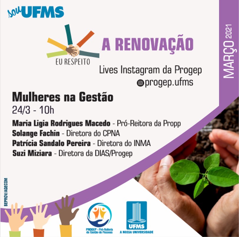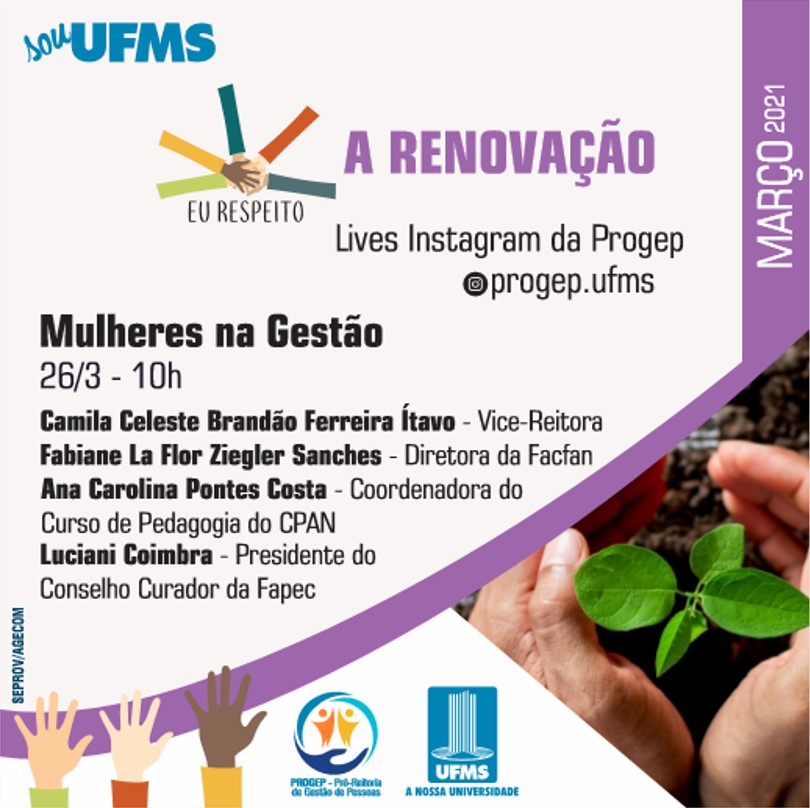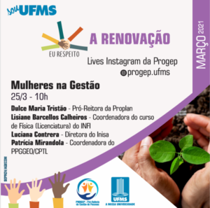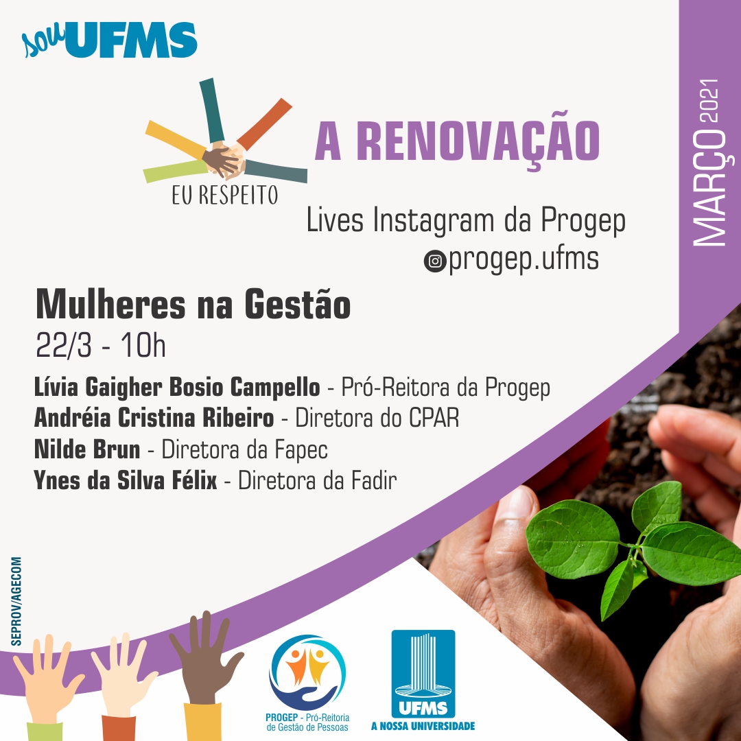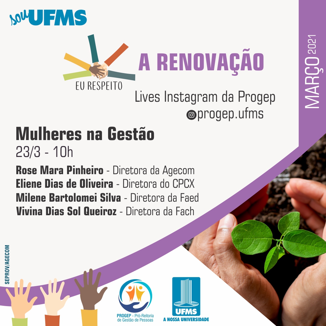 As transmissões serão de 22 a 26 de março, sempre às 10h, pelo Instagram da Progep. No dia 26, a vice-reitora Camila Ítavo, além de mediar a última roda de conversa, fará o lançamento do programa Sou Mulher UFMS. “A UFMS está atenta aos desafios e aos vários papeis que a mulher enfrenta hoje em dia. A busca é contínua para um ambiente propício para que a mulher seja o que ela quiser, inclusive gestora. Esse é o nosso desejo”, declara Camila.