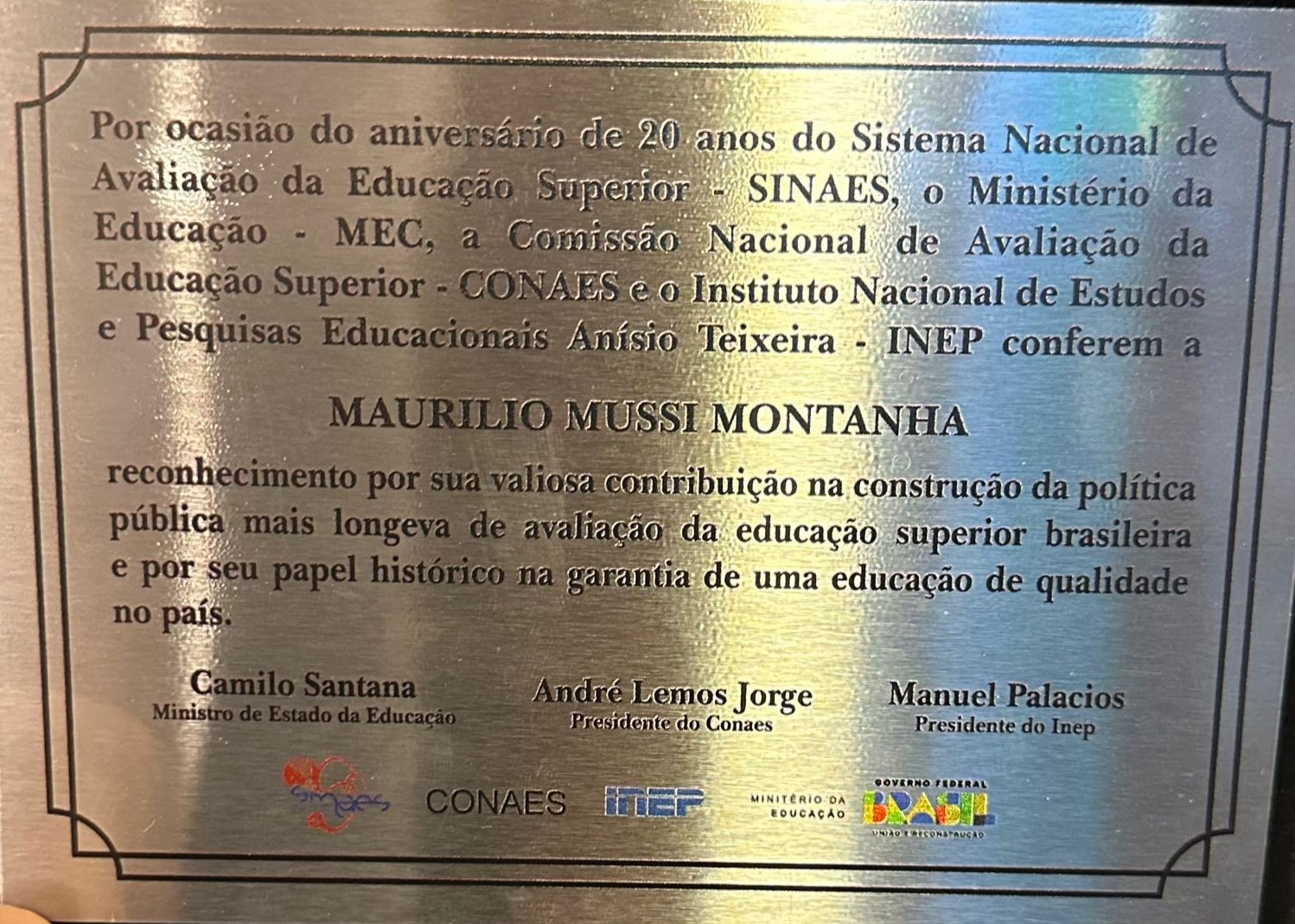 O servidor da Agência de Tecnologia da Informação e Comunicação Maurílio Mussi Montanha recebeu do Ministério da Educação (MEC), do Instituto Nacional de Estudos e Pesquisas Educacionais Anísio Teixeira (Inep) e da Comissão Nacional de Avaliação da Educação Superior (Conaes) uma homenagem por sua contribuição ao Sistema Nacional de Avaliação da Educação Superior (Sinaes). A placa foi entregue pelo ministro Camilo Santana e pelos presidentes do Inep, Manuel Palacios, e da Conaes, André Lemos Jorge, nesta quinta-feira, 25, no seminário que celebra os 20 anos do sistema.