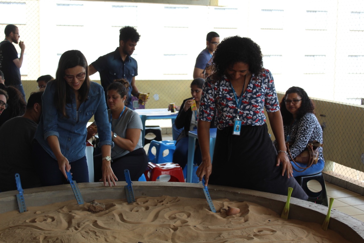 No final da visita, os servidores puderam brincar de ser arqueólogos. No espaço há uma grande caixa de areia com pás para que os visitantes possam ter a experiência de descobrir algum fragmento arqueológico.