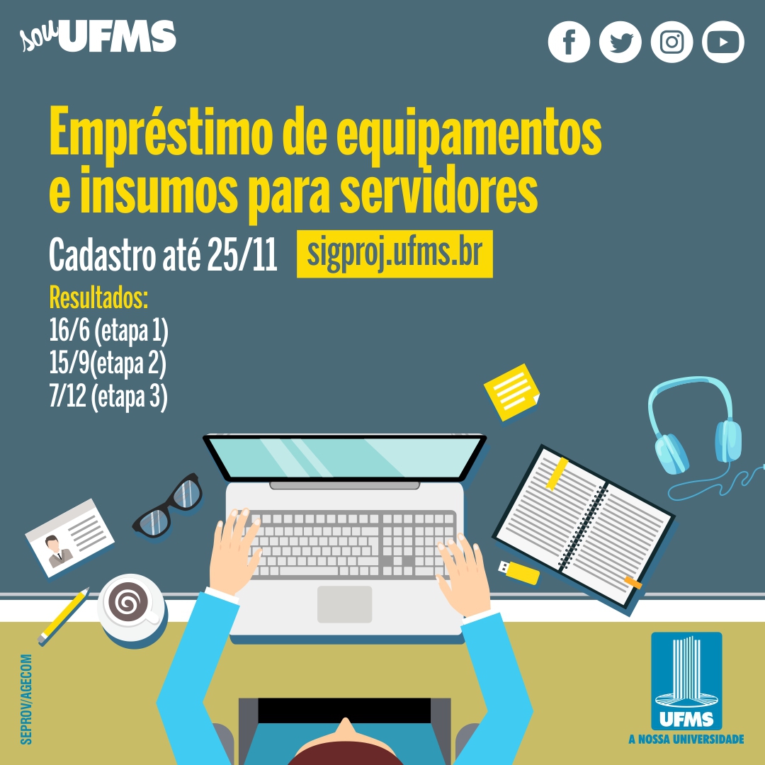 “Neste momento, no qual muitas ações estão acontecendo de maneira remota, alguns servidores encontram-se em teletrabalho e podem precisar de mais este apoio institucional da UFMS para subsidiar a realização de suas atividades”, comenta. De acordo com o edital, a compra e o empréstimo dependem da disponibilidade de orçamento da Universidade e do Ministério da Educação. As inscrições acontecem em fluxo contínuo até 25 de novembro no Sigproj e os resultados serão divulgados em etapas, obedecendo a ordem de inscrição. Assim, a previsão é divulgar o resultado da avaliação da primeira etapa em 16 de junho (inscritos até 4 de junho); da segunda em 15 de setembro (inscritos até 3 de setembro); e da terceira em 7 de dezembro (inscritos até 25 de novembro).