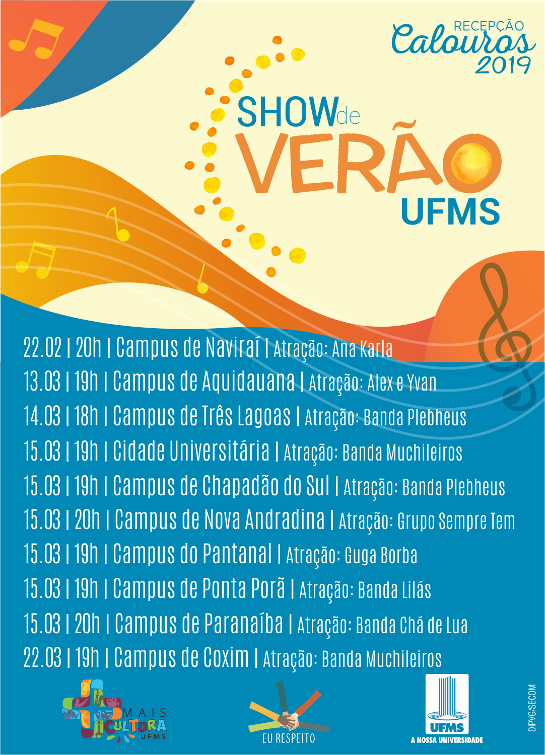 A programação começa amanhã (22) em Naviraí. A artista Ana Karla se apresenta no campus a partir das 20h. No dia 13 de março Alex e Ivan se apresentarão em frente à unidade dois do campus de Aquidauana a partir das 19h e no dia 14, a partir das 18h, o campus de Três Lagoas receberá a banda Plebheus.