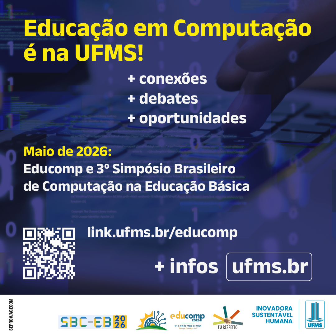Entre 4 e 8 de maio, a UFMS de Campo Grande será sede de dois eventos nacionais: o 6º Simpósio Brasileiro de Educação em Camputação (Educomp) e o 3º Simpósio Brasileiro de Computação na Educação Básica (SBC-EB 2026), com realização da Sociedade Brasileira de Computação (SBC) em parceria com a UFMS. As inscrições podem ser feitas aqui.