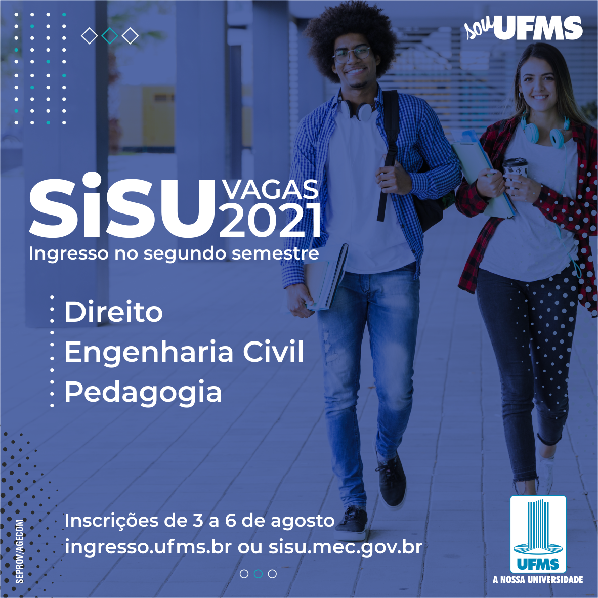 A UFMS oferece 64 vagas para ingresso neste segundo semestre de 2021 em três cursos da Cidade Universitária: Direito, Pedagogia e Engenharia Civil. “Reservamos 40% das vagas para este segundo processo seletivo do Sisu. Serão 24 para o curso de Direito, 20 para Pedagogia e 20 para Engenharia Civil. Todos oferecidos pela UFMS em Campo Grande”, explica o pró-reitor de Graduação (Prograd) Cristiano Argemon.