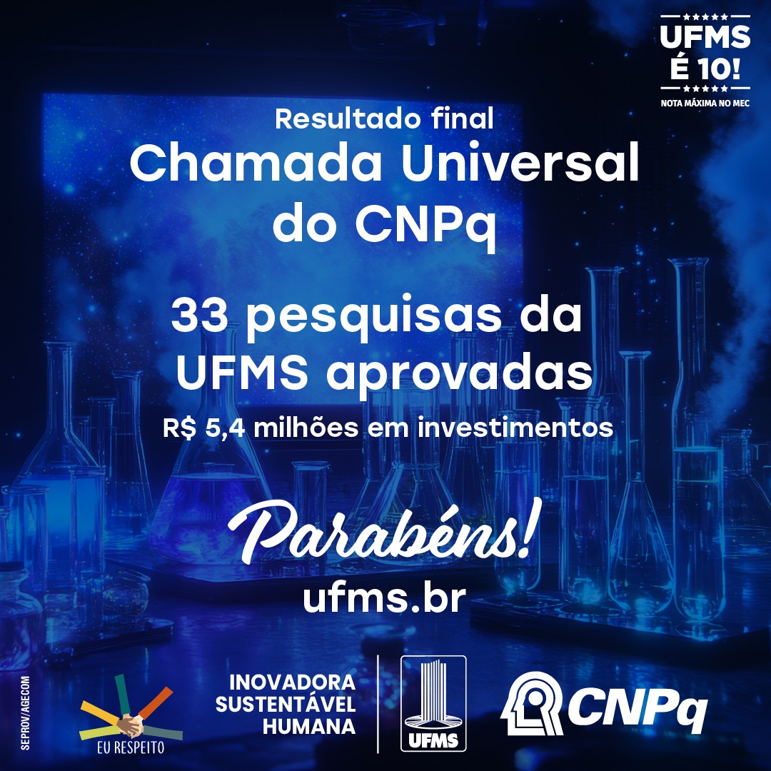O resultado final da Chamada Universal de 2024 do Conselho Nacional de Desenvolvimento Científico e Tecnológico (CNPq) trouxe mais seis propostas da UFMS aprovadas, além das 27 inicialmente contempladas no resultado preliminar. Os projetos de pesquisadores da Universidade de diversas áreas do conhecimento devem receber, ao todo, até R$5,4 milhões ao longo de três anos.