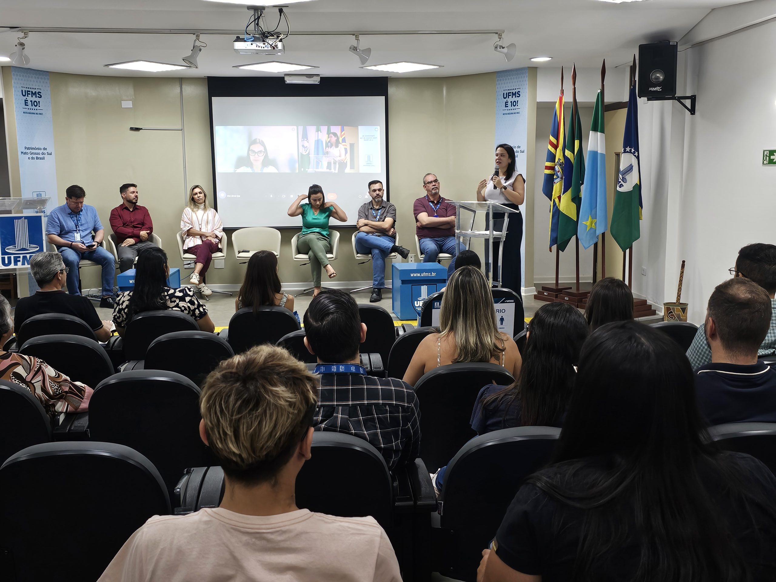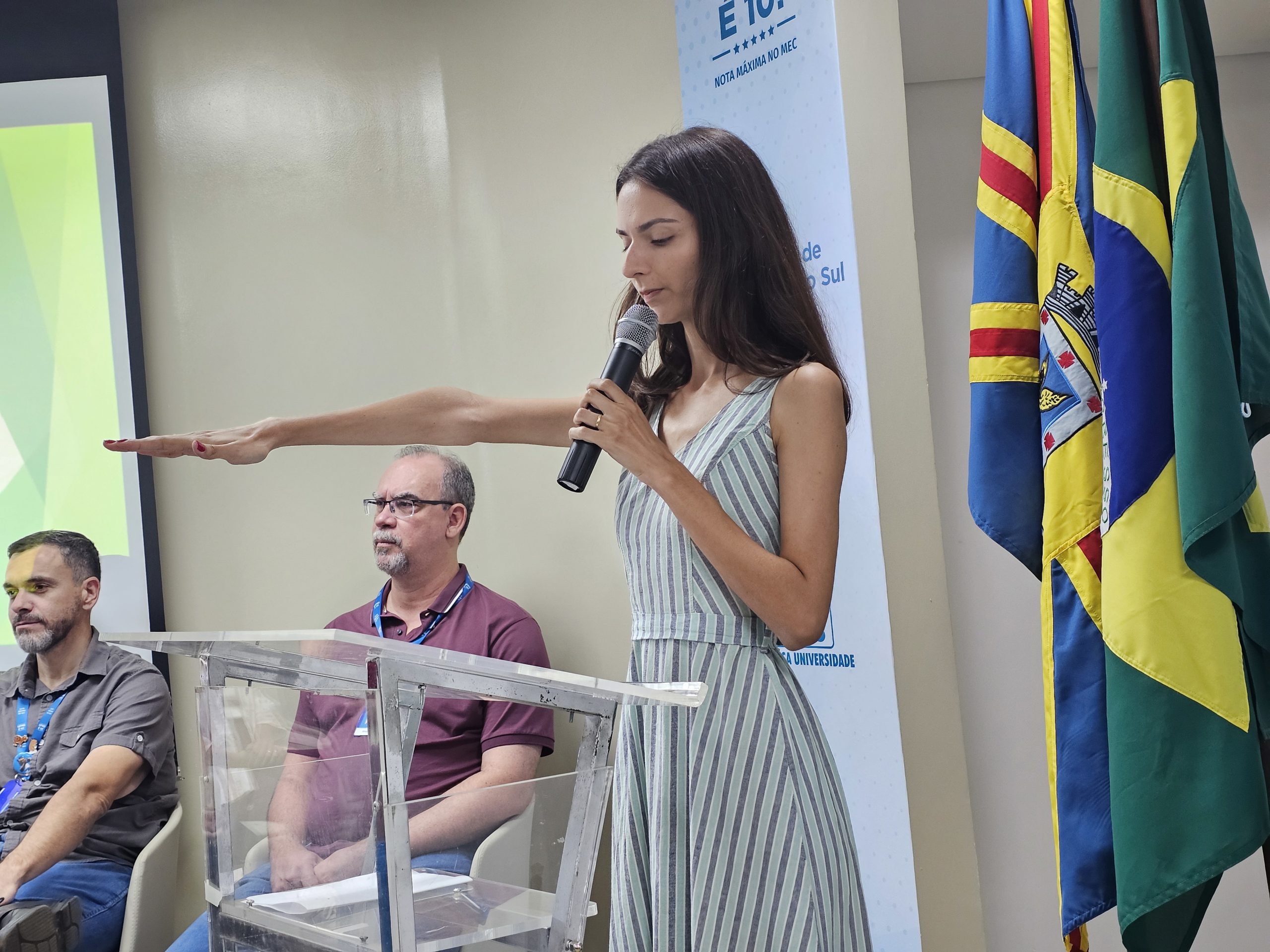 Em seu discurso, a reitora Camila Ítavo deu as boas-vindas e apresentou os gestores e servidores presentes na solenidade. “A Universidade é esse ambiente que a gente vem trabalhar, mas também encontra uma família, a gente encontra o amor, parceiros de vida. A gente fica muito feliz e espera que tenha cada vez mais um ambiente como esse. […] Vocês vieram porque vocês decidiram ser Universidade. Não se esqueçam nunca desse sonho, desse desafio, da motivação que nasceu no coração de vocês.