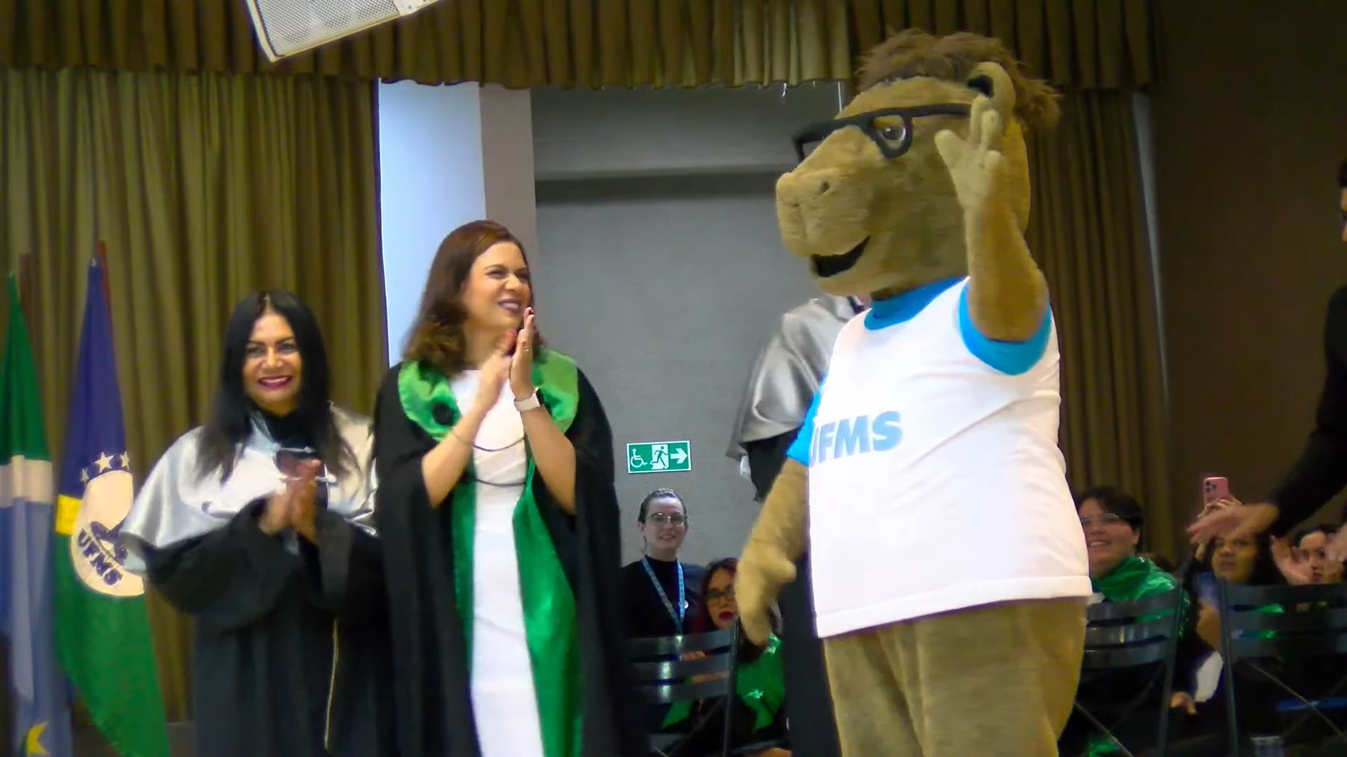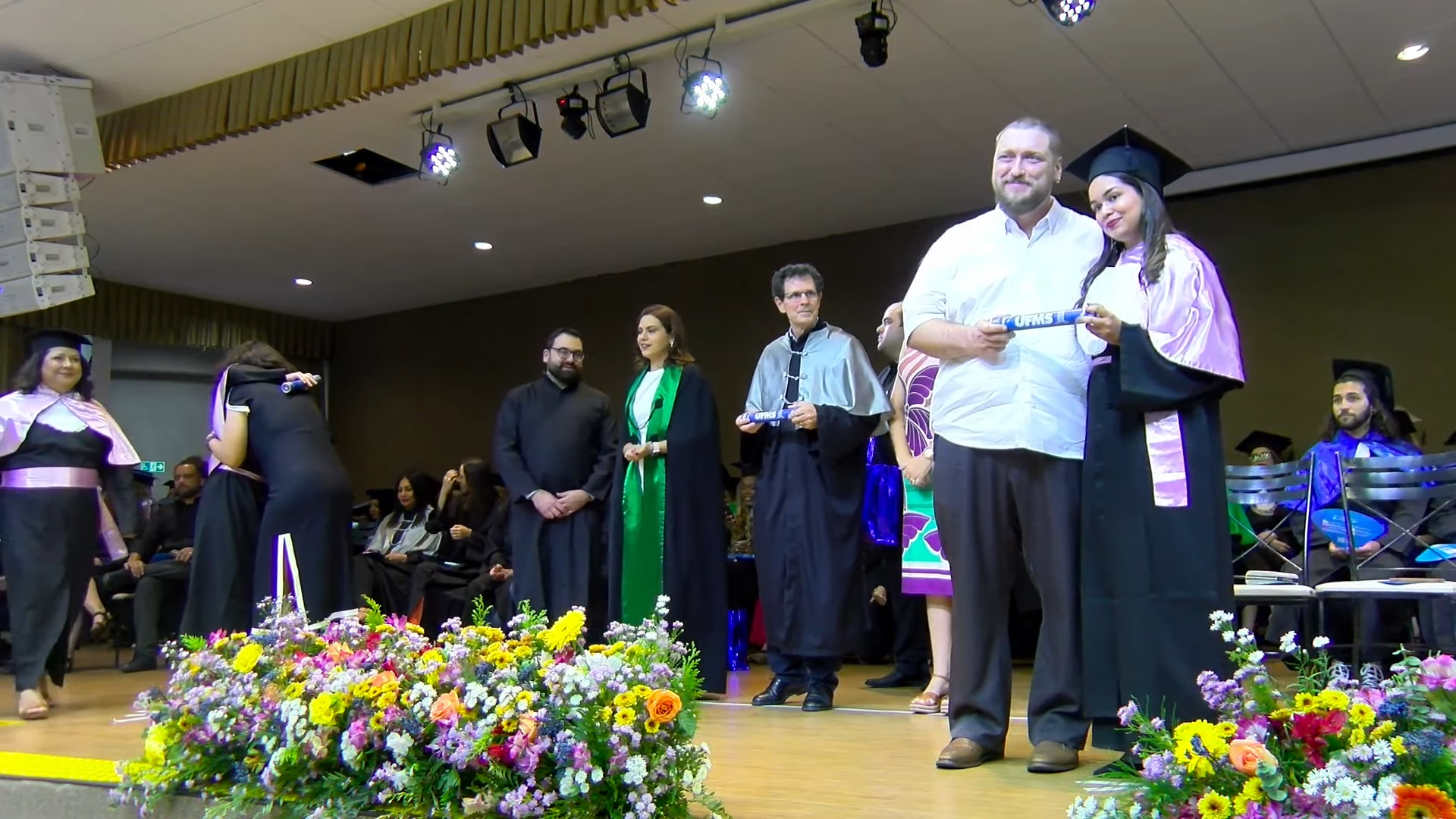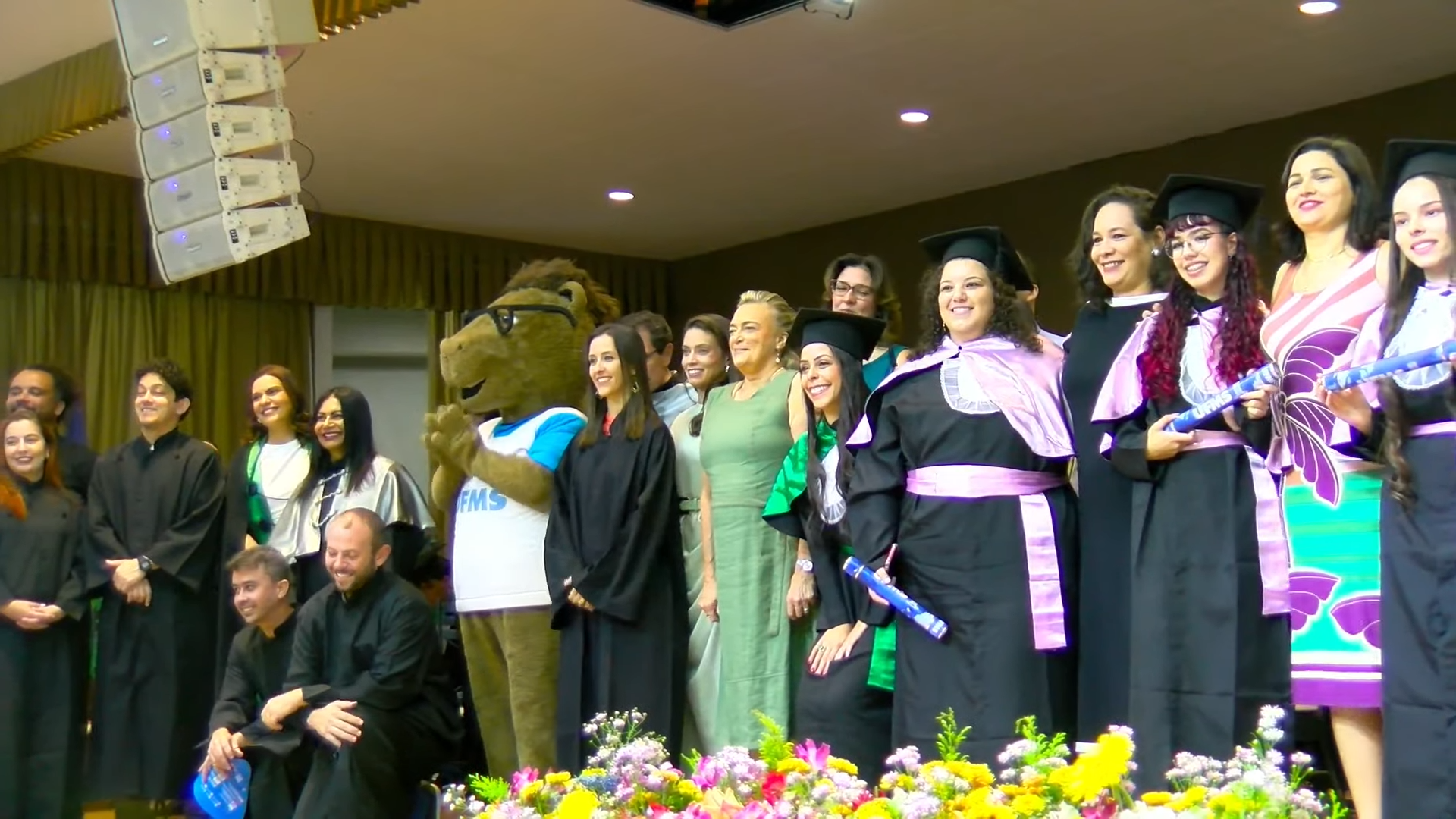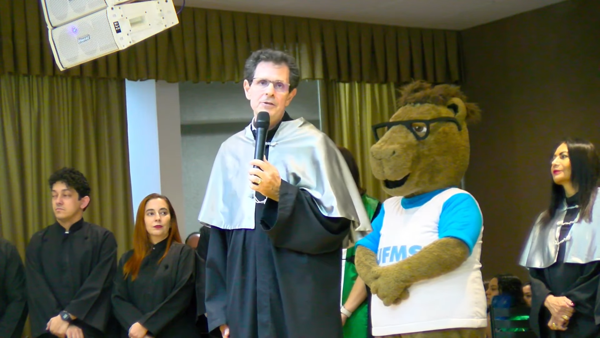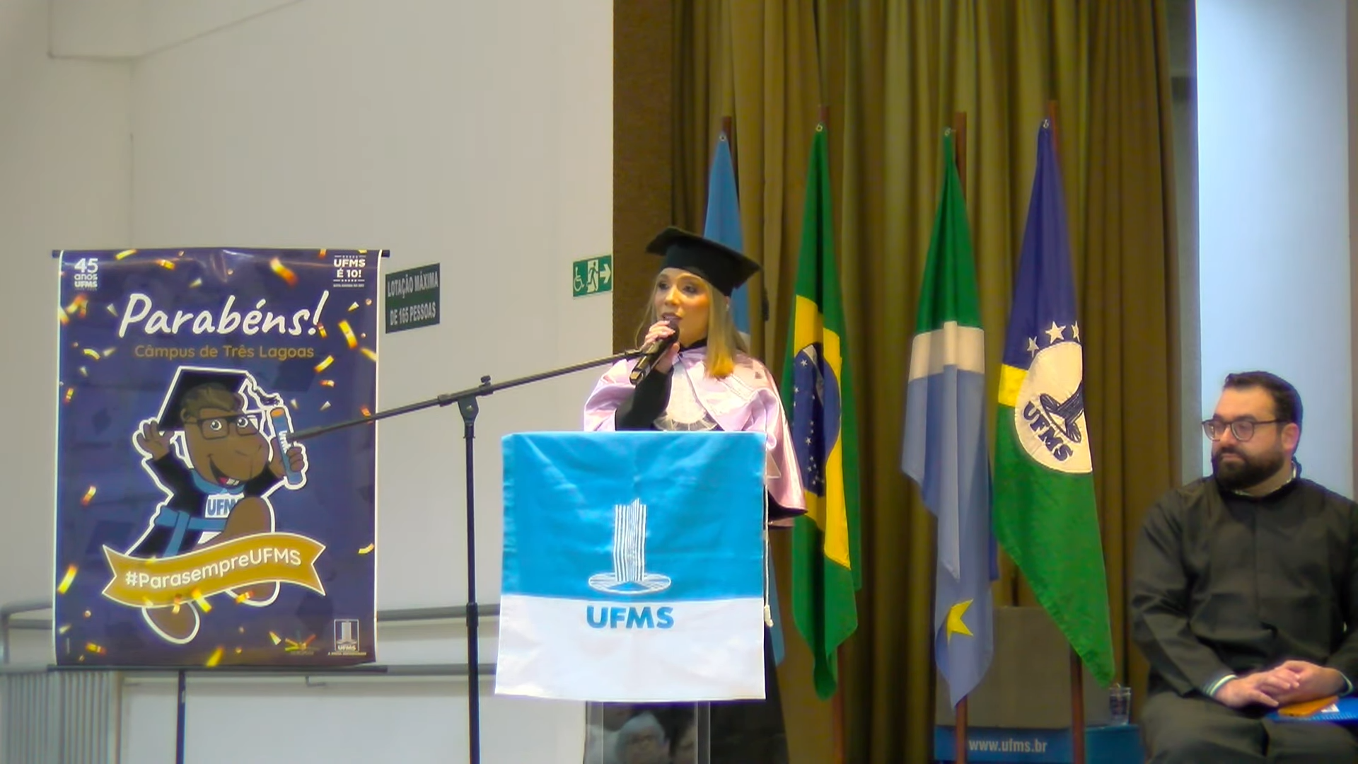 A sessão solene foi presidida pelo vice-reitor Albert Schiaveto, que fez votos de sucesso para a jornada profissional de cada egresso. “As estrelas desta tarde vão voar, e muito. Nossa missão como Universidade é formar líderes. Além de cidadãos conscientes, profissionais, nós formamos líderes. Parafraseando Martin Luther King, ativista norte-americano, ‘eu não sou quem eu gostaria de ser’, talvez vocês possam dizer isso. ‘Eu não sou quem eu poderia ser’ e, ainda, ‘eu não sou quem eu deveria ser’, mas graças à UFMS ‘eu não sou mais quem eu era’. Agora, vocês são os profissionais que podem fazer toda a diferença aonde quer que estejam. O futuro tem muitos nomes: para os fracos é o inalcançável, para os temerosos é o desconhecido. Mas para os valentes, para os corajosos, o futuro é a oportunidade’, motivou.