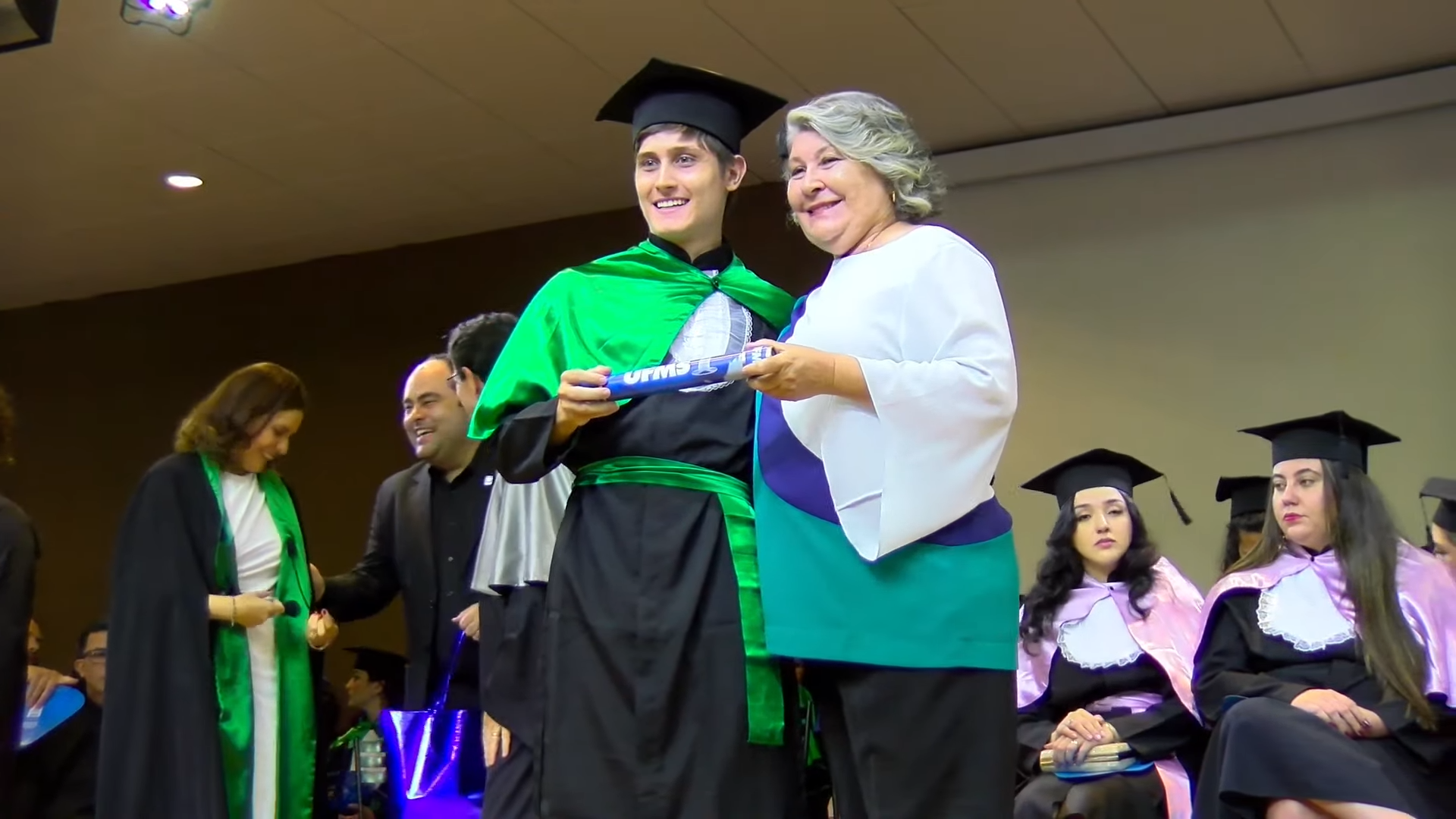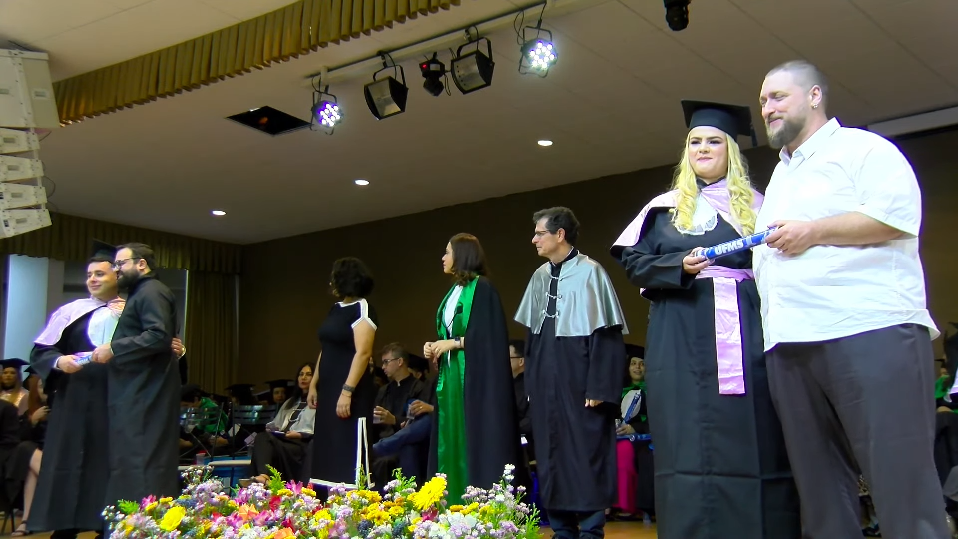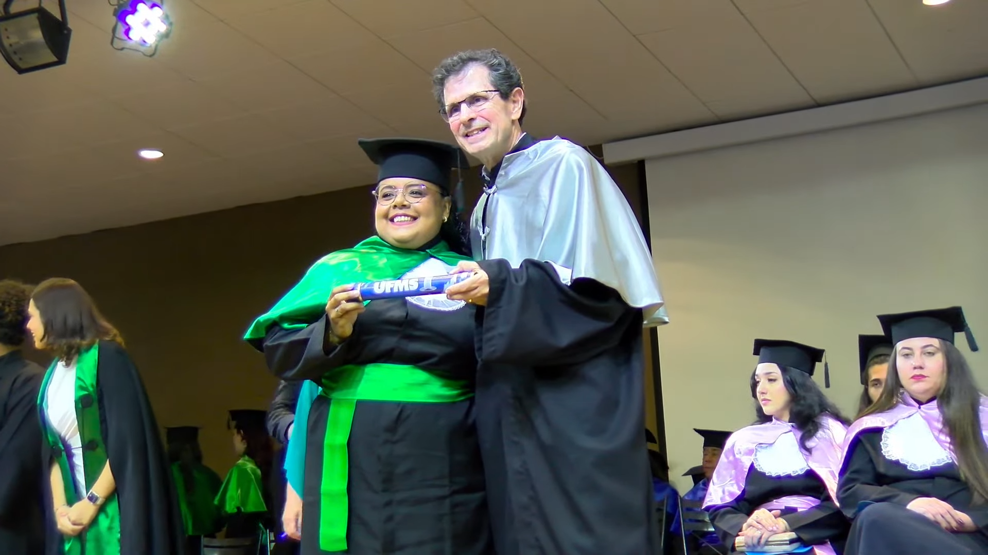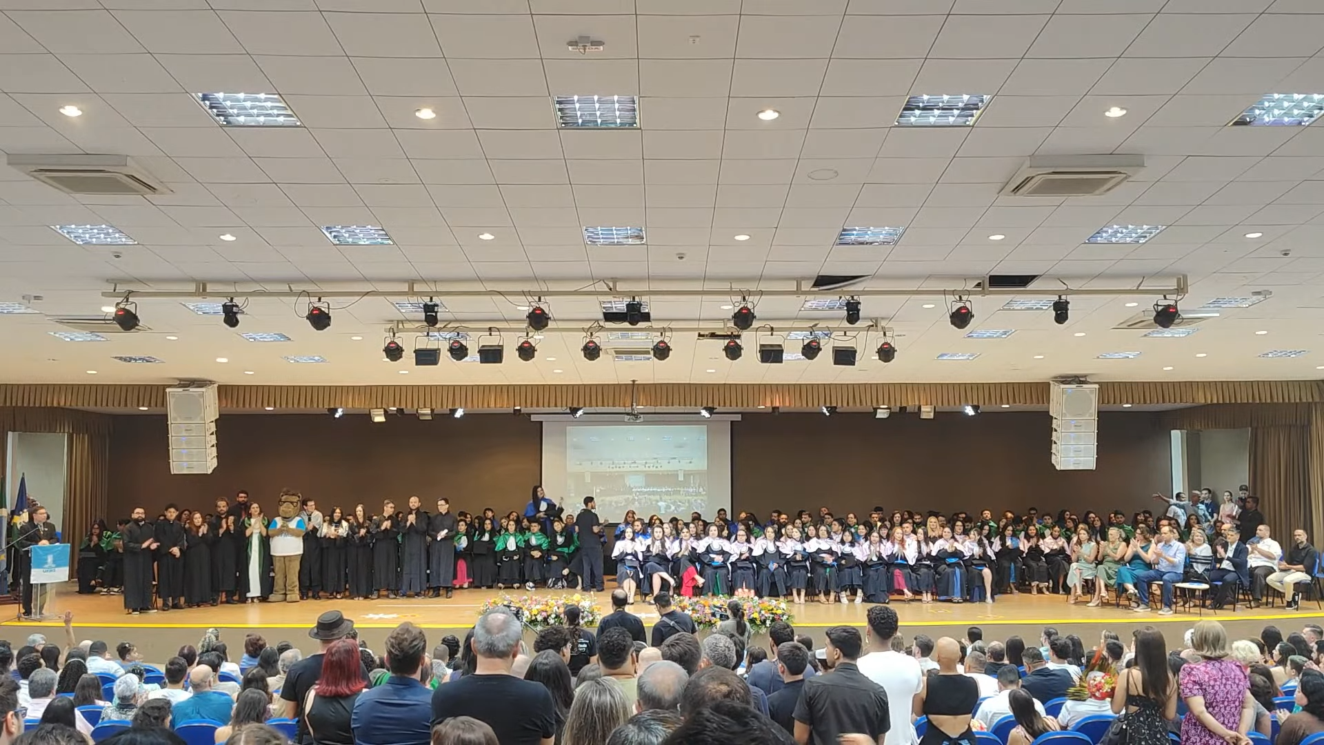 A sessão solene foi presidida pelo vice-reitor Albert Schiaveto, que fez votos de sucesso para a jornada profissional de cada egresso. “As estrelas desta tarde vão voar, e muito. Nossa missão como Universidade é formar líderes. Além de cidadãos conscientes, profissionais, nós formamos líderes. Parafraseando Martin Luther King, ativista norte-americano, ‘eu não sou quem eu gostaria de ser’, talvez vocês possam dizer isso. ‘Eu não sou quem eu poderia ser’ e, ainda, ‘eu não sou quem eu deveria ser’, mas graças à UFMS ‘eu não sou mais quem eu era’. Agora, vocês são os profissionais que podem fazer toda a diferença aonde quer que estejam. O futuro tem muitos nomes: para os fracos é o inalcançável, para os temerosos é o desconhecido. Mas para os valentes, para os corajosos, o futuro é a oportunidade’, motivou.