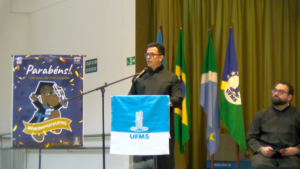 Já o paraninfo da turma de Matemática, professor Fernando Pereira de Souza, também representando todos os servidores homenageados, falou em tom de alegria e satisfação. “Hoje é um dia de celebração. Muitas vezes, enxergamos apenas como a formatura de um filho, um neto, um amigo, mas vale a pena refletir o que esse esse dia realmente representa. Ele simboliza um percurso intenso, repleto de desafios, escolhas e esperanças, vivido ao longo dos anos na UFMS. Como professor de Matemática, não sou muito bom com as palavras, então vamos aos números: foram 136 semanas durante quatro anos. Se considerarmos as aulas de segunda a sexta-feira, foram 680 dias. Vindo, voltando, participando de aulas, palestras. Só de aulas, foram no mínimo 2.700 horas. Os cursos aqui representados aparecem seguindo caminhos diferentes, mas, apesar das diferenças entre as áreas, todos aqui foram formados para o mesmo desafio: cuidar da vida e transformar a sociedade por meio do conhecimento”, frisou.