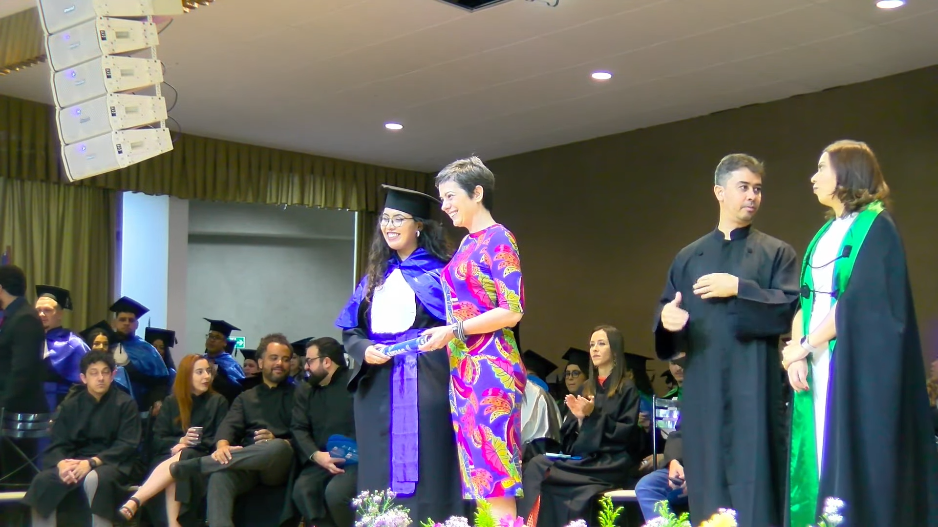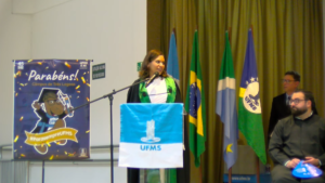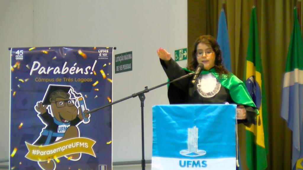 A diretora do CPTL, Larissa Barcelos, encorajou os concluintes em seu discurso. “Que orgulho formar, entregar para a sociedade, 166 profissionais. É um trabalho árduo, mas que, quando nós vivenciamos esse momento, vemos esse auditório tão cheio, vale muito a pena. Nós sabemos que estamos no caminho certo. Para os novos profissionais, eu queria trazer alguns pontos de reflexão. Sendo a UFMS a alma mater de vocês, nesse fim de ciclo, queria pedir para que vocês sejam éticos, no desenvolvimento da profissão que vocês escolheram, na carreira, na vida. Segundo pedido, que honrem os valores que vocês trazem de suas famílias e os valores que cultivam dentro de vocês mesmos, por onde quer que passarem. Ser profissional é uma experiência desafiadora, e o nosso dia a dia tem que ser de resiliência, de ética e de muita responsabilidade. Por fim, tenham sempre coragem de fazer o diferente, de fazer o que é melhor, de fazer aquilo que vocês entendem que vai ser bom”, disse.