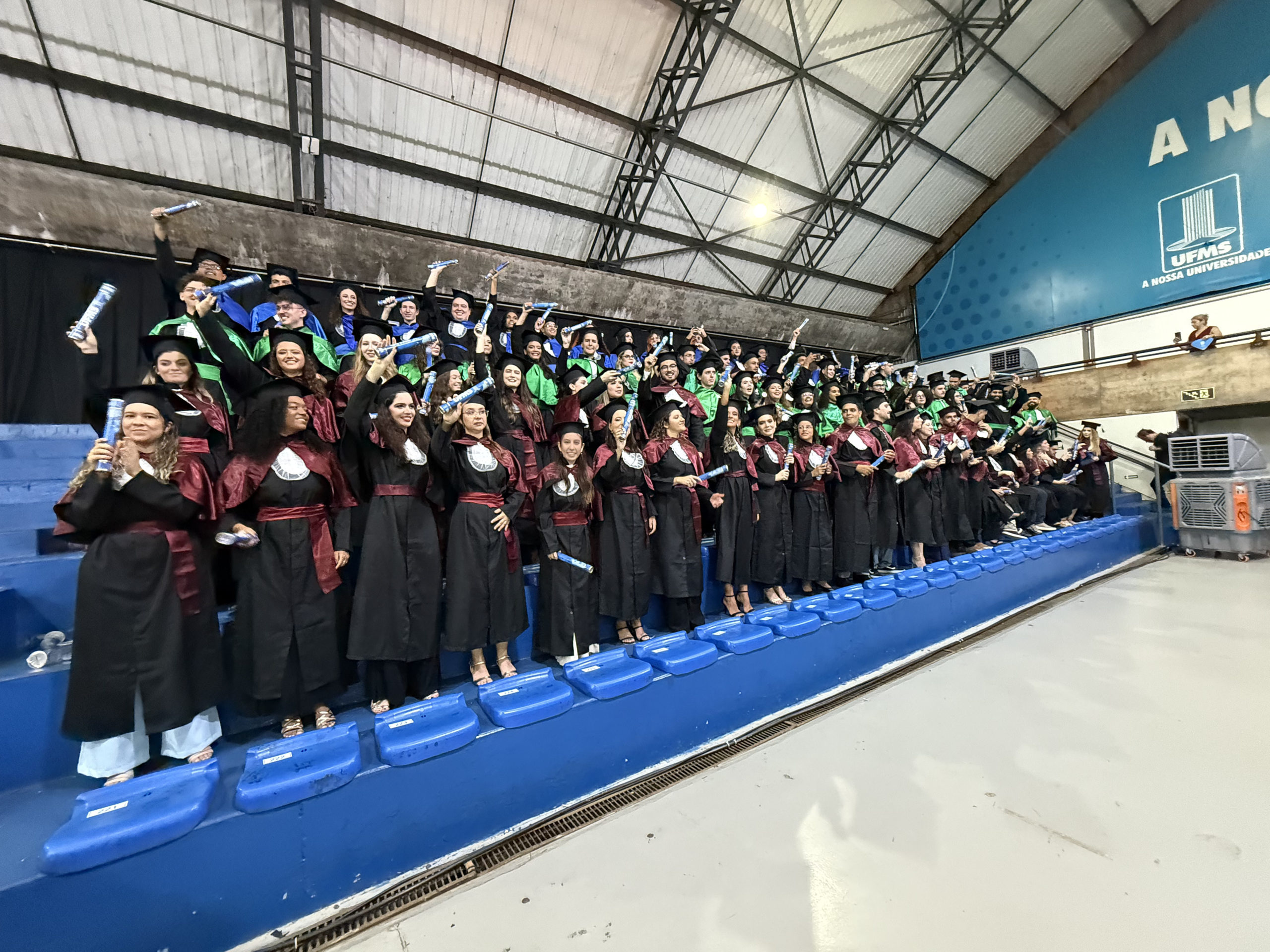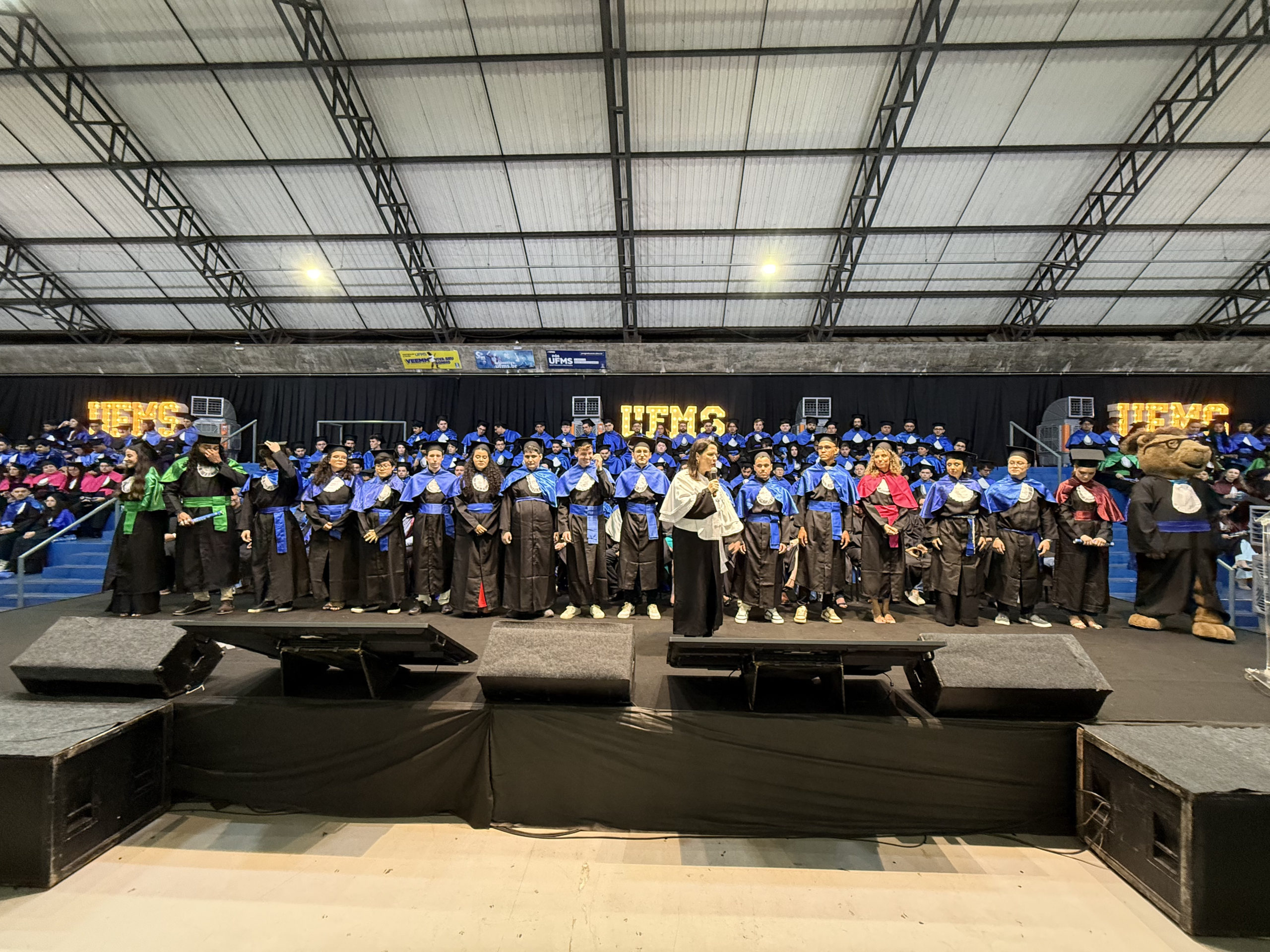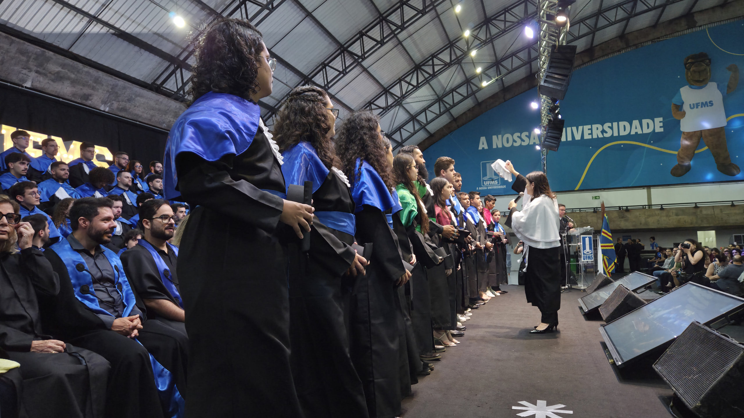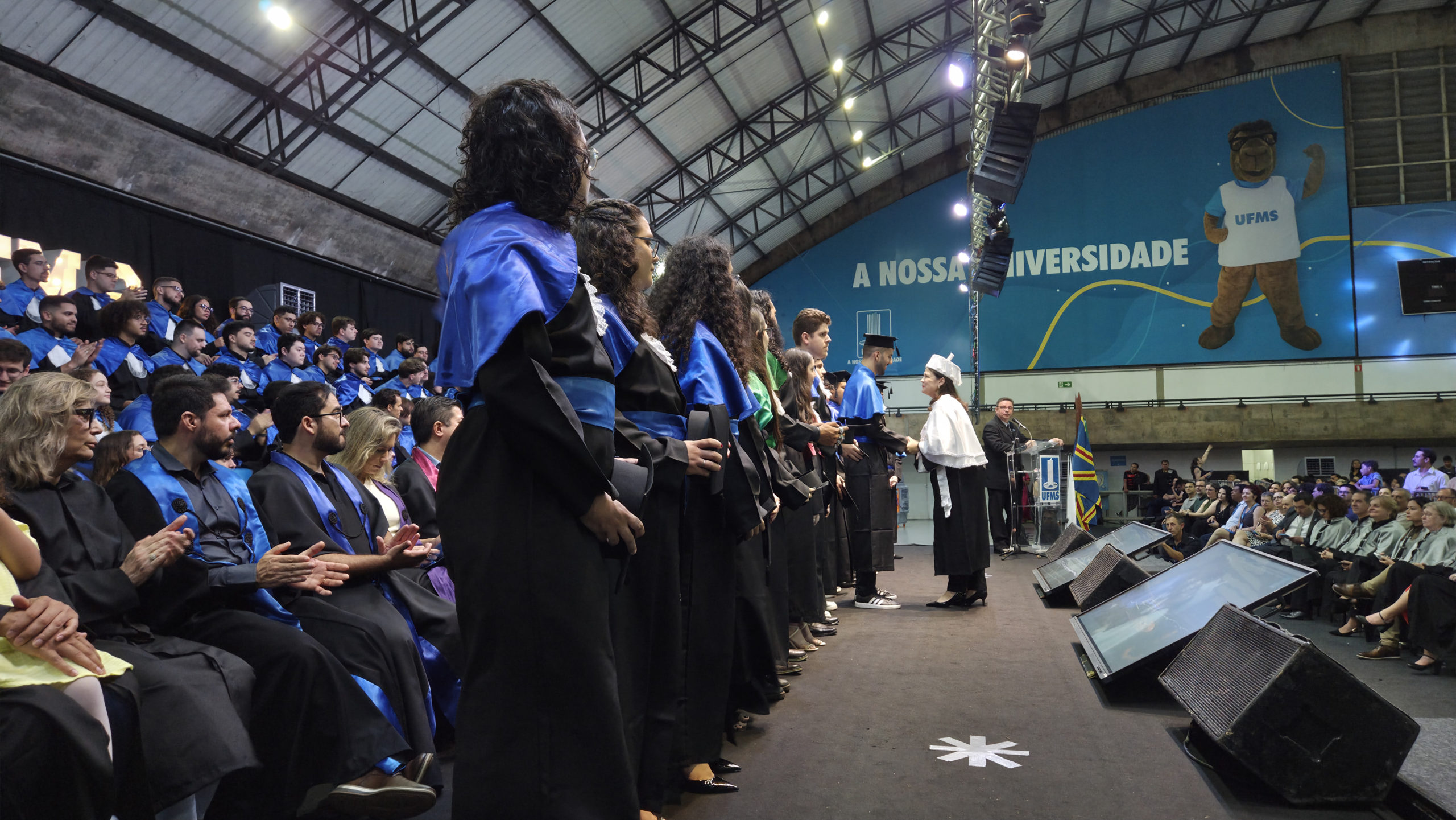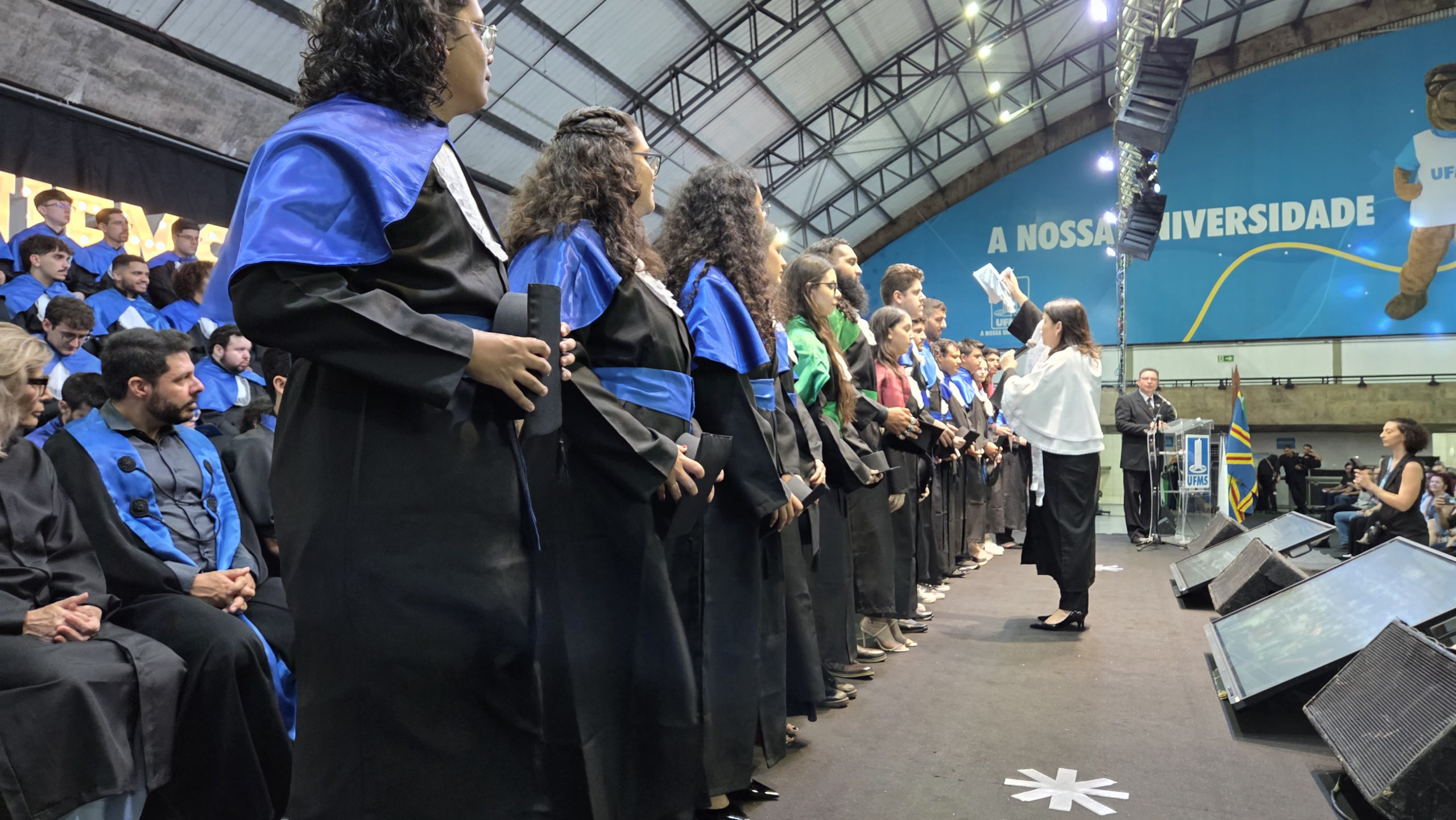 A UFMS de Campo Grande celebrou neste sábado, 13, a cerimônia de colação de grau de 308 formandos da Escola de Administração e Negócios (Esan), das faculdades de Computação (Facom) e de Odontologia (Faodo), além dos institutos de Biociências (Inbio), Matemática (Inma) e Química (Inqui). A solenidade foi realizada no Ginásio Moreninho, com transmissão ao vivo no canal da TV UFMS.