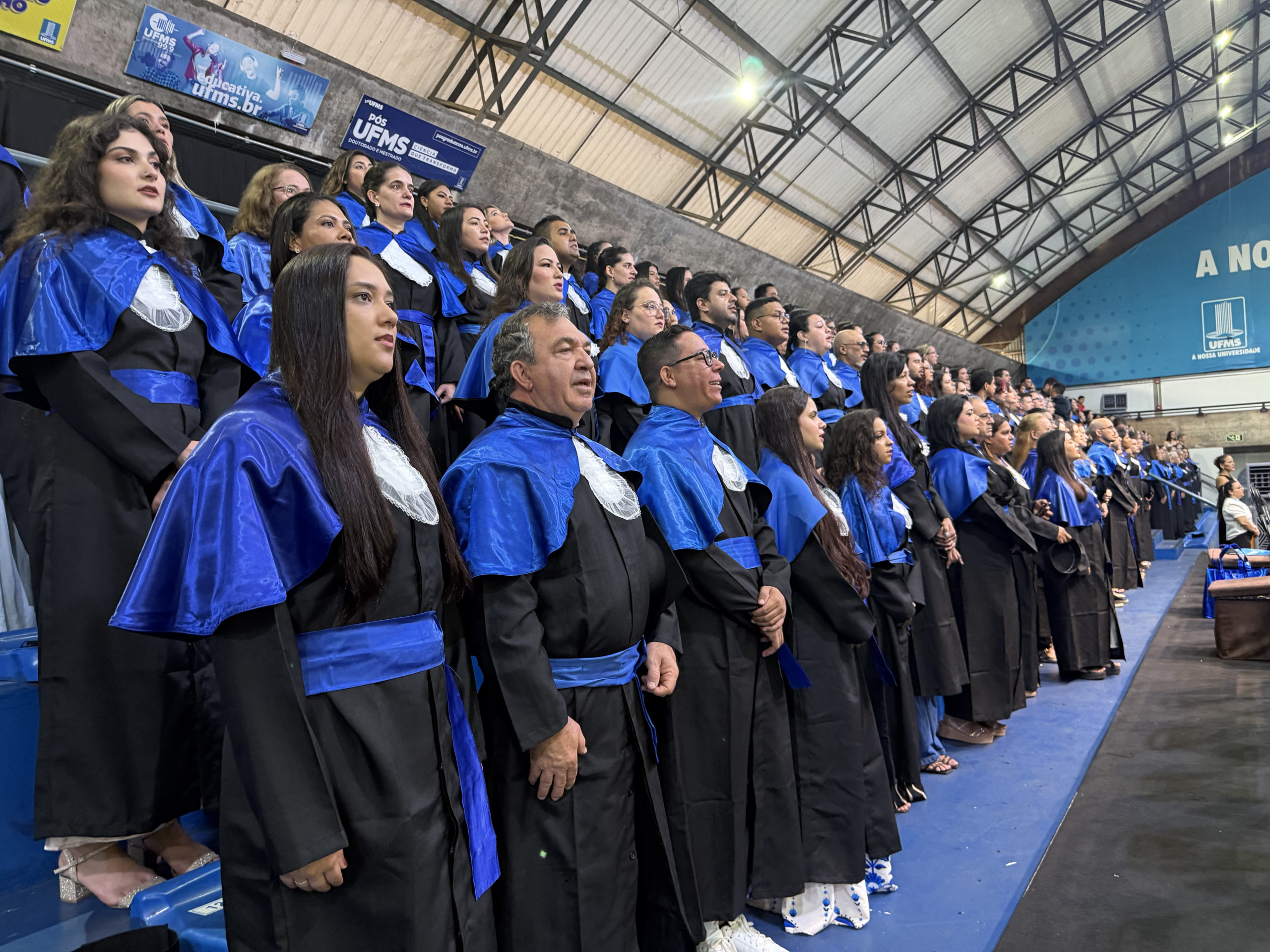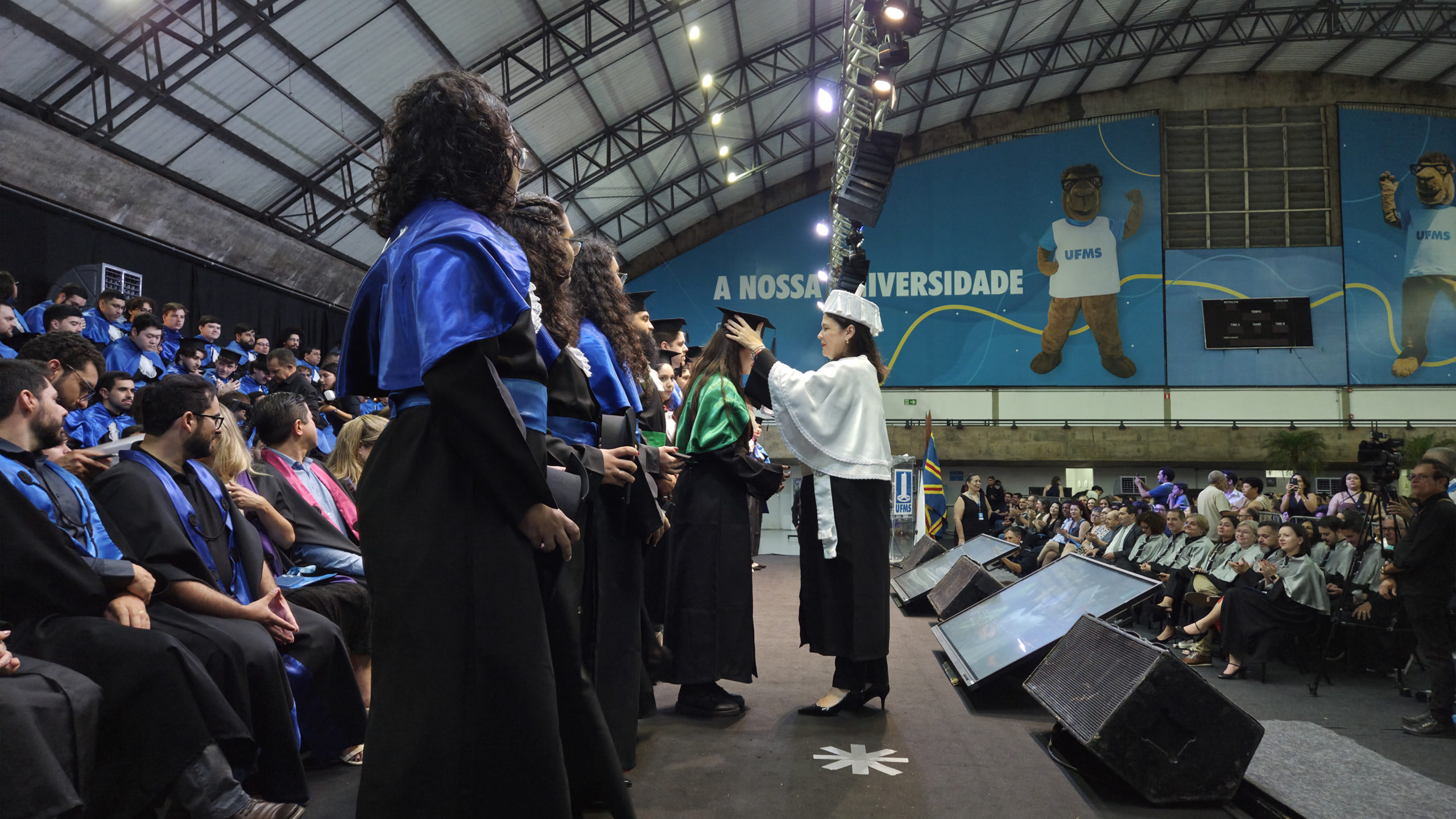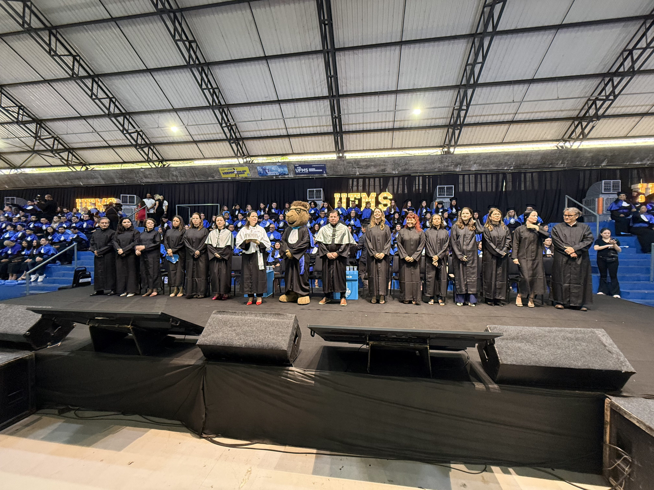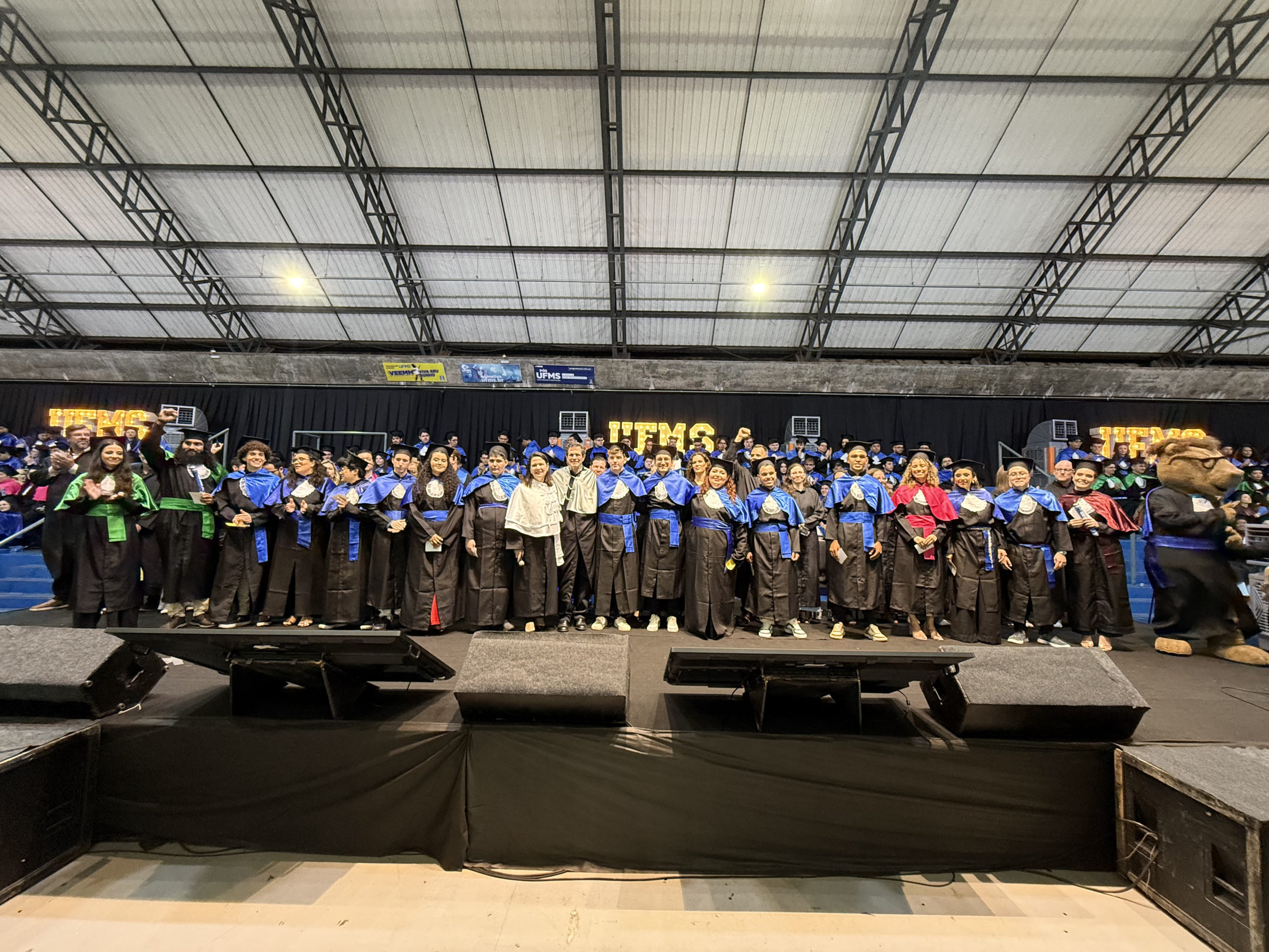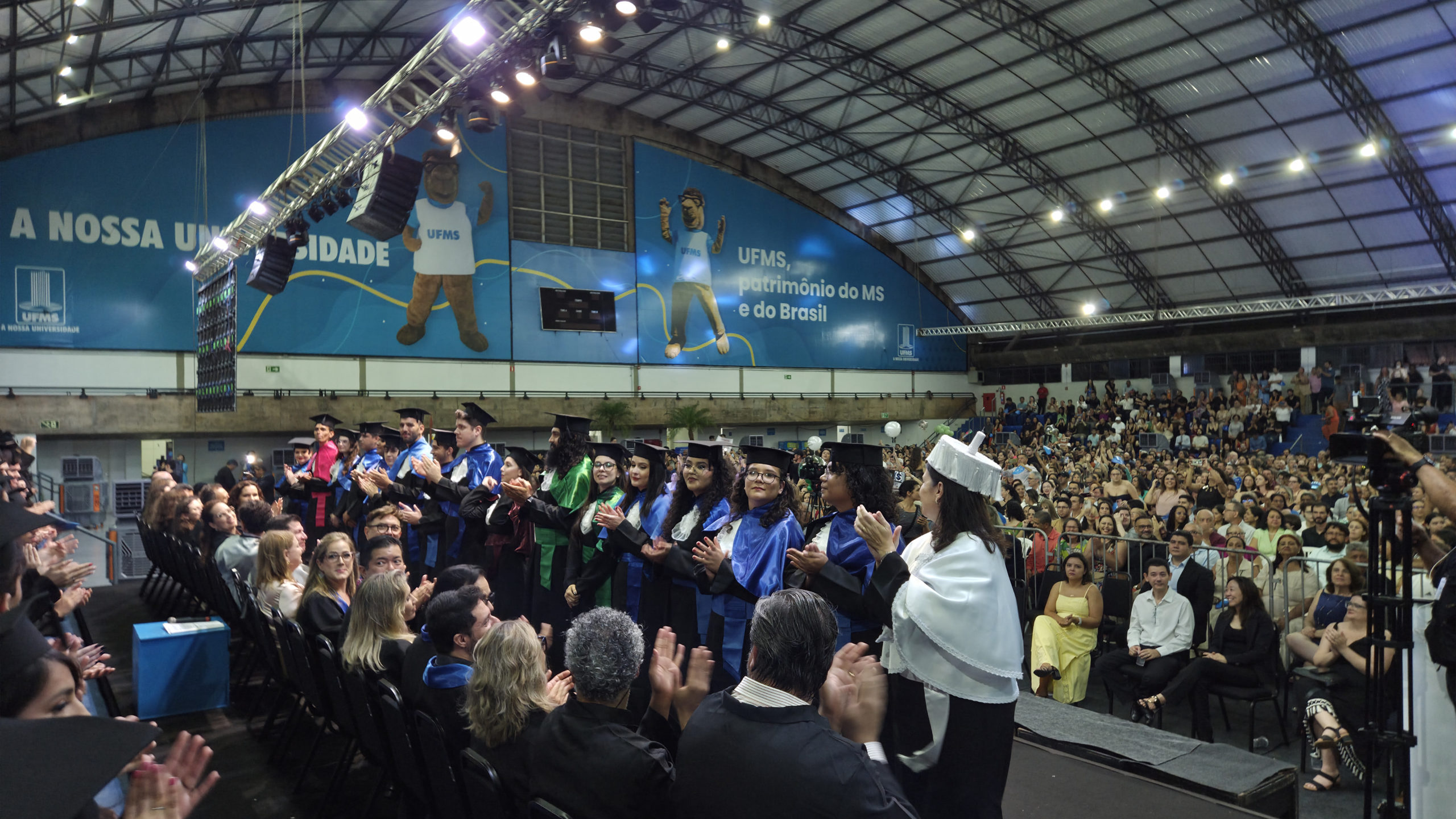 A UFMS de Campo Grande celebrou neste sábado, 13, a cerimônia de colação de grau de 308 formandos da Escola de Administração e Negócios (Esan), das faculdades de Computação (Facom) e de Odontologia (Faodo), além dos institutos de Biociências (Inbio), Matemática (Inma) e Química (Inqui). A solenidade foi realizada no Ginásio Moreninho, com transmissão ao vivo no canal da TV UFMS.