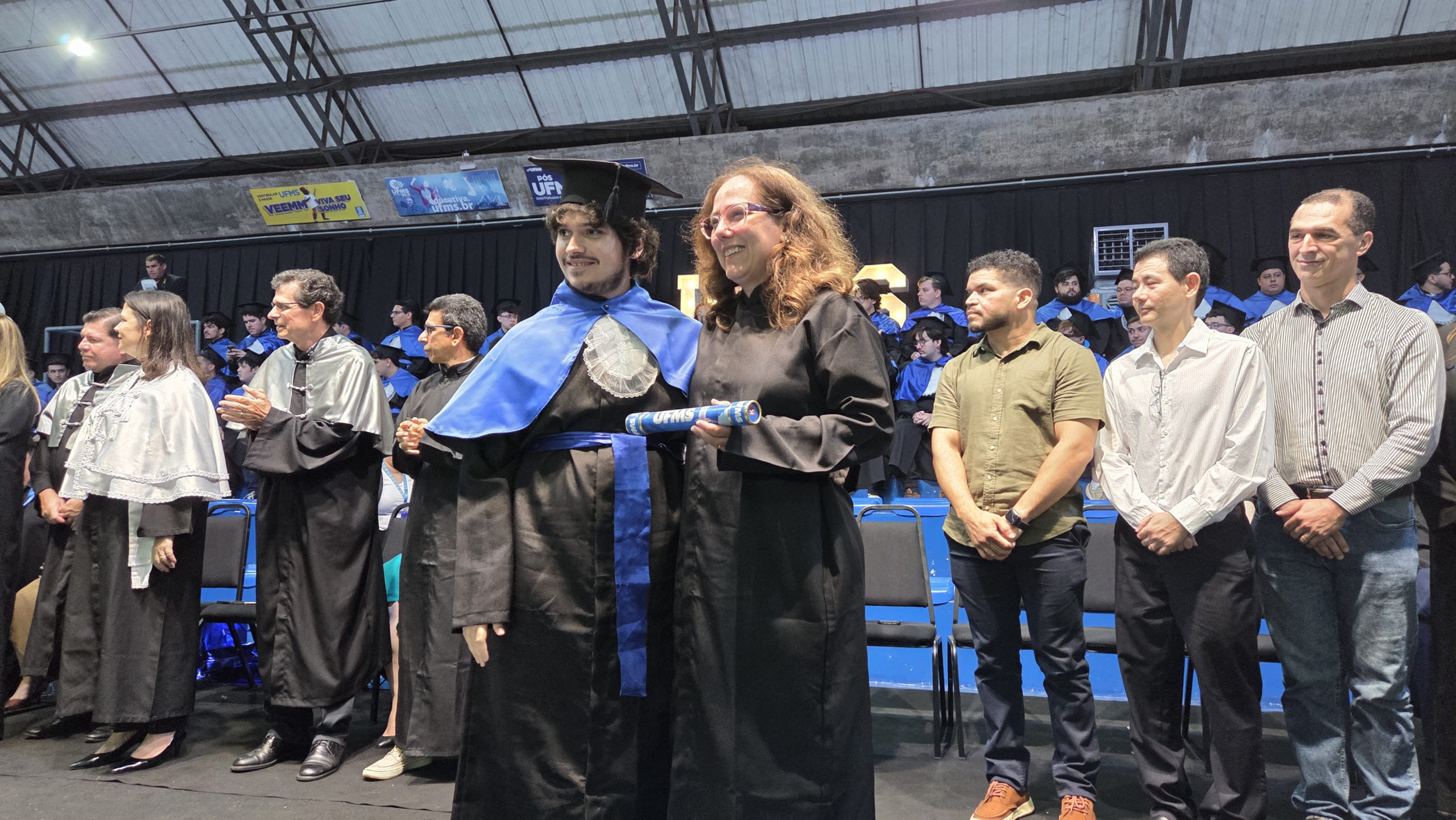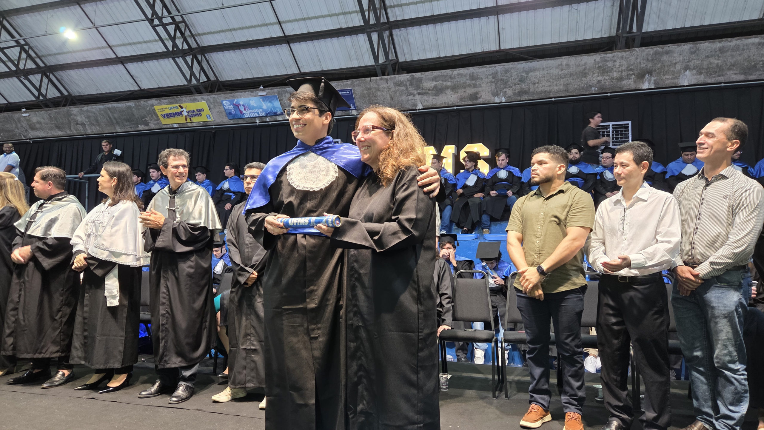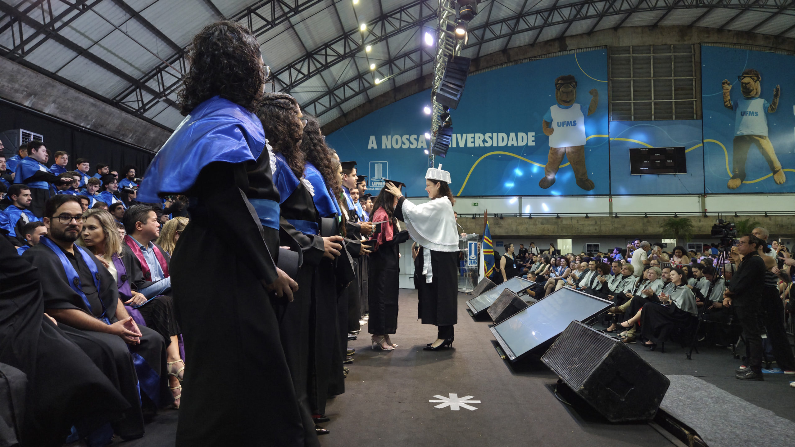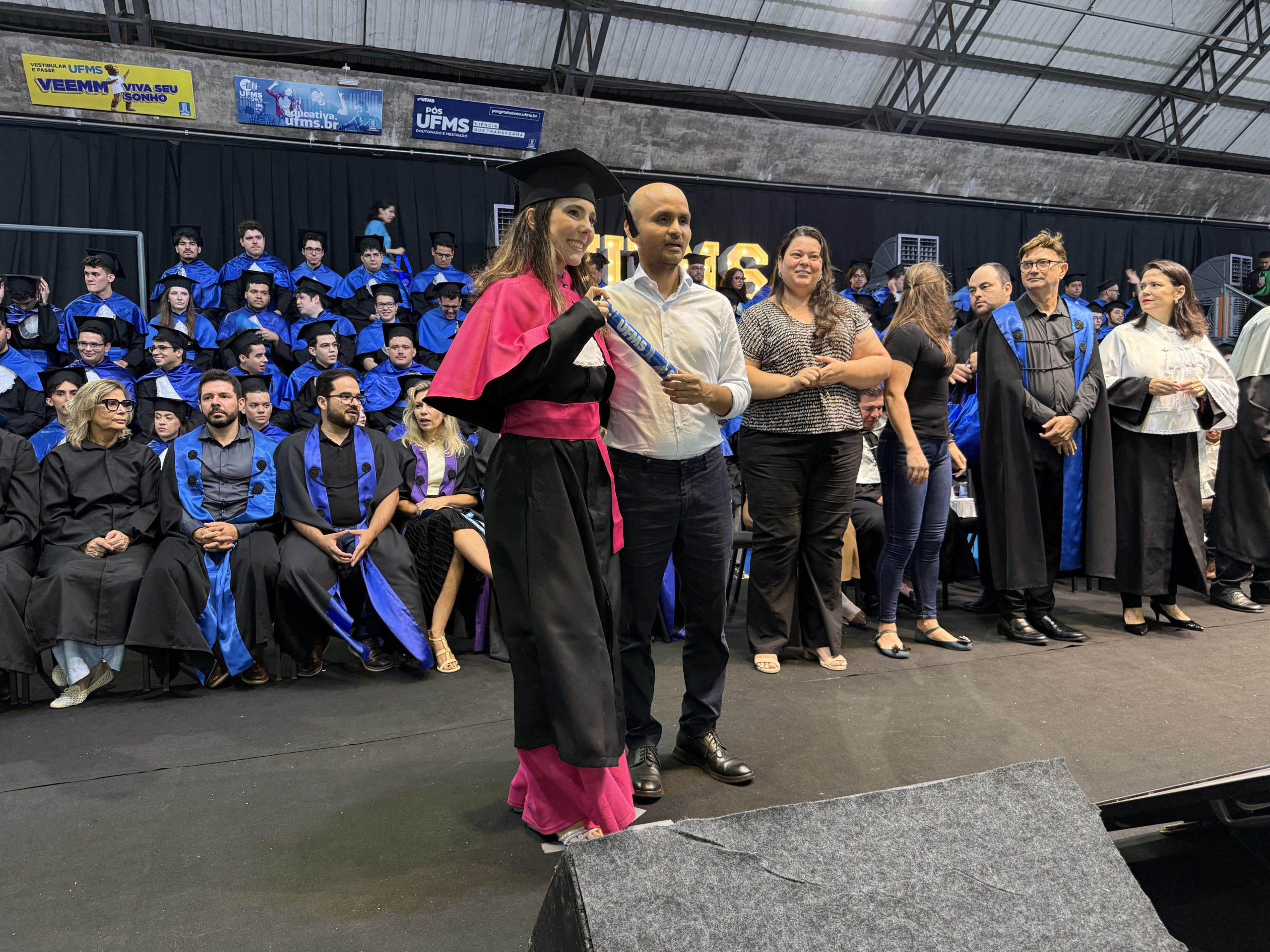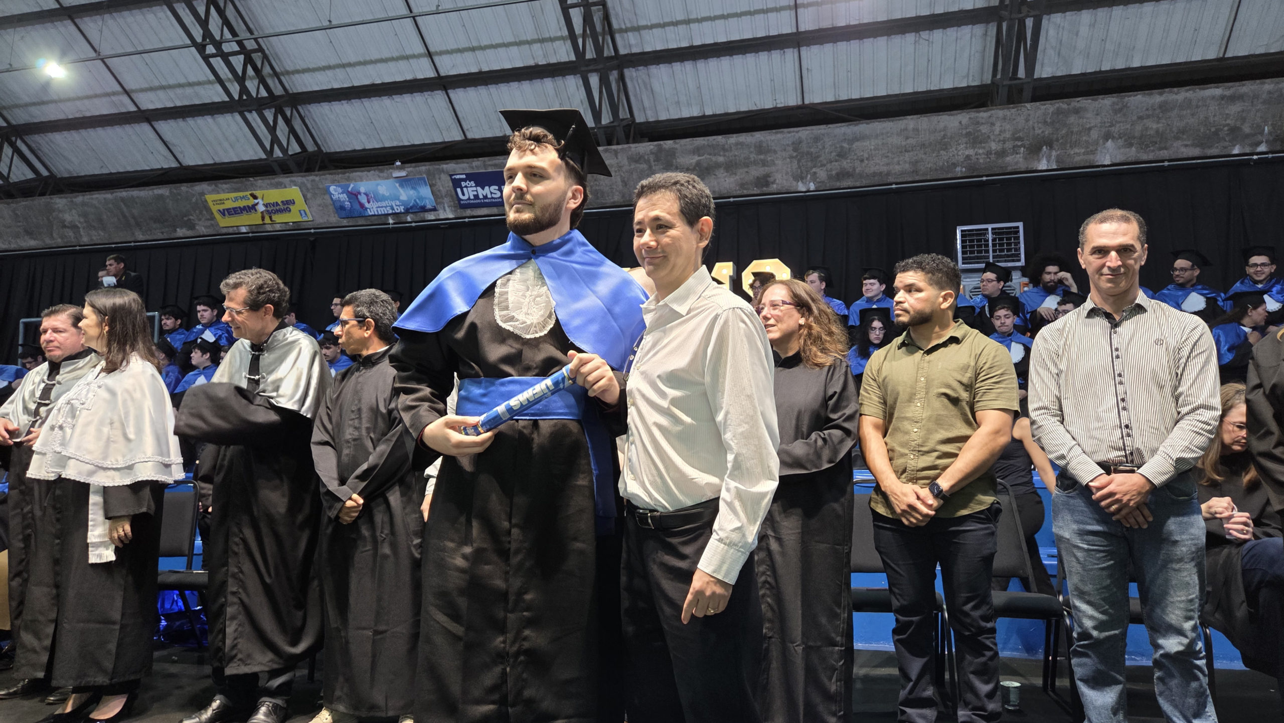 A UFMS de Campo Grande celebrou neste sábado, 13, a cerimônia de colação de grau de 308 formandos da Escola de Administração e Negócios (Esan), das faculdades de Computação (Facom) e de Odontologia (Faodo), além dos institutos de Biociências (Inbio), Matemática (Inma) e Química (Inqui). A solenidade foi realizada no Ginásio Moreninho, com transmissão ao vivo no canal da TV UFMS.