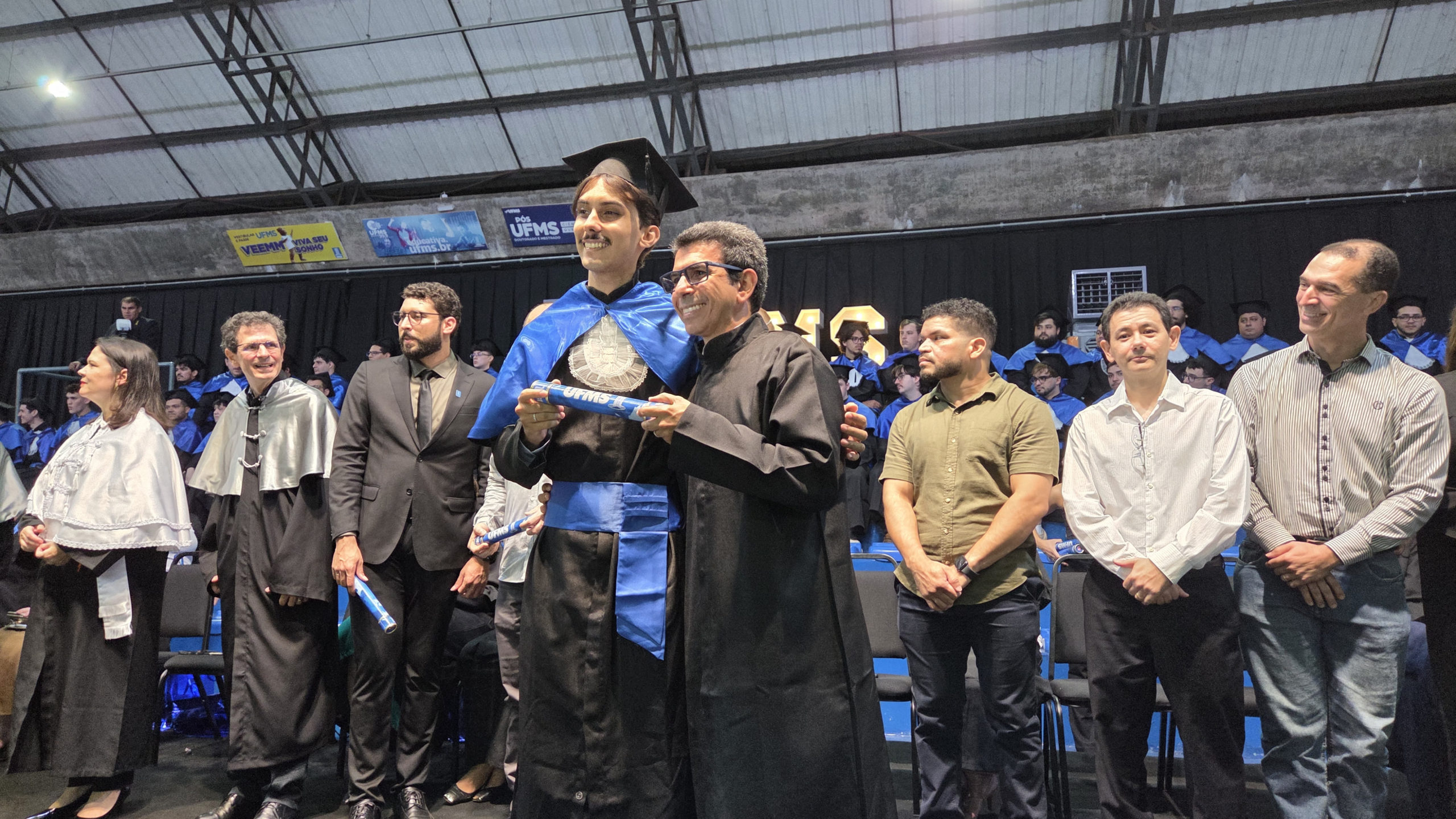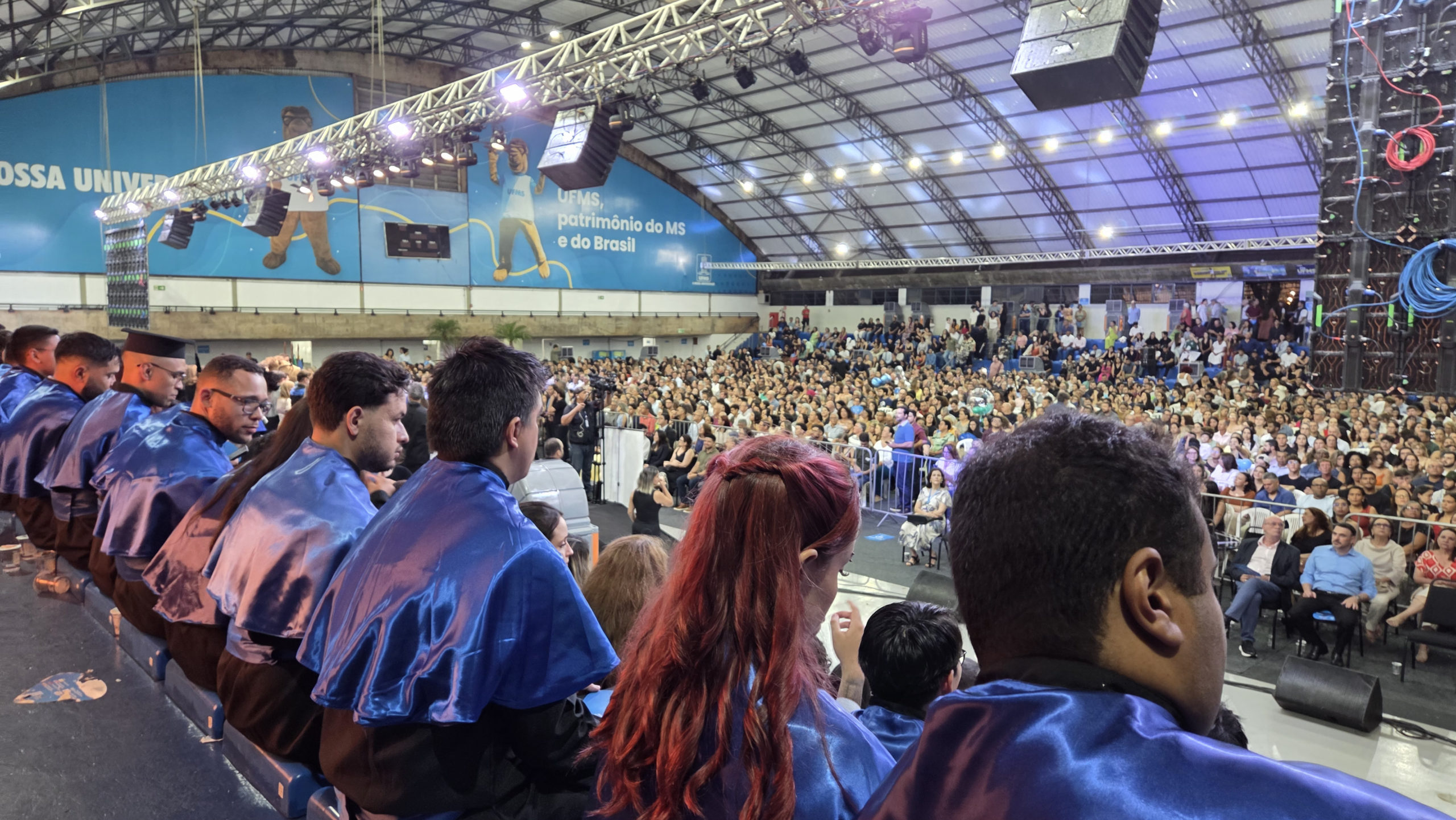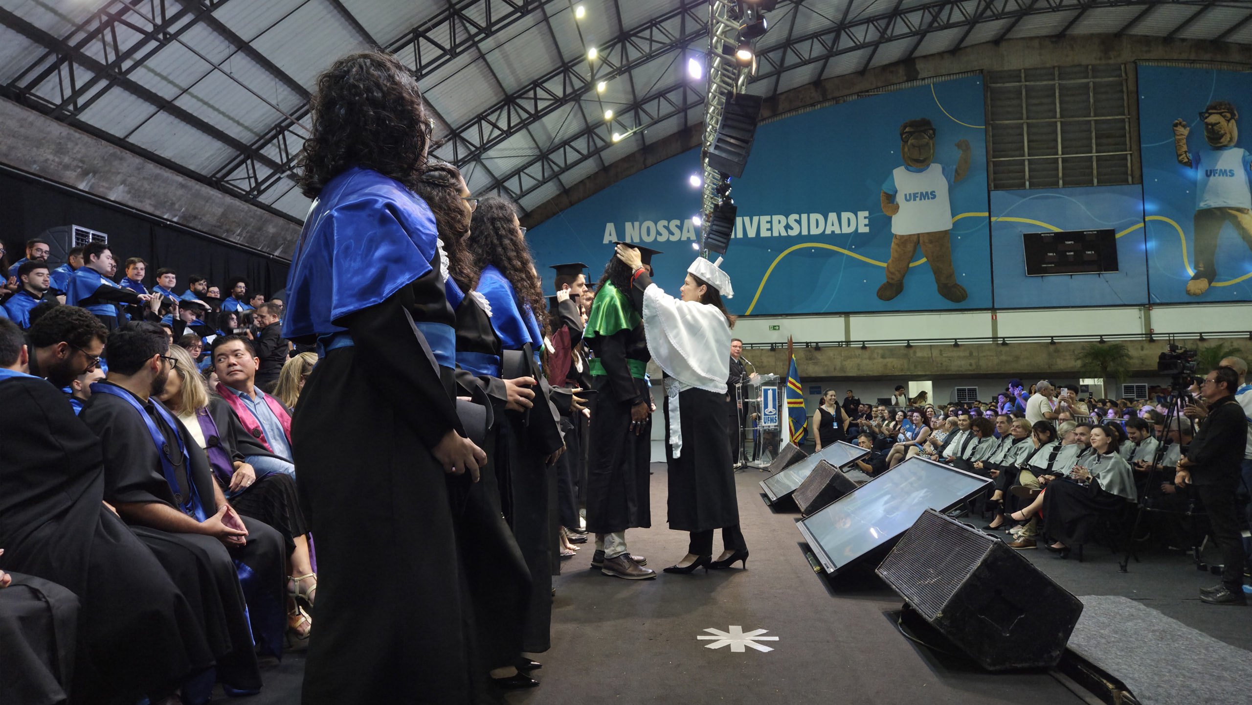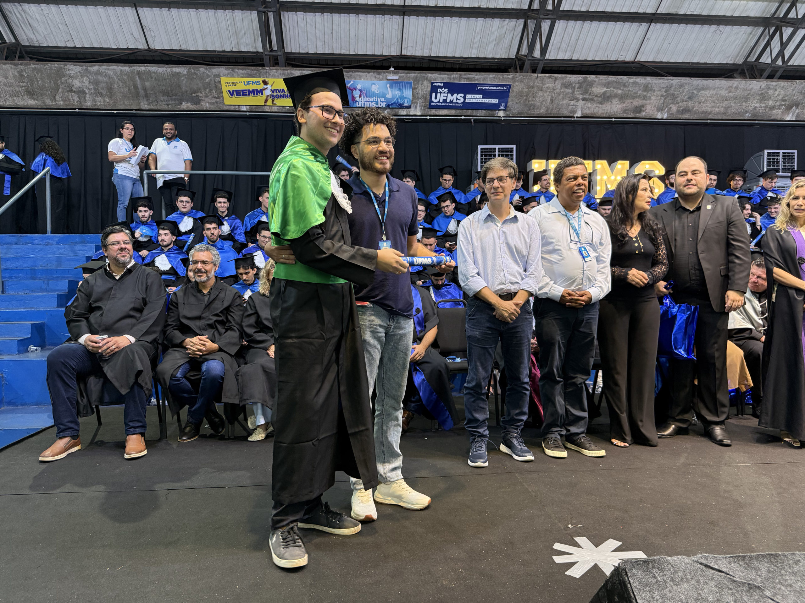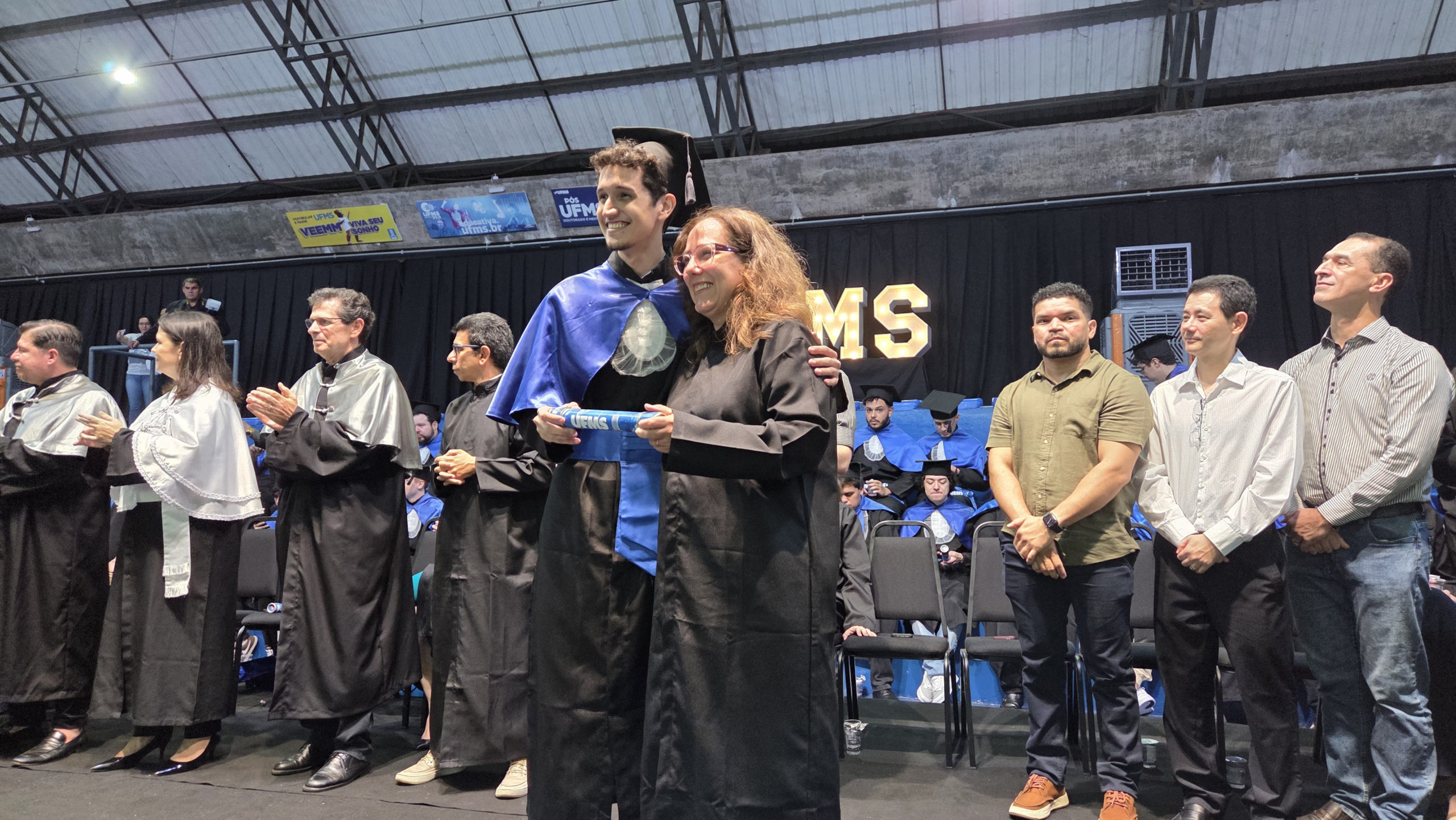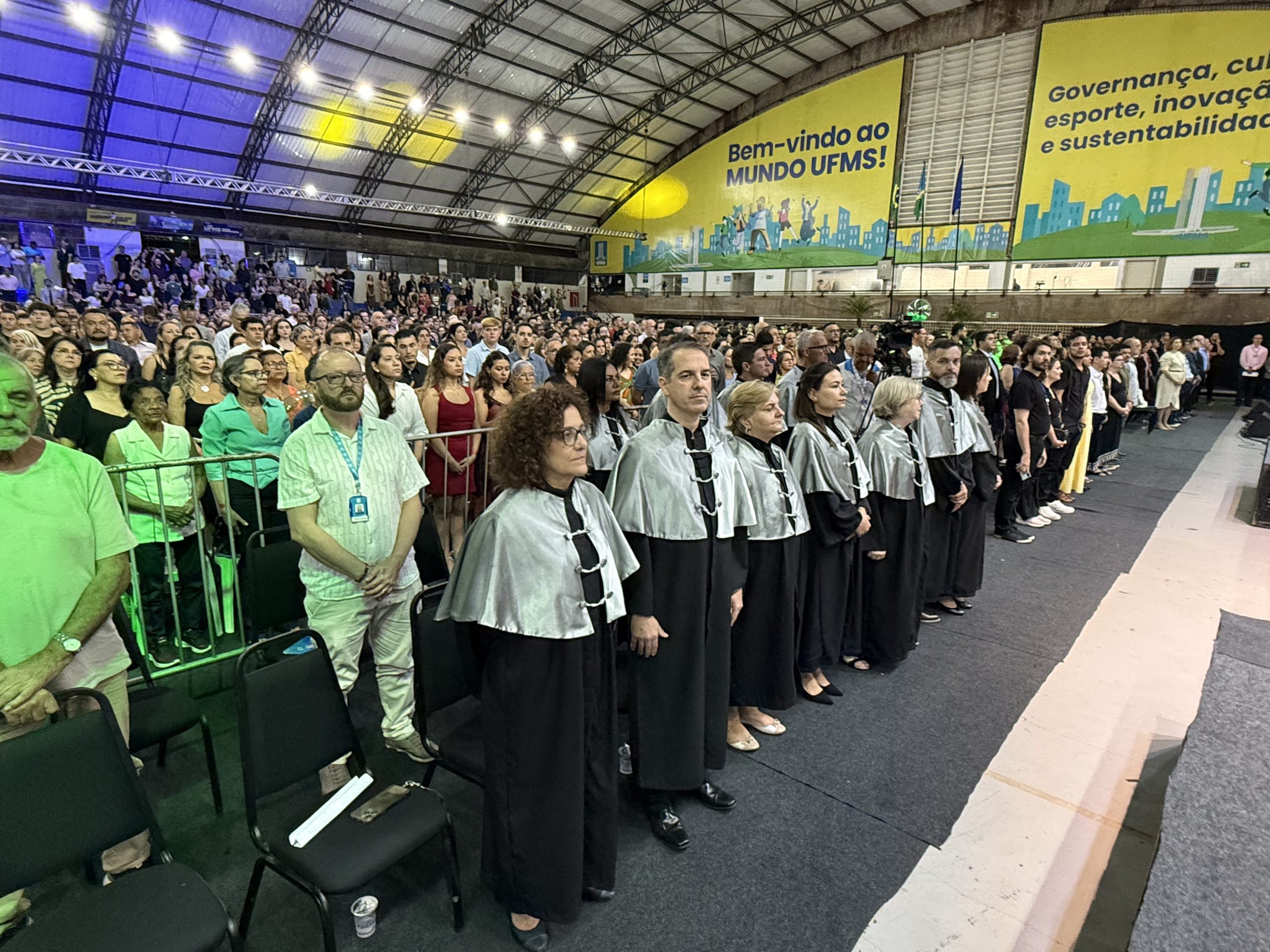 A UFMS de Campo Grande celebrou neste sábado, 13, a cerimônia de colação de grau de 308 formandos da Escola de Administração e Negócios (Esan), das faculdades de Computação (Facom) e de Odontologia (Faodo), além dos institutos de Biociências (Inbio), Matemática (Inma) e Química (Inqui). A solenidade foi realizada no Ginásio Moreninho, com transmissão ao vivo no canal da TV UFMS.