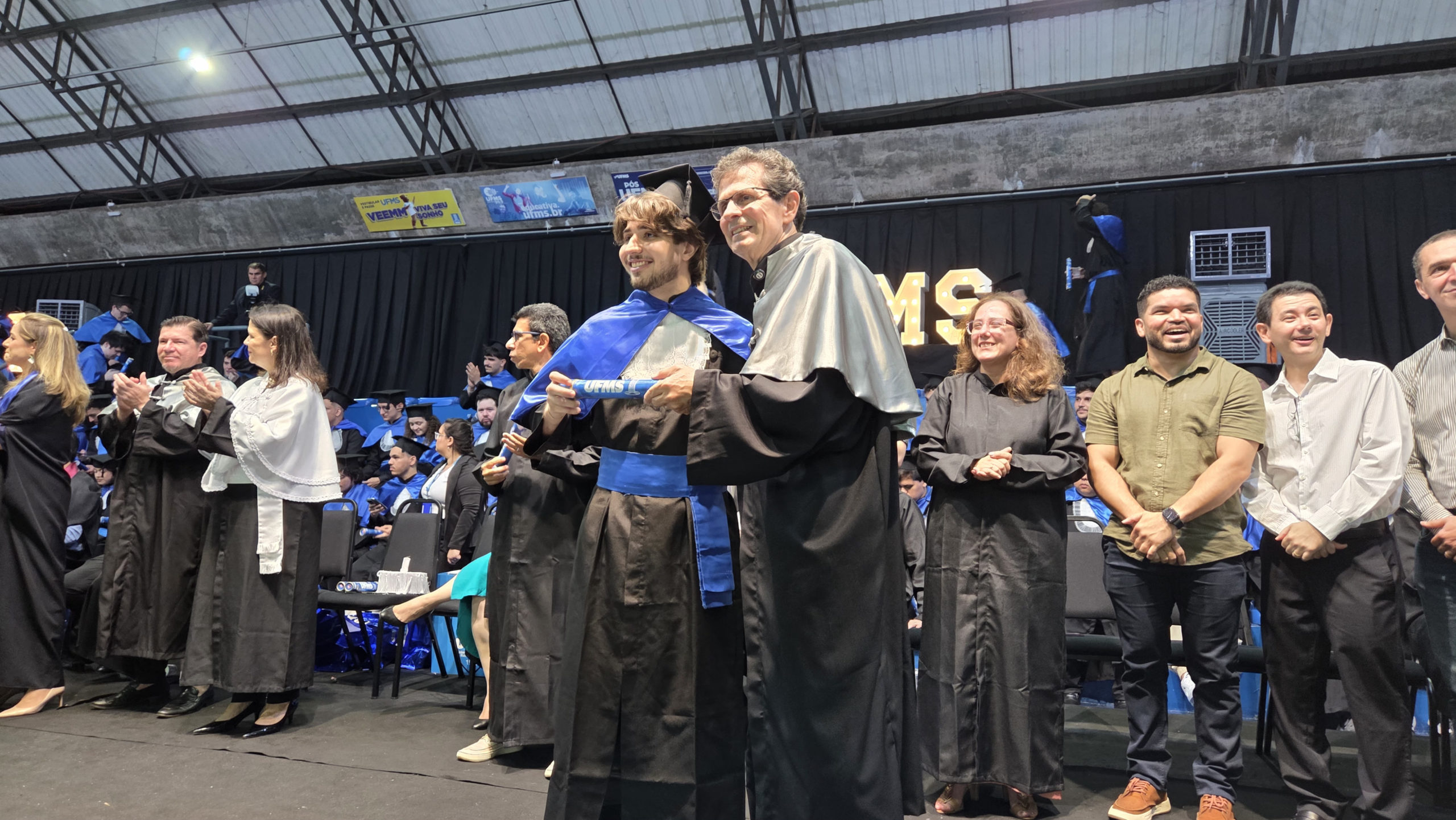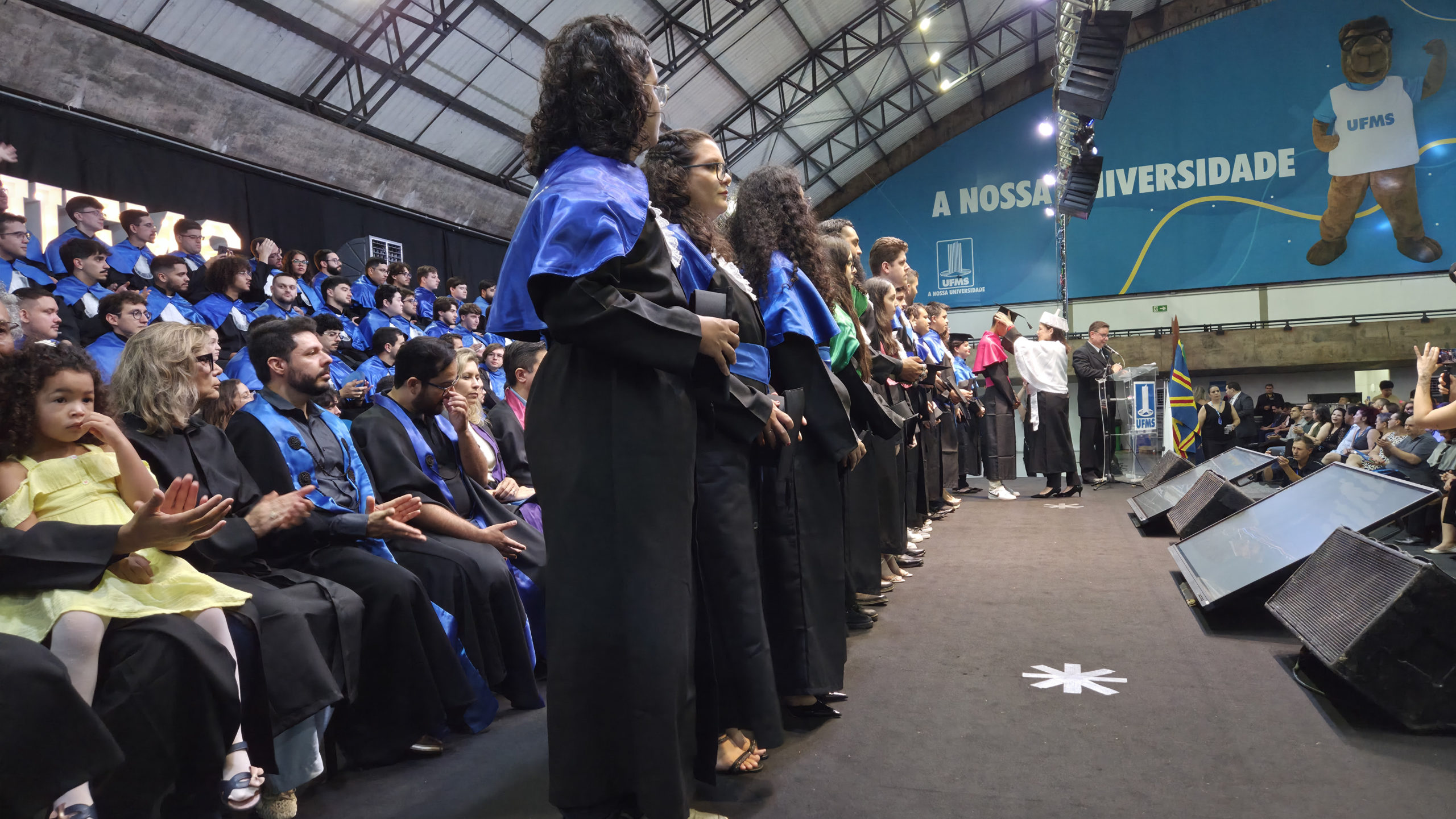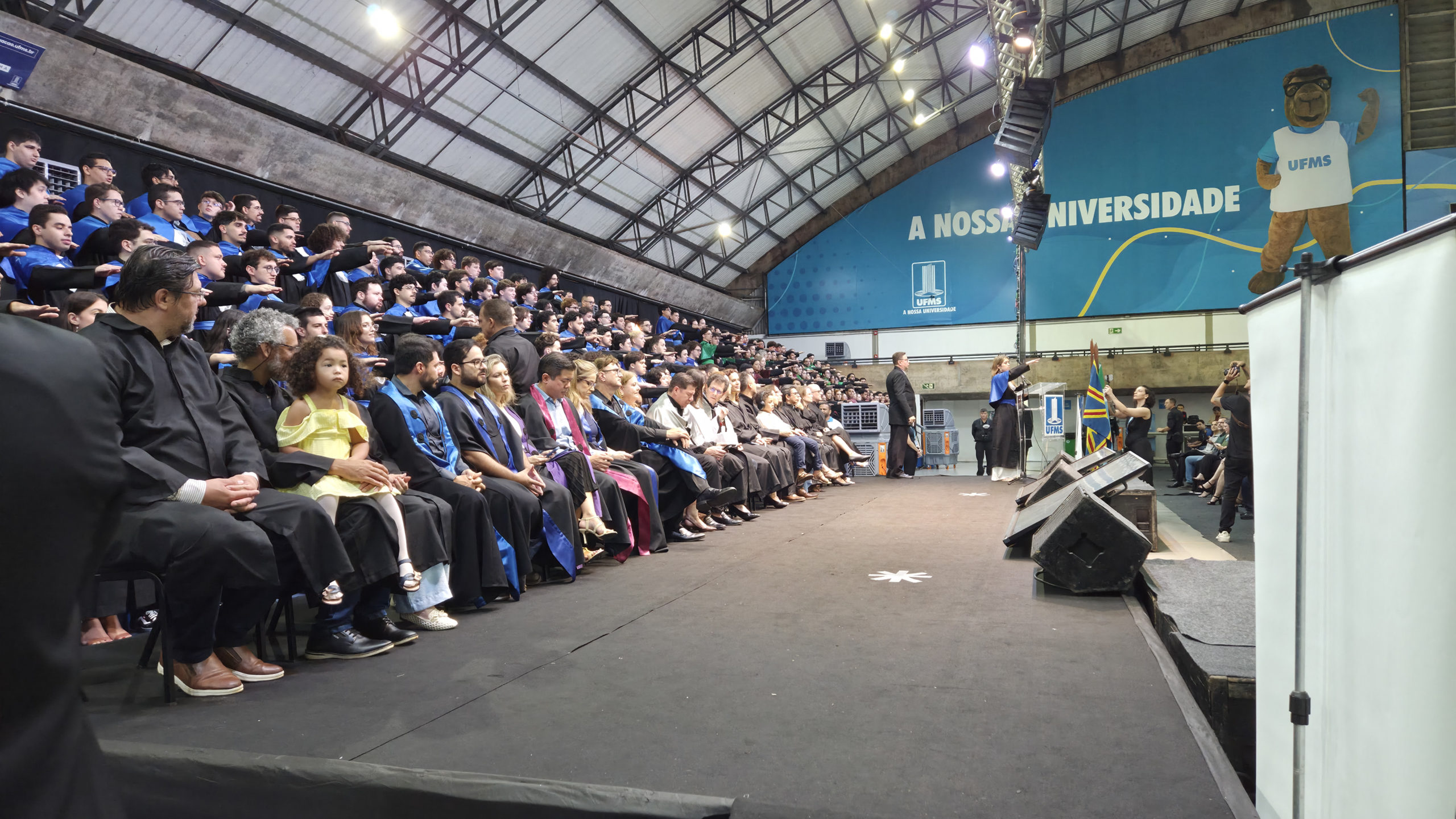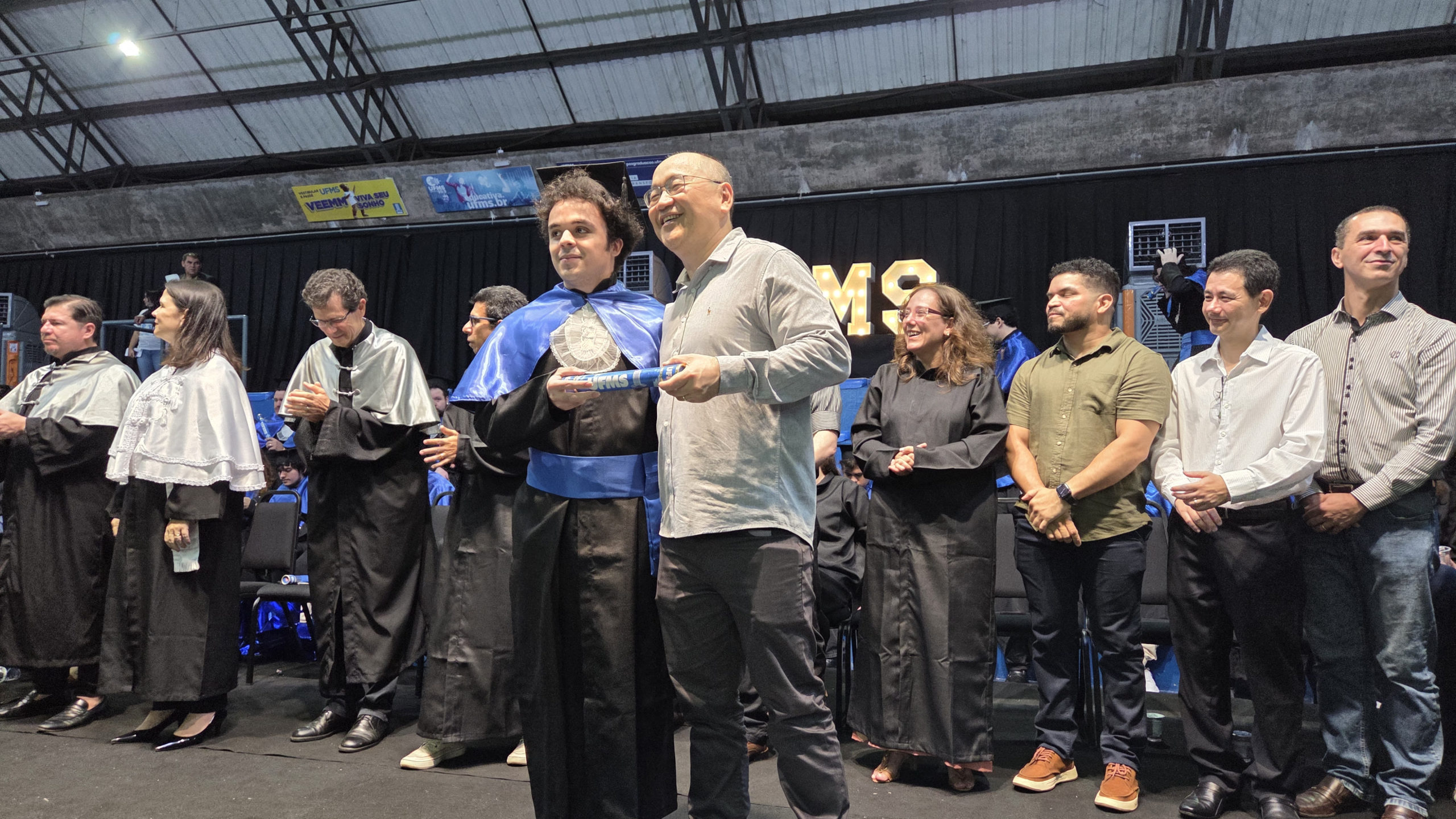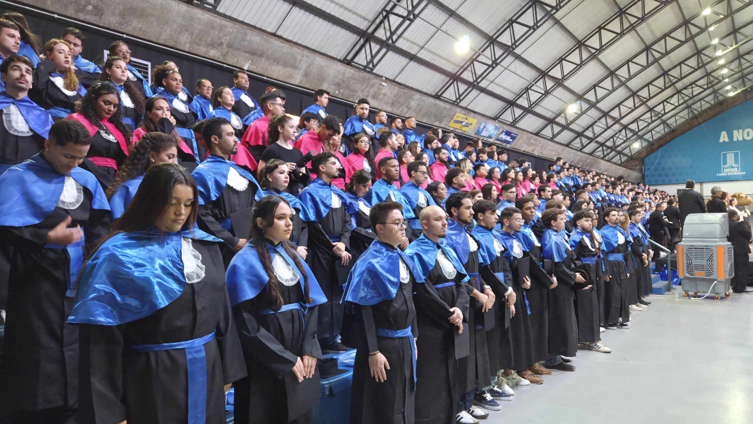 A UFMS de Campo Grande celebrou neste sábado, 13, a cerimônia de colação de grau de 308 formandos da Escola de Administração e Negócios (Esan), das faculdades de Computação (Facom) e de Odontologia (Faodo), além dos institutos de Biociências (Inbio), Matemática (Inma) e Química (Inqui). A solenidade foi realizada no Ginásio Moreninho, com transmissão ao vivo no canal da TV UFMS.
