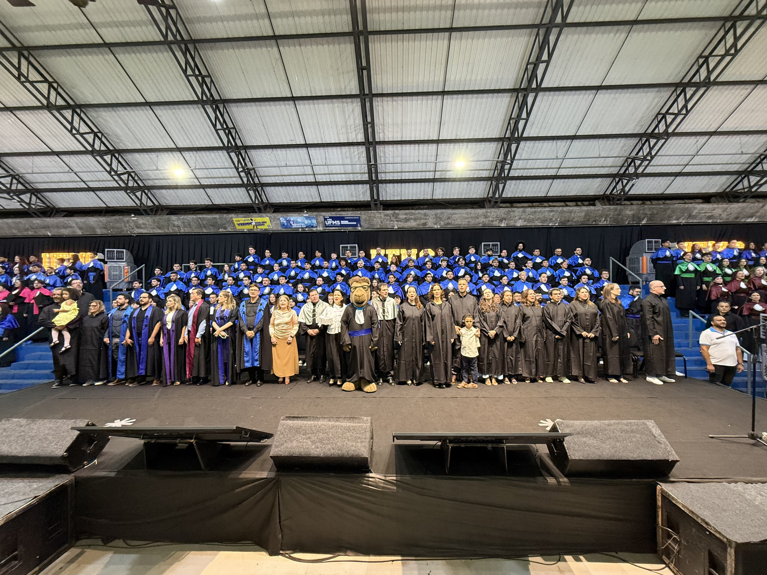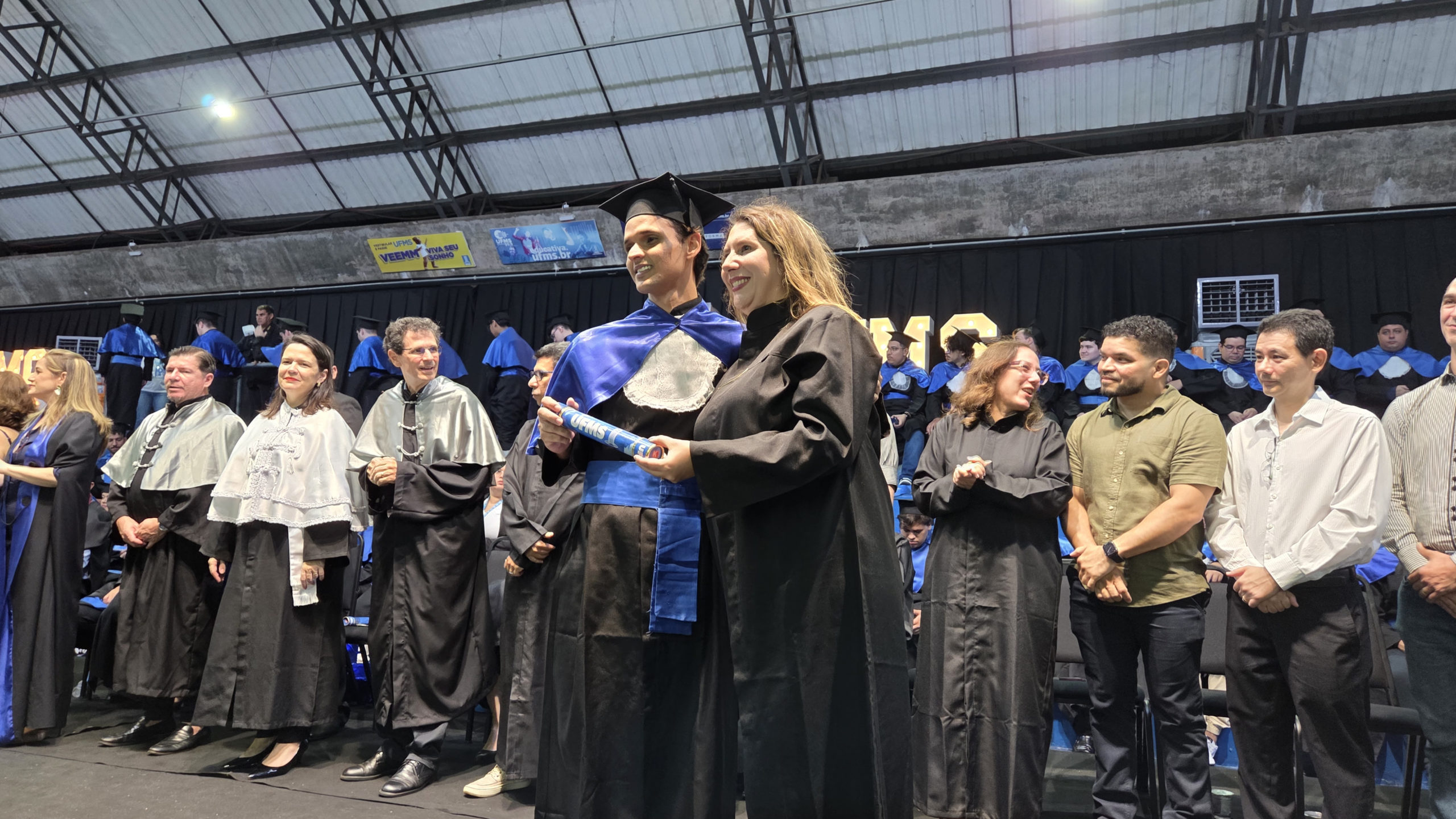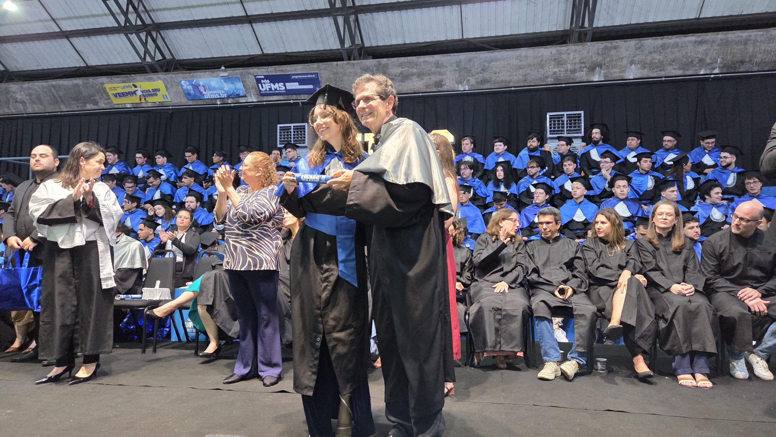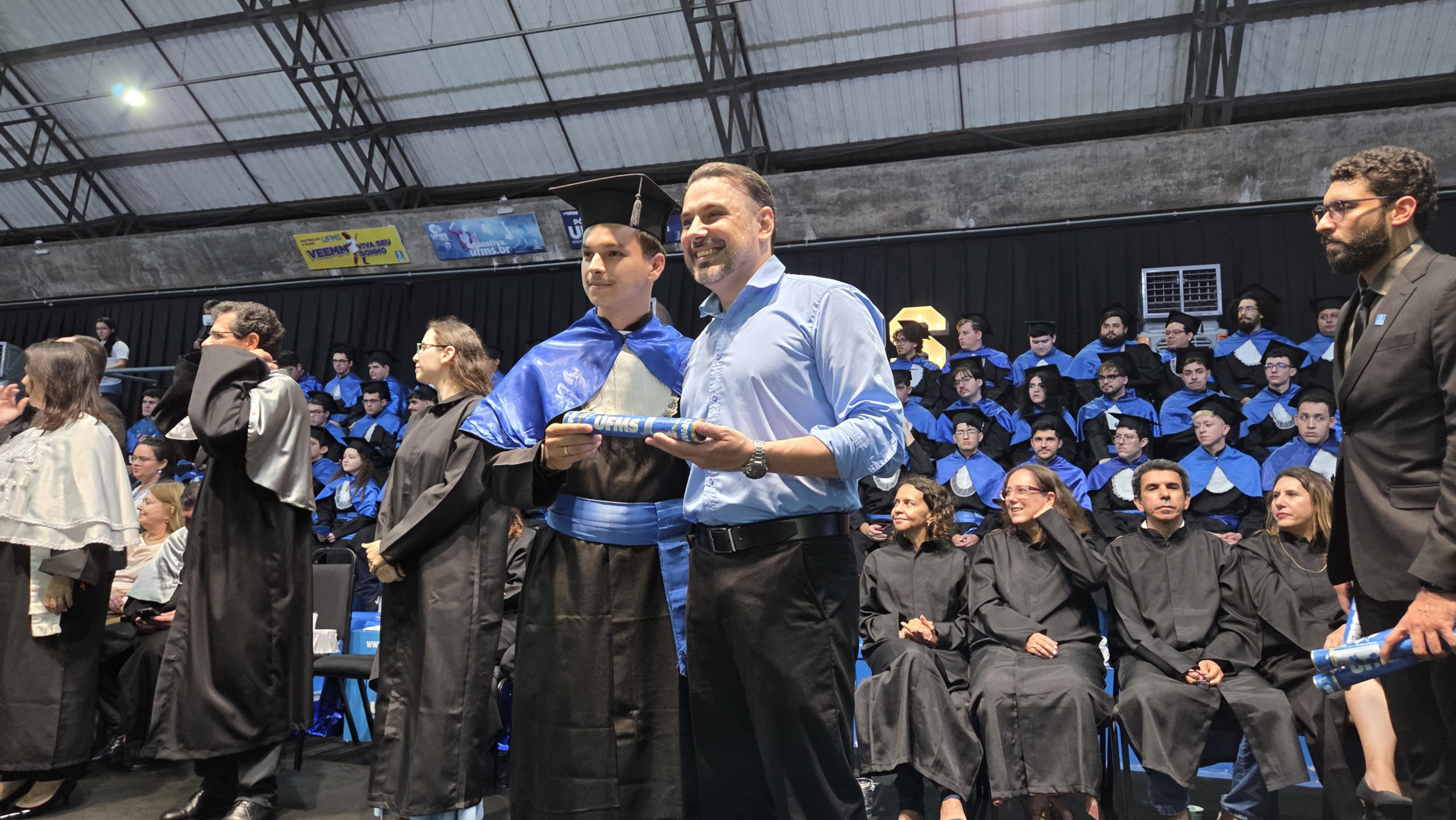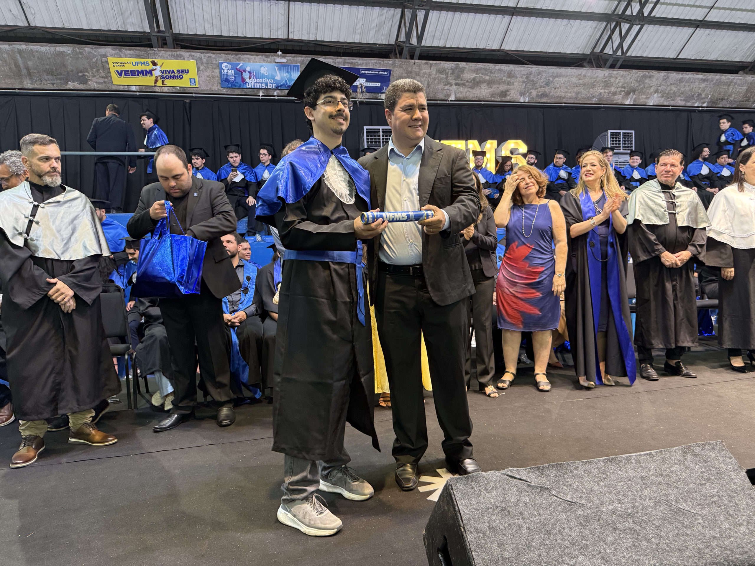 A UFMS de Campo Grande celebrou neste sábado, 13, a cerimônia de colação de grau de 308 formandos da Escola de Administração e Negócios (Esan), das faculdades de Computação (Facom) e de Odontologia (Faodo), além dos institutos de Biociências (Inbio), Matemática (Inma) e Química (Inqui). A solenidade foi realizada no Ginásio Moreninho, com transmissão ao vivo no canal da TV UFMS.
