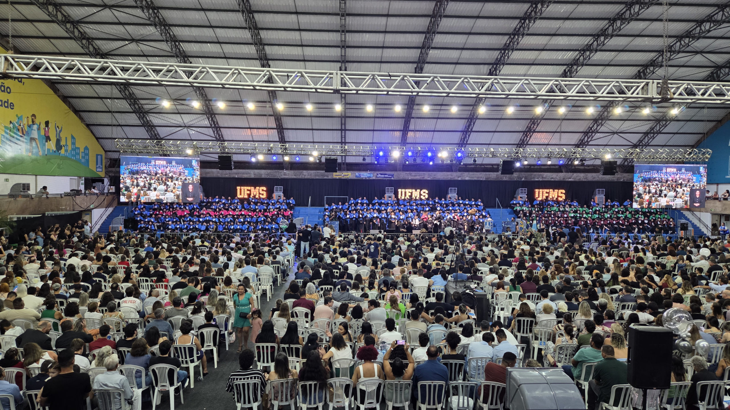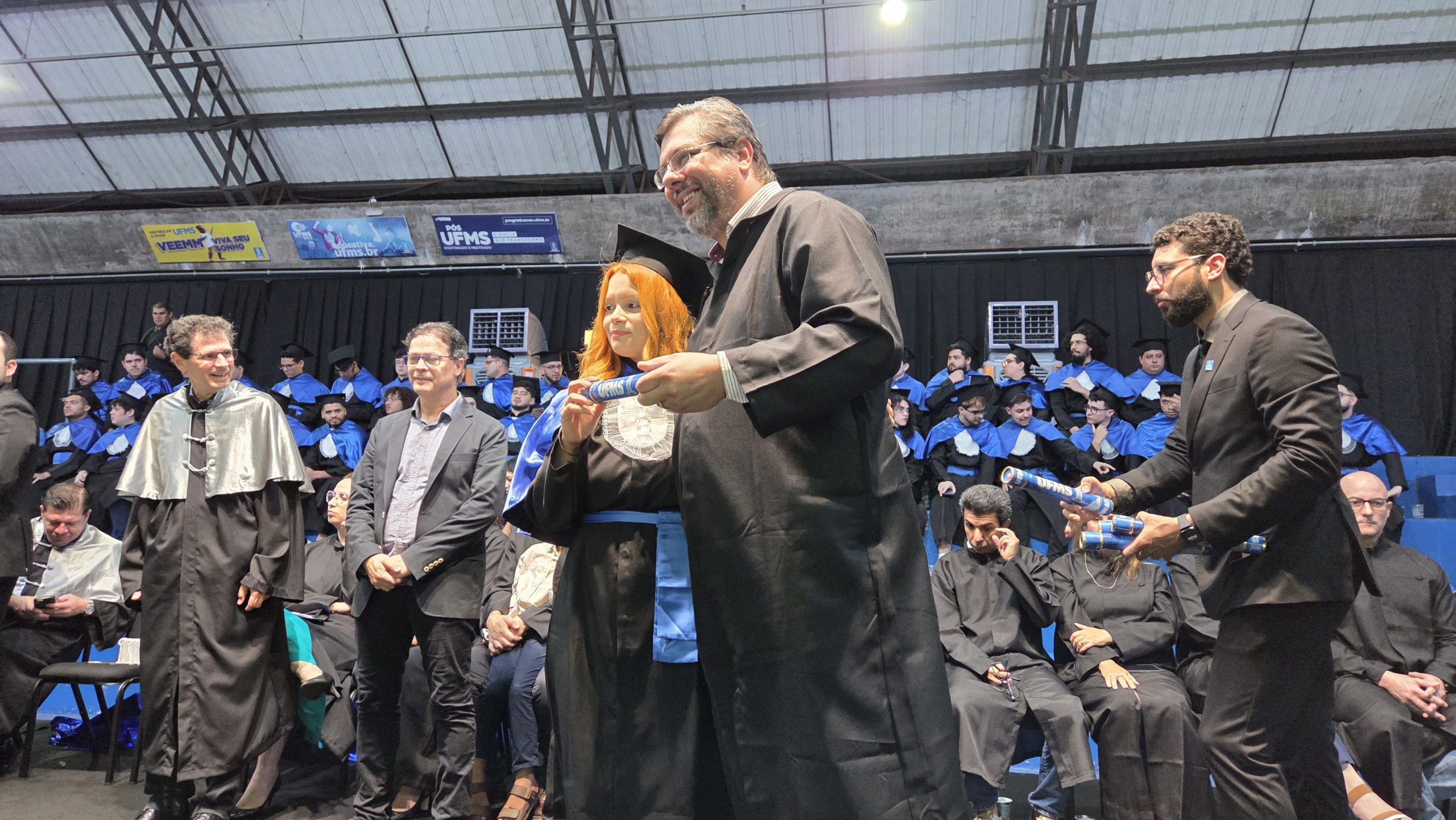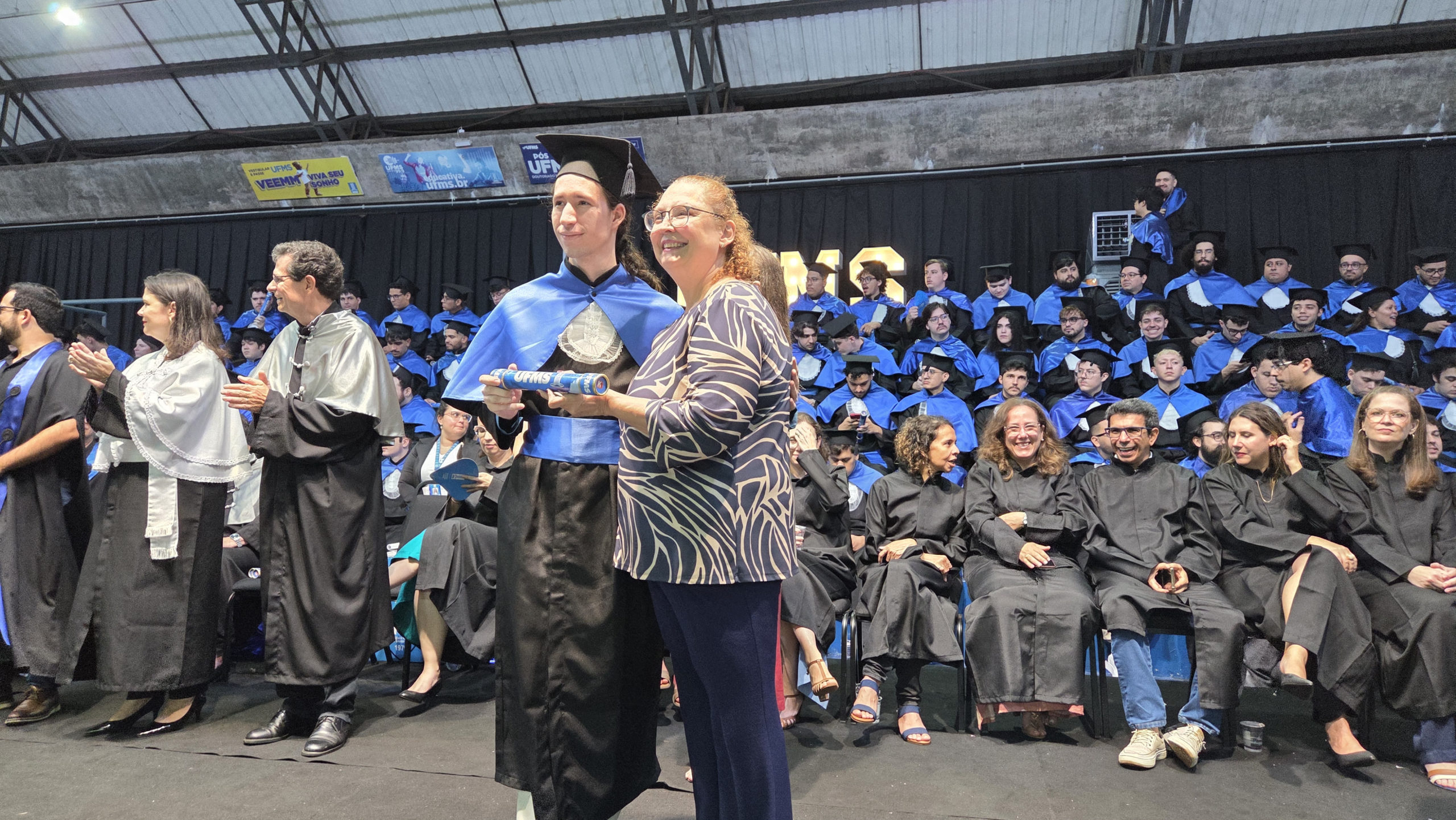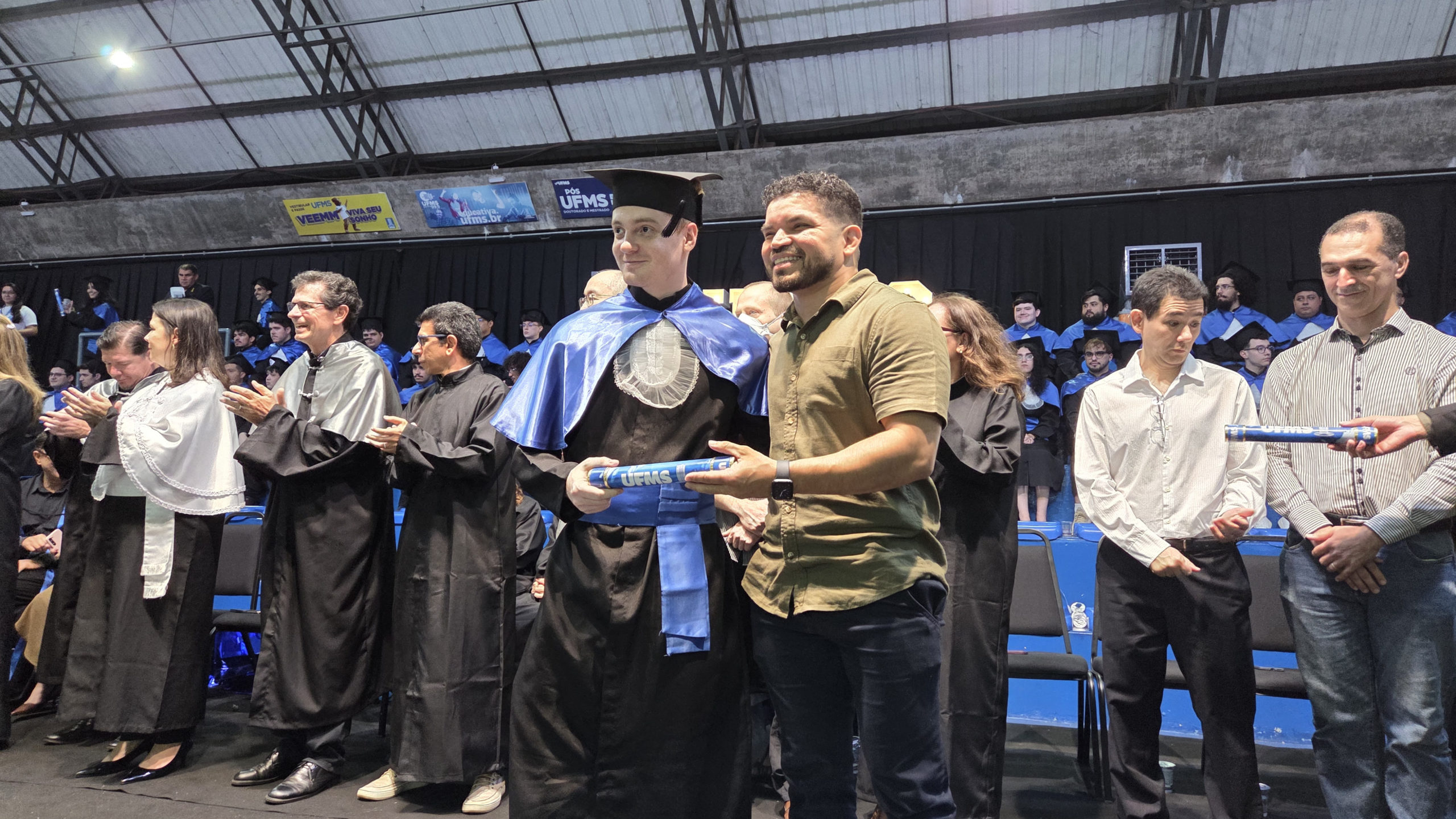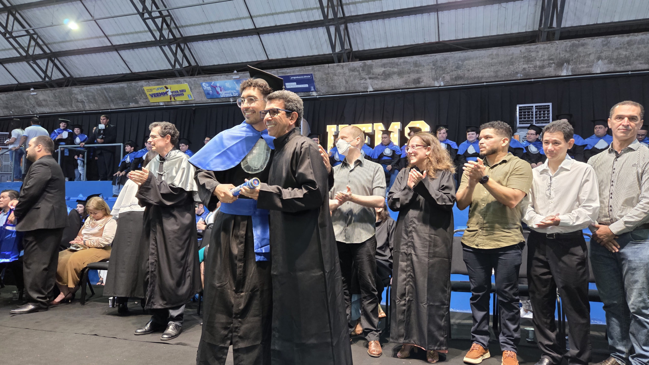A UFMS de Campo Grande celebrou neste sábado, 13, a cerimônia de colação de grau de 308 formandos da Escola de Administração e Negócios (Esan), das faculdades de Computação (Facom) e de Odontologia (Faodo), além dos institutos de Biociências (Inbio), Matemática (Inma) e Química (Inqui). A solenidade foi realizada no Ginásio Moreninho, com transmissão ao vivo no canal da TV UFMS.