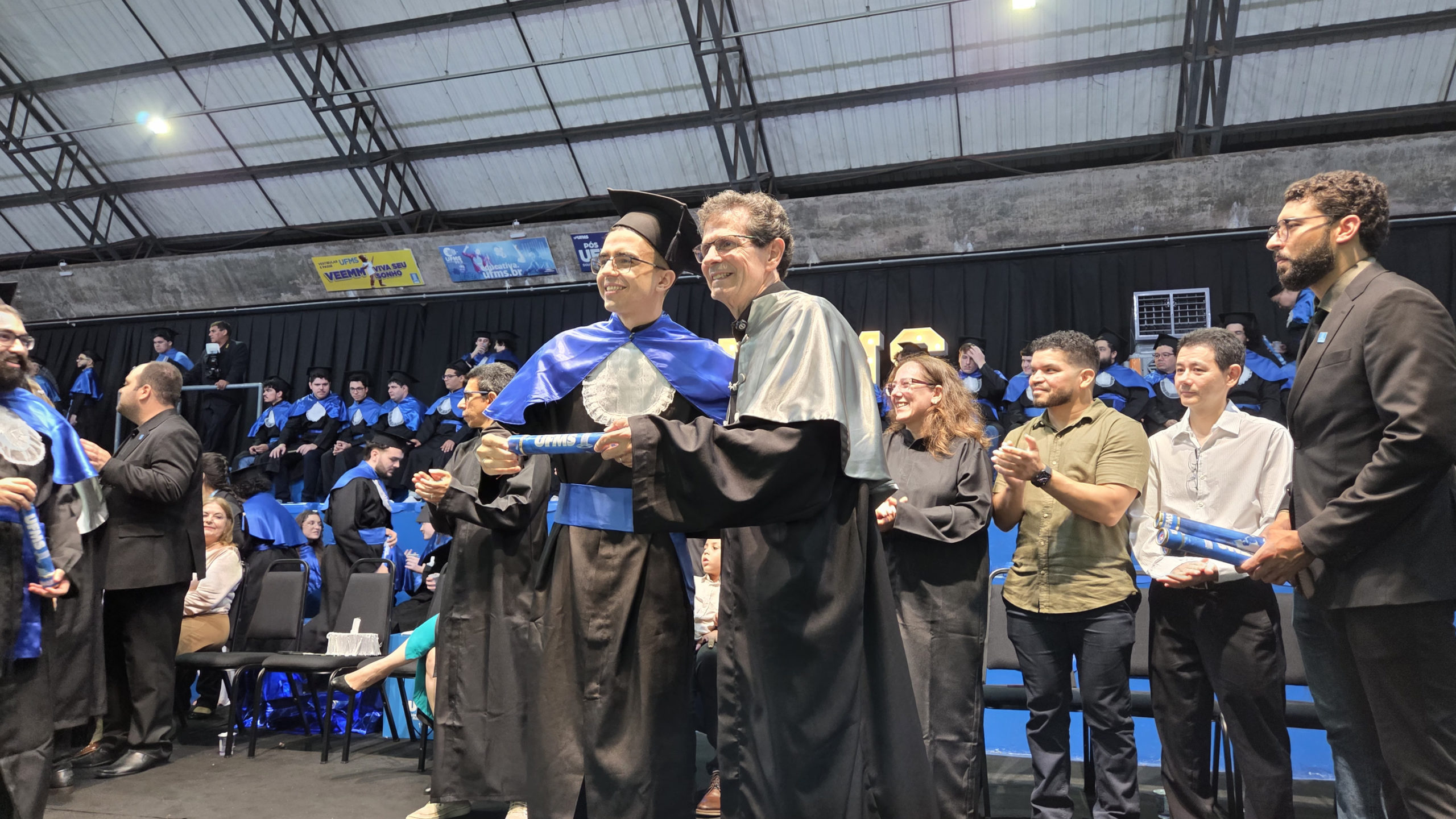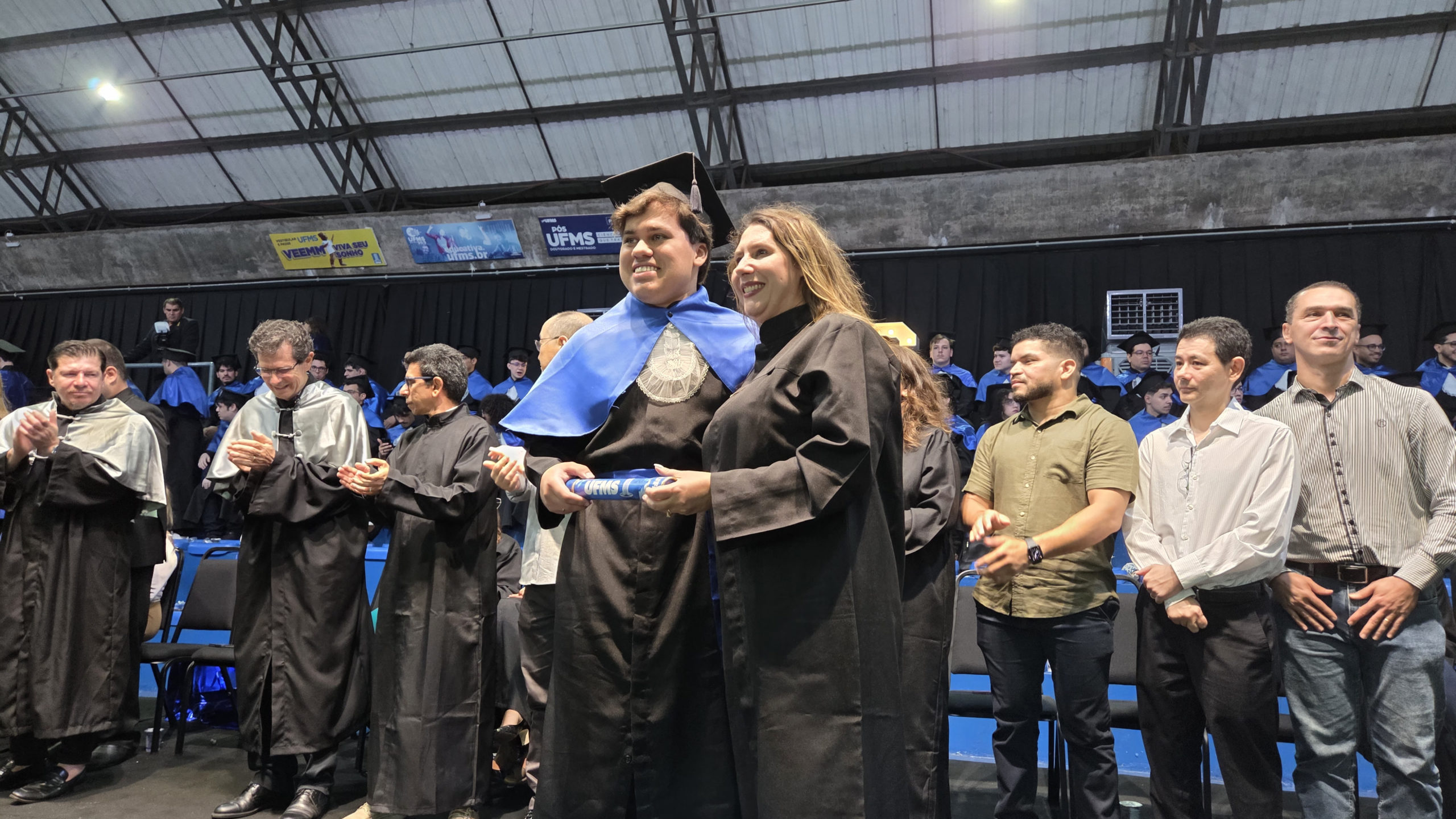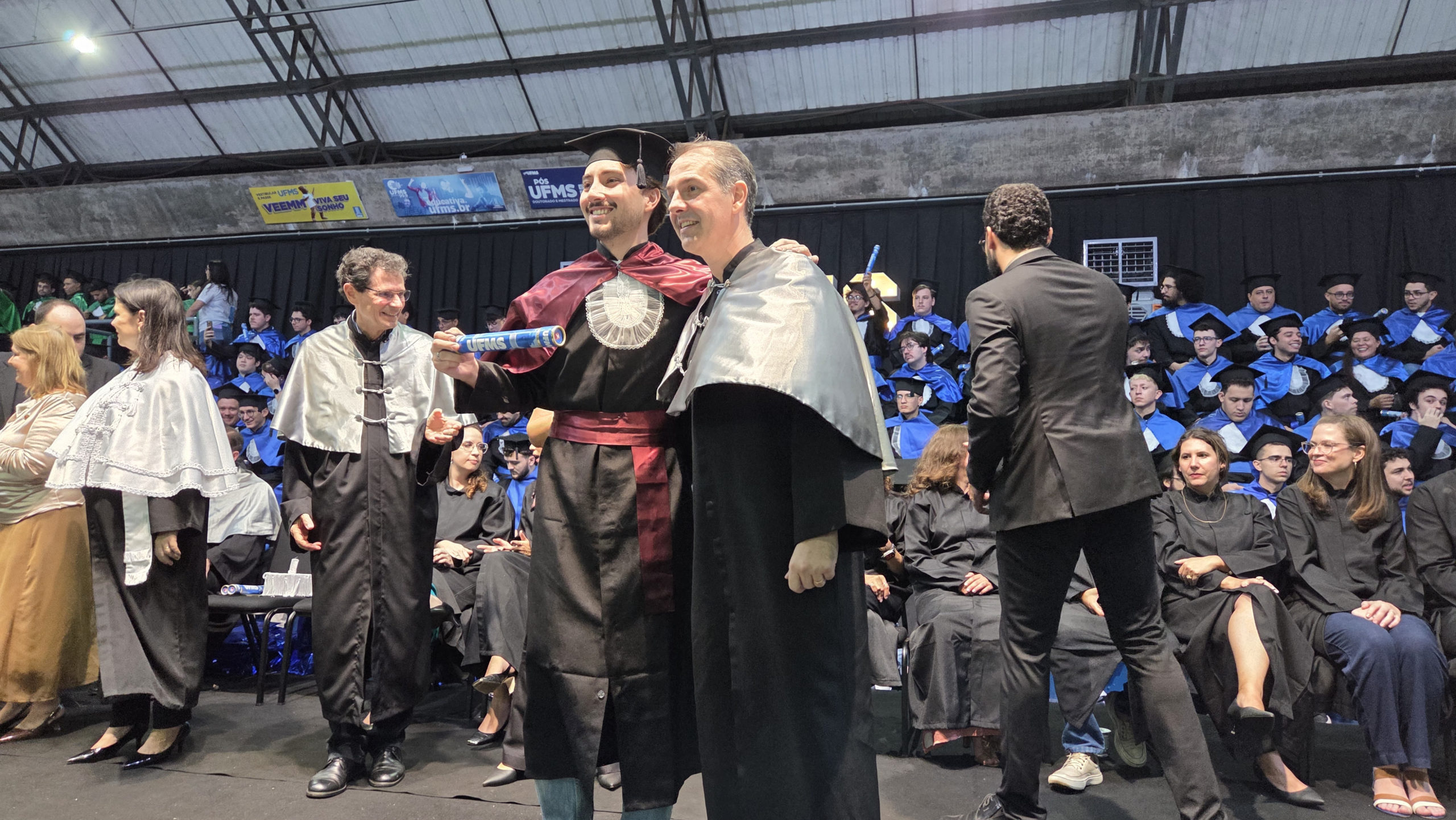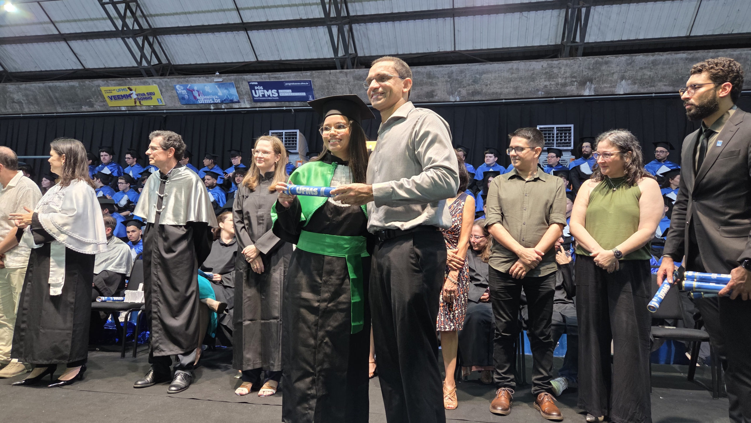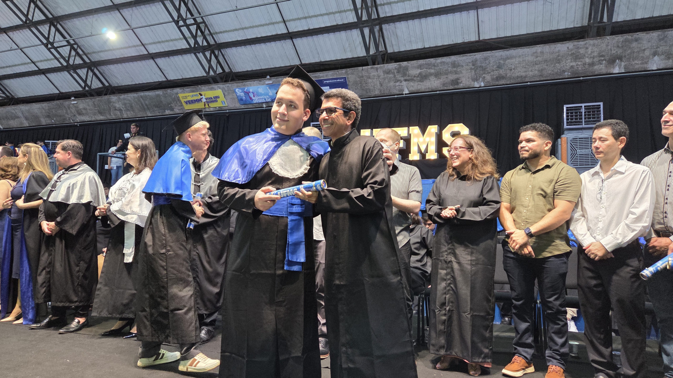 A UFMS de Campo Grande celebrou neste sábado, 13, a cerimônia de colação de grau de 308 formandos da Escola de Administração e Negócios (Esan), das faculdades de Computação (Facom) e de Odontologia (Faodo), além dos institutos de Biociências (Inbio), Matemática (Inma) e Química (Inqui). A solenidade foi realizada no Ginásio Moreninho, com transmissão ao vivo no canal da TV UFMS.
