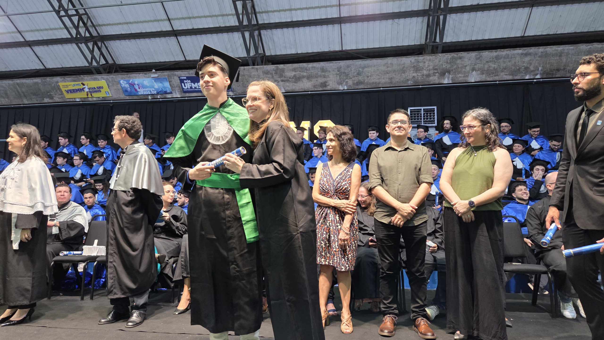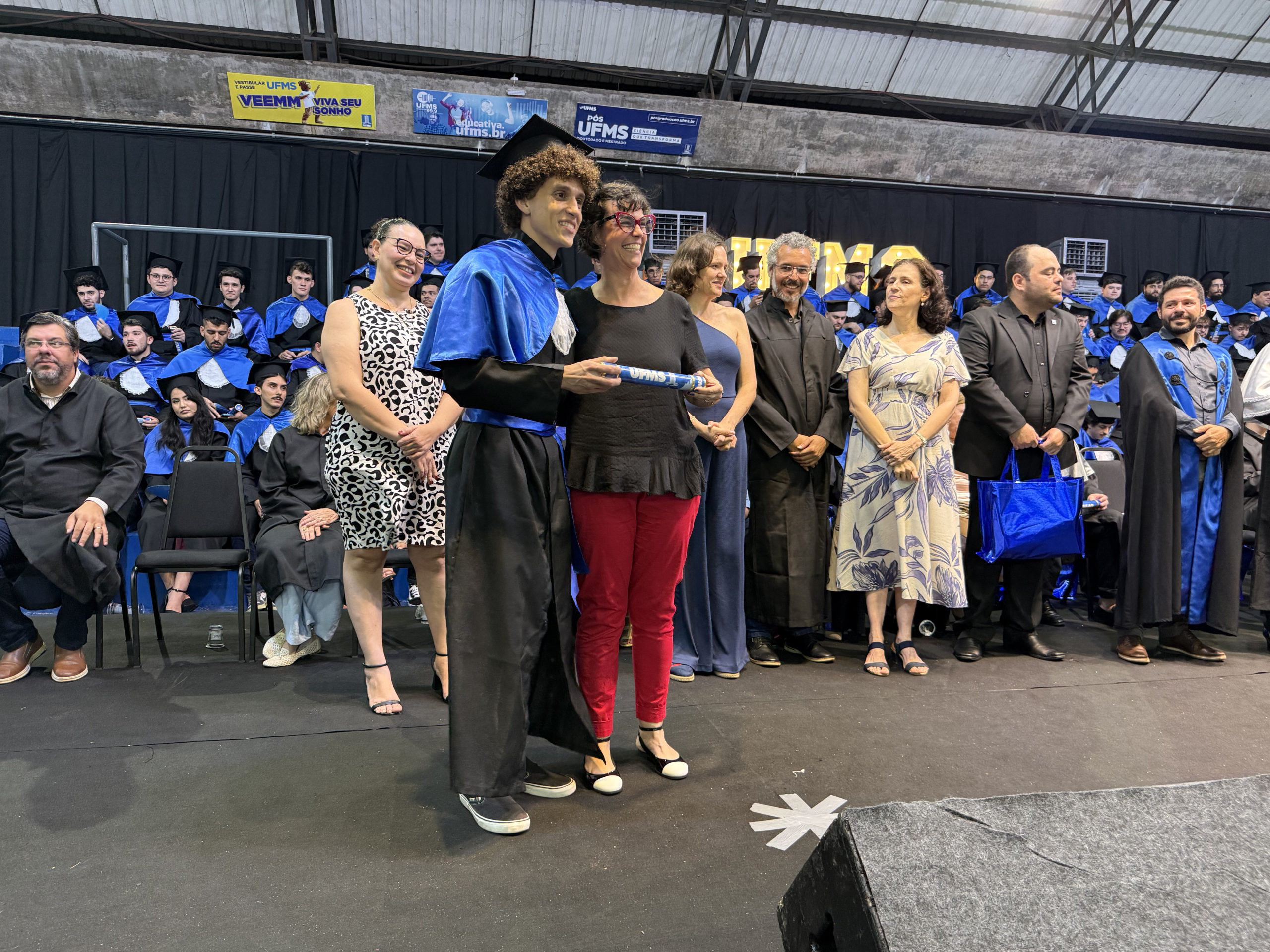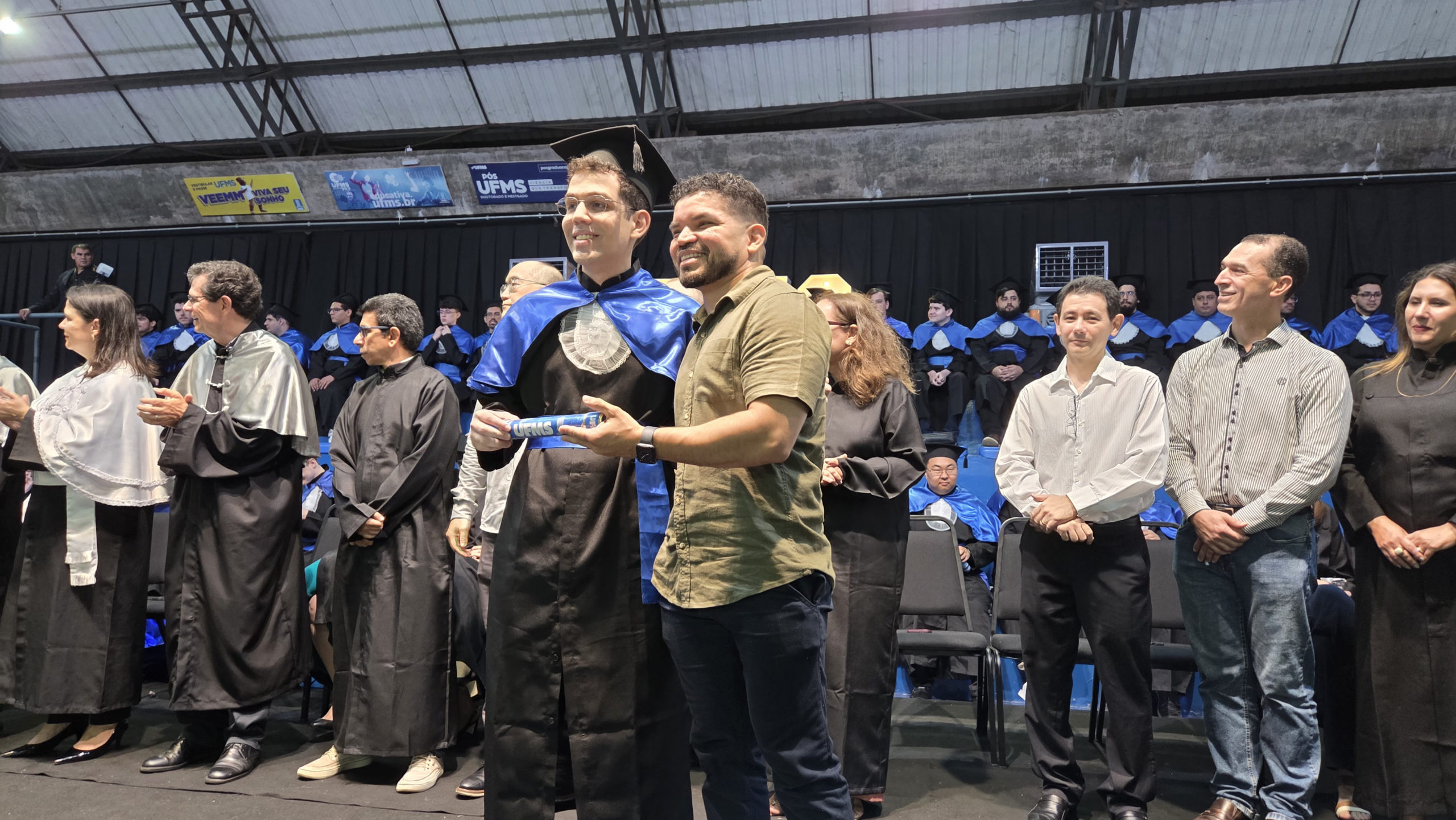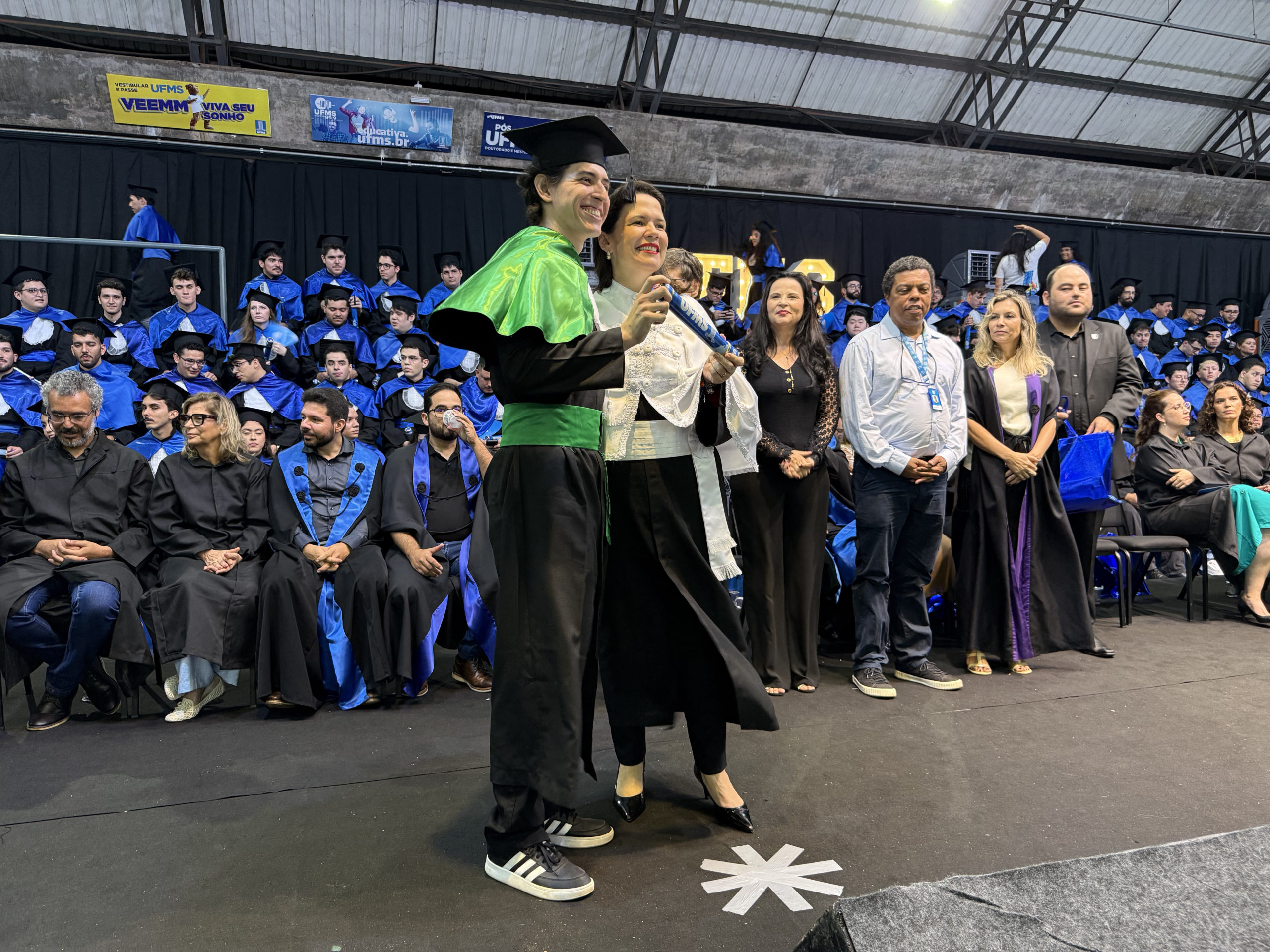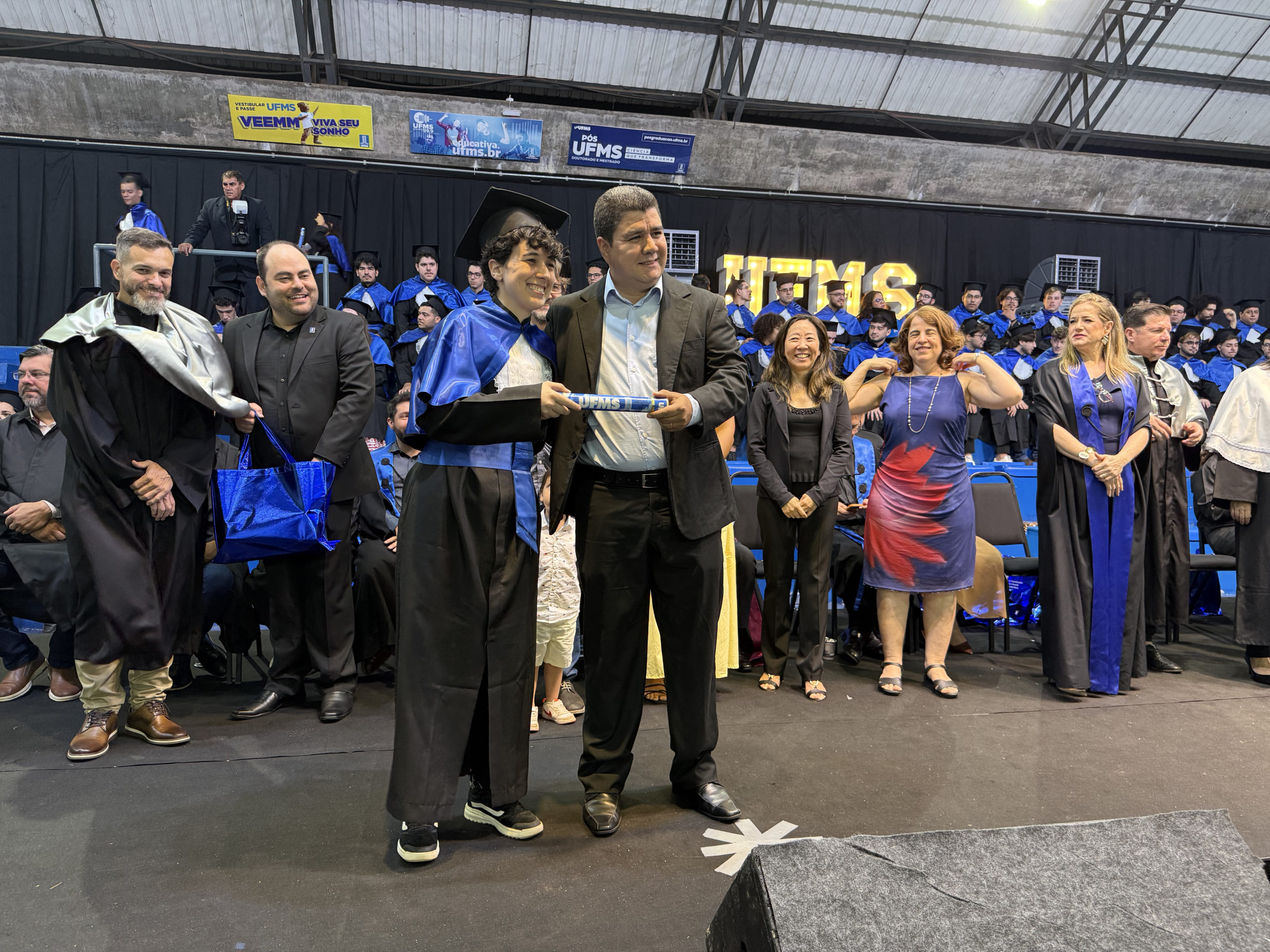 A UFMS de Campo Grande celebrou neste sábado, 13, a cerimônia de colação de grau de 308 formandos da Escola de Administração e Negócios (Esan), das faculdades de Computação (Facom) e de Odontologia (Faodo), além dos institutos de Biociências (Inbio), Matemática (Inma) e Química (Inqui). A solenidade foi realizada no Ginásio Moreninho, com transmissão ao vivo no canal da TV UFMS.