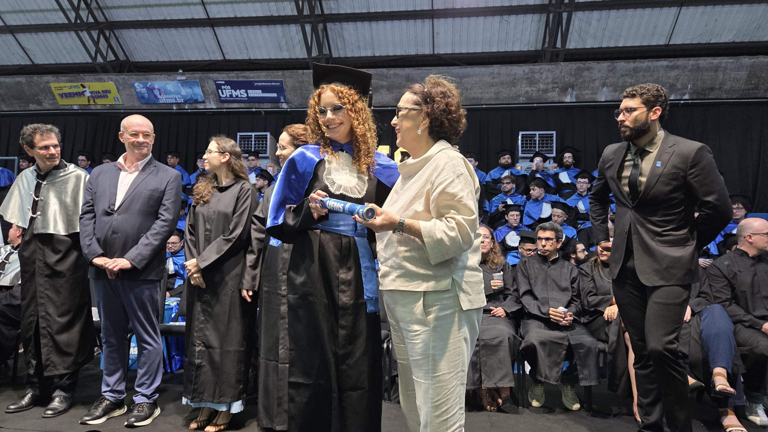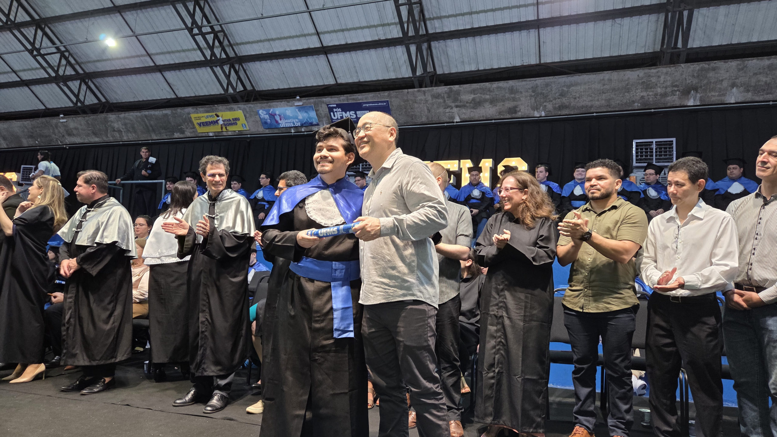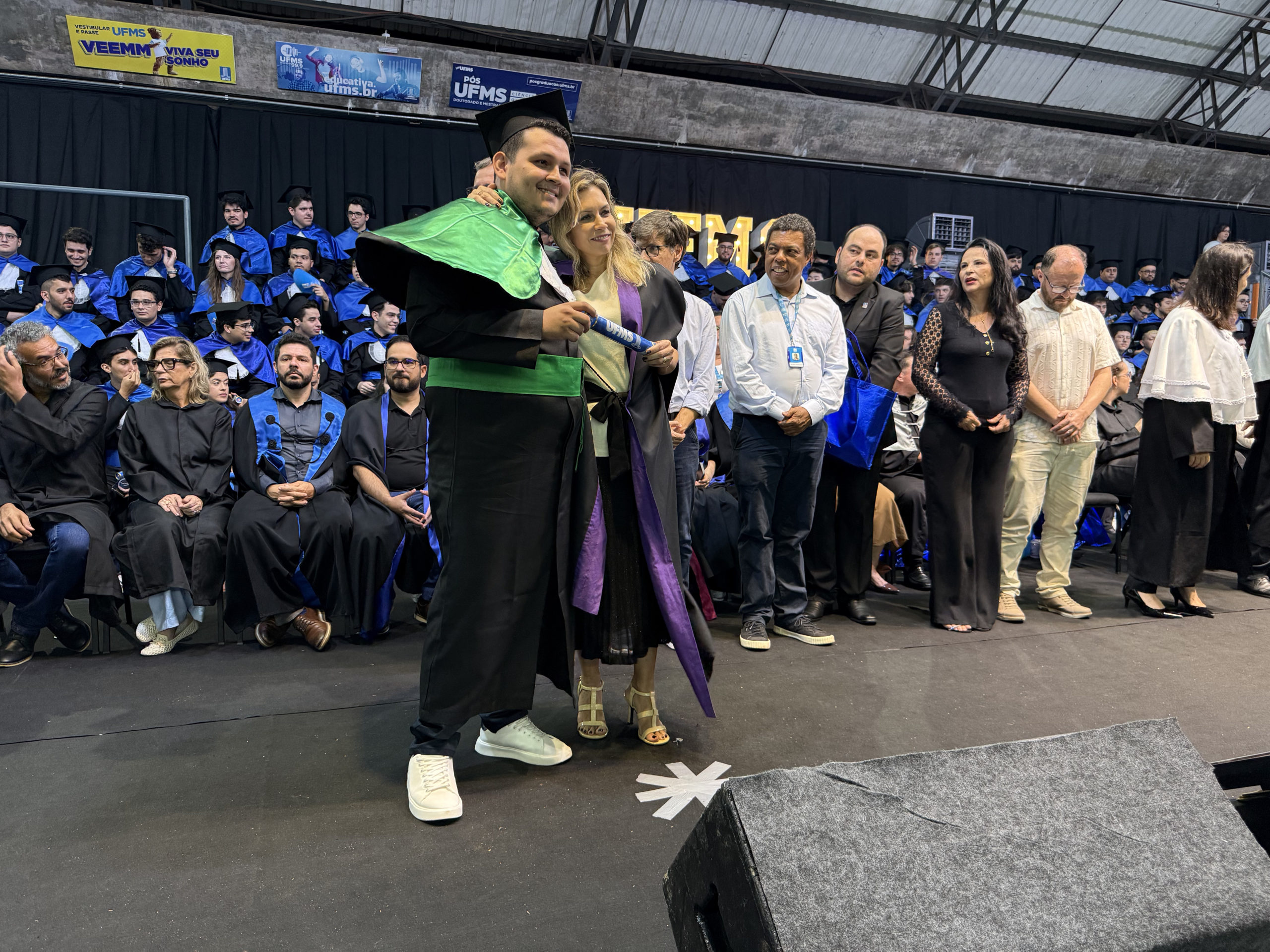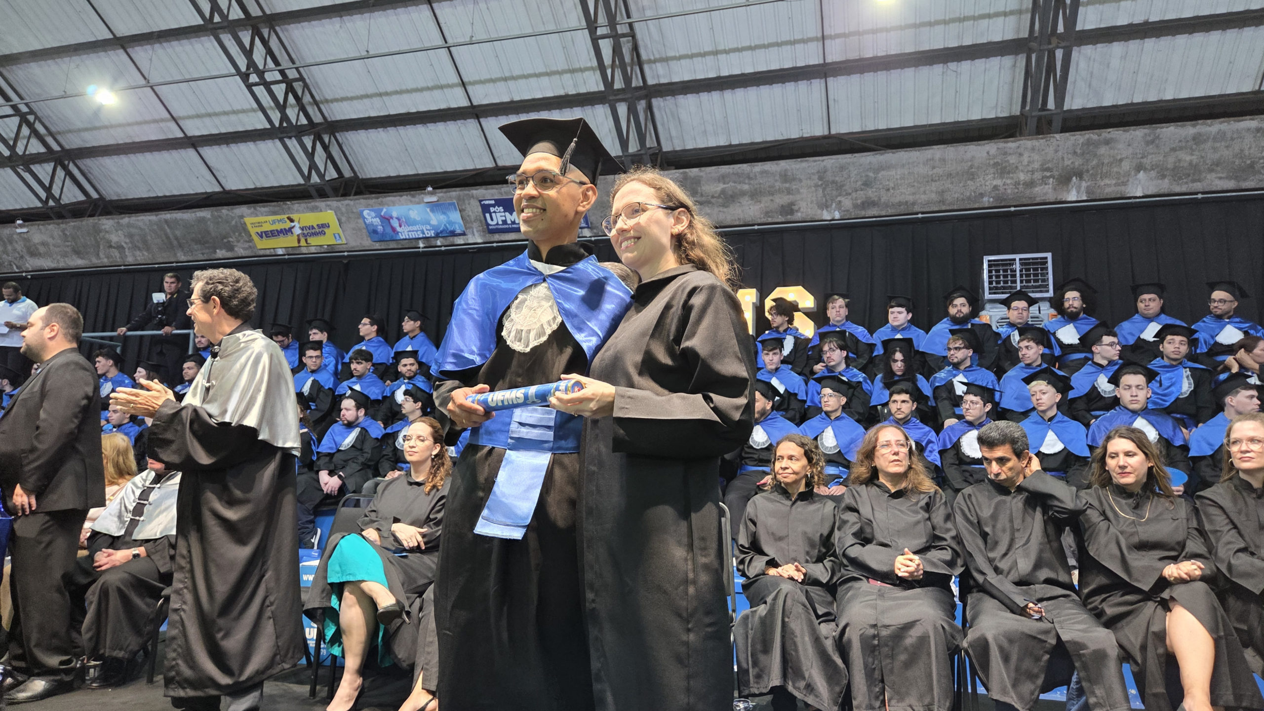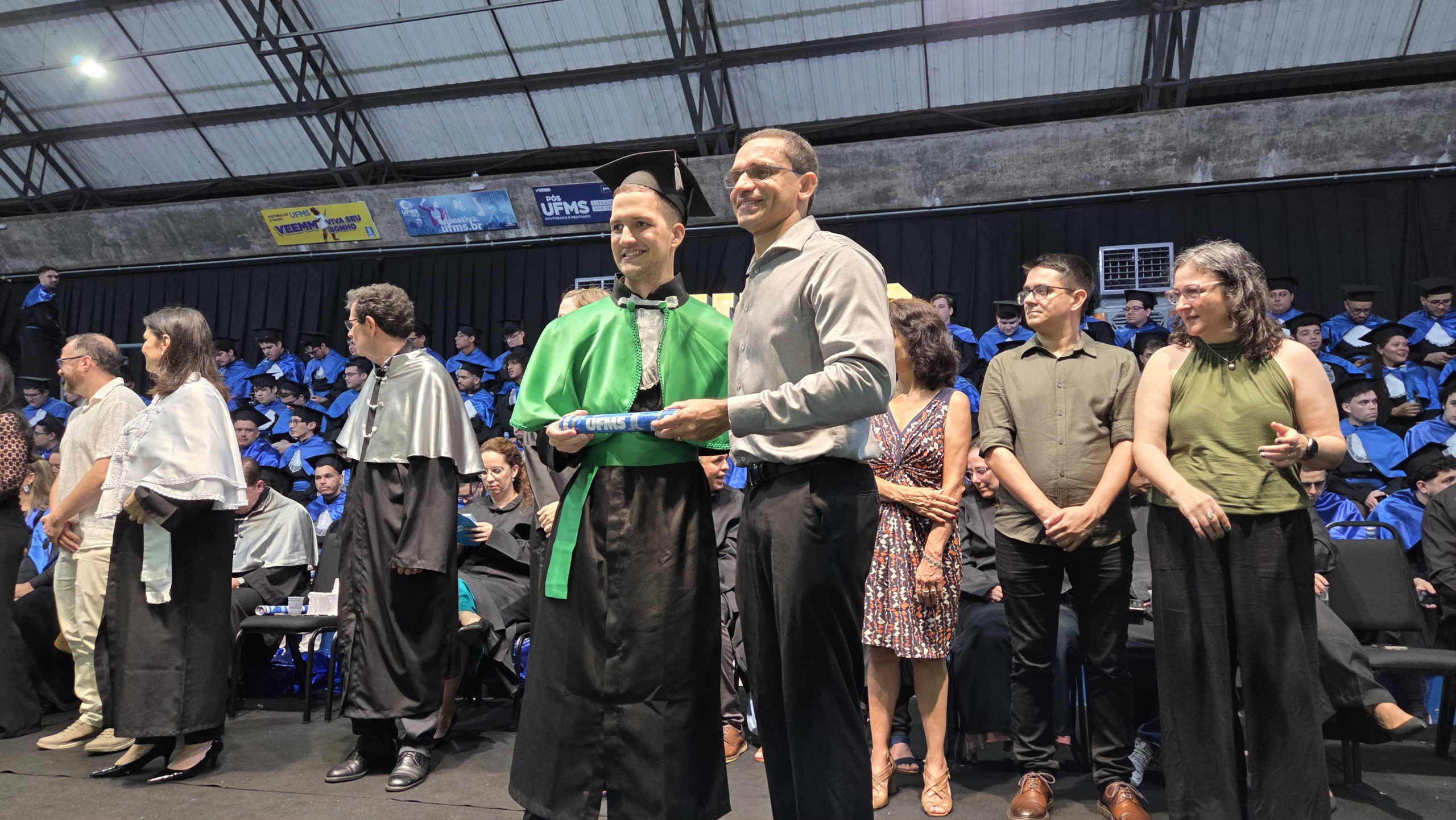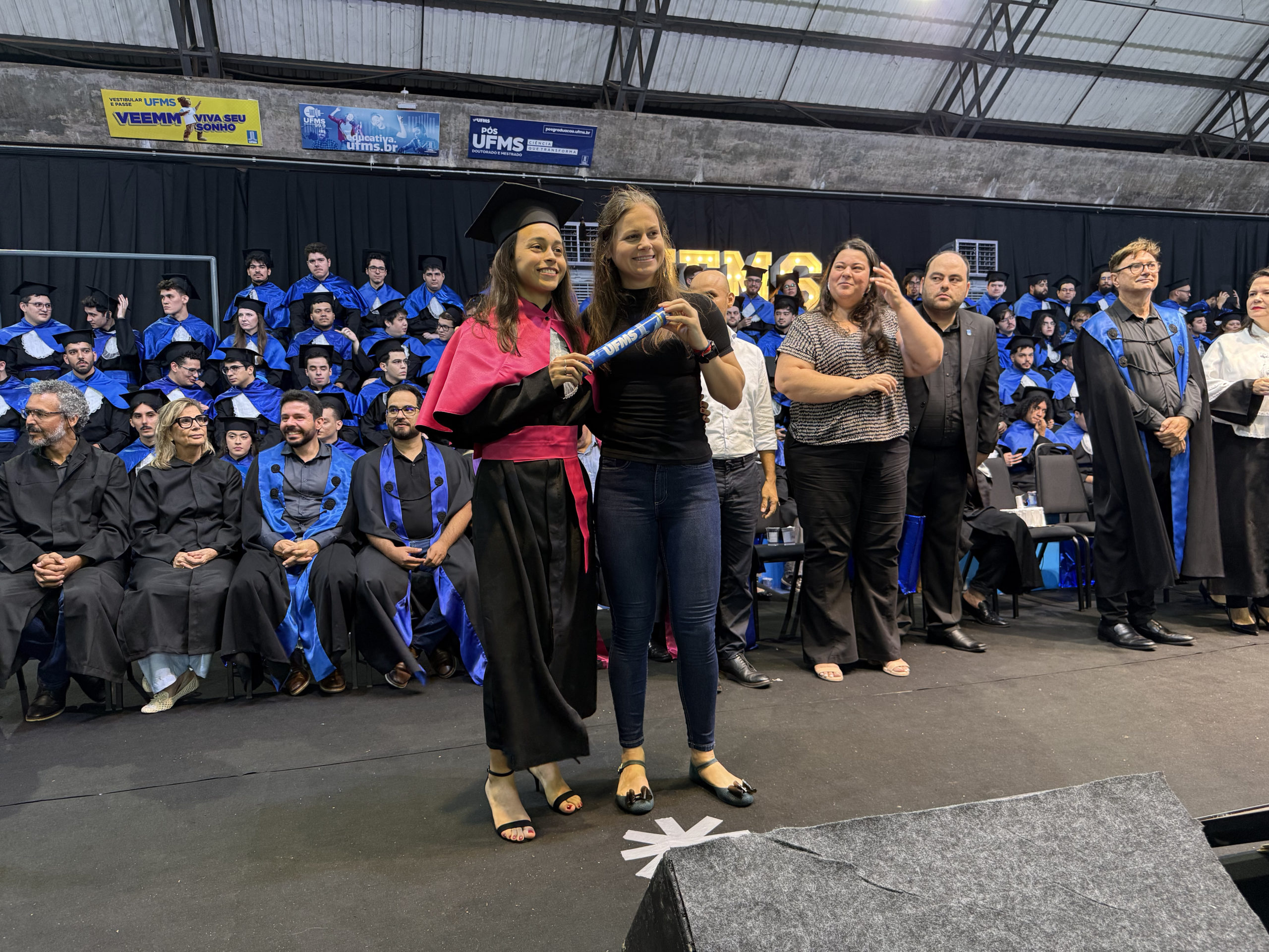 A UFMS de Campo Grande celebrou neste sábado, 13, a cerimônia de colação de grau de 308 formandos da Escola de Administração e Negócios (Esan), das faculdades de Computação (Facom) e de Odontologia (Faodo), além dos institutos de Biociências (Inbio), Matemática (Inma) e Química (Inqui). A solenidade foi realizada no Ginásio Moreninho, com transmissão ao vivo no canal da TV UFMS.