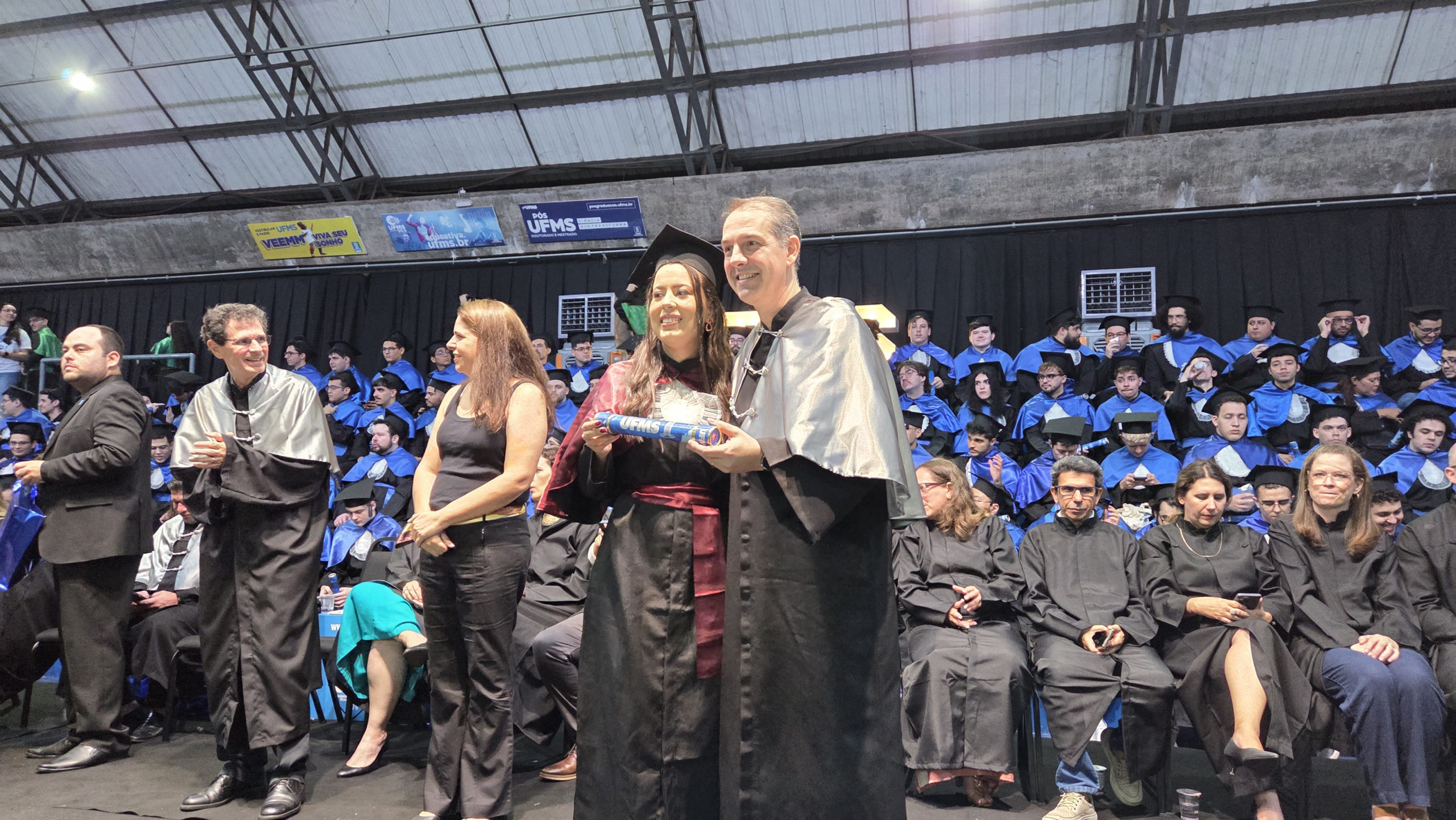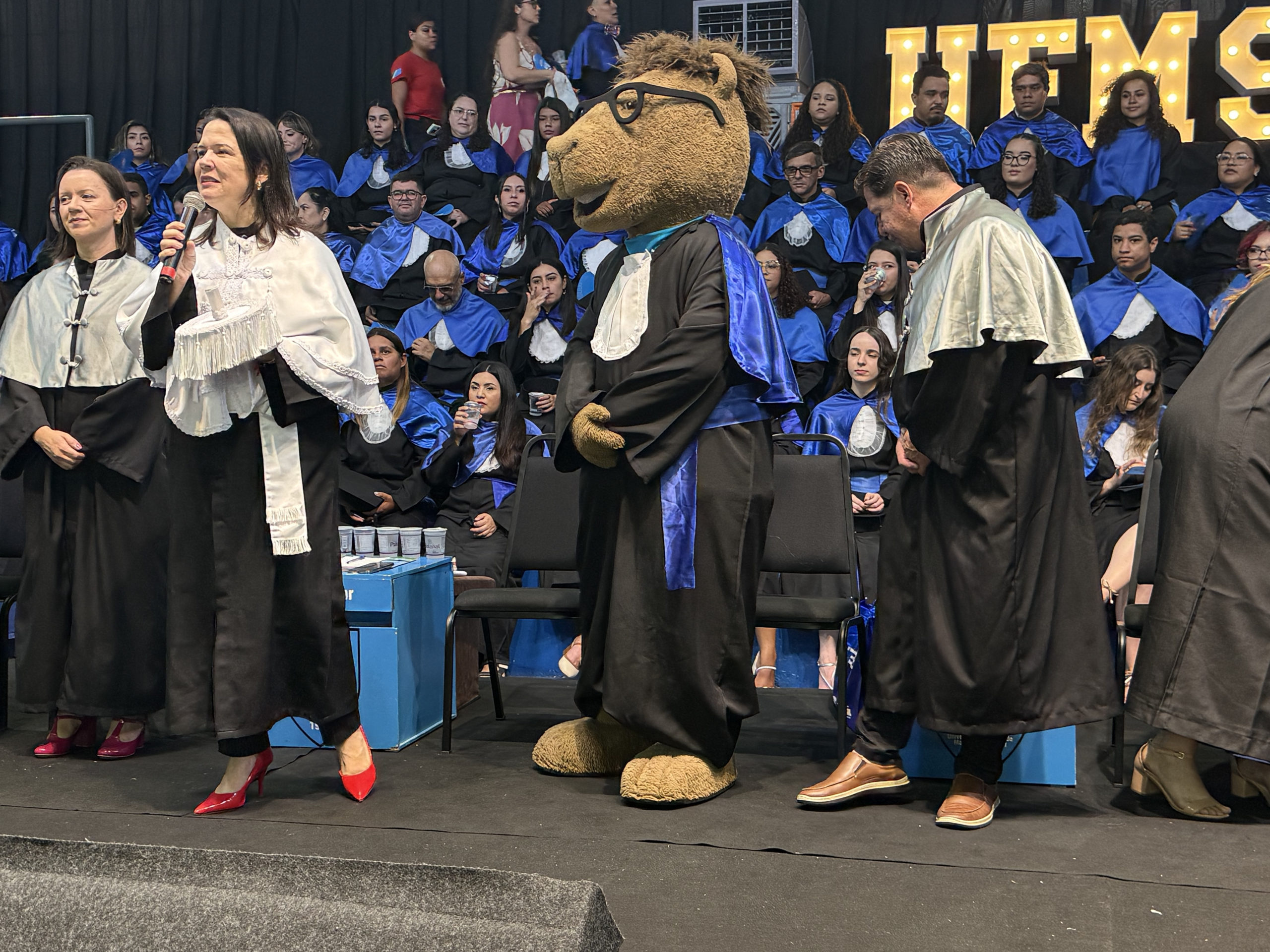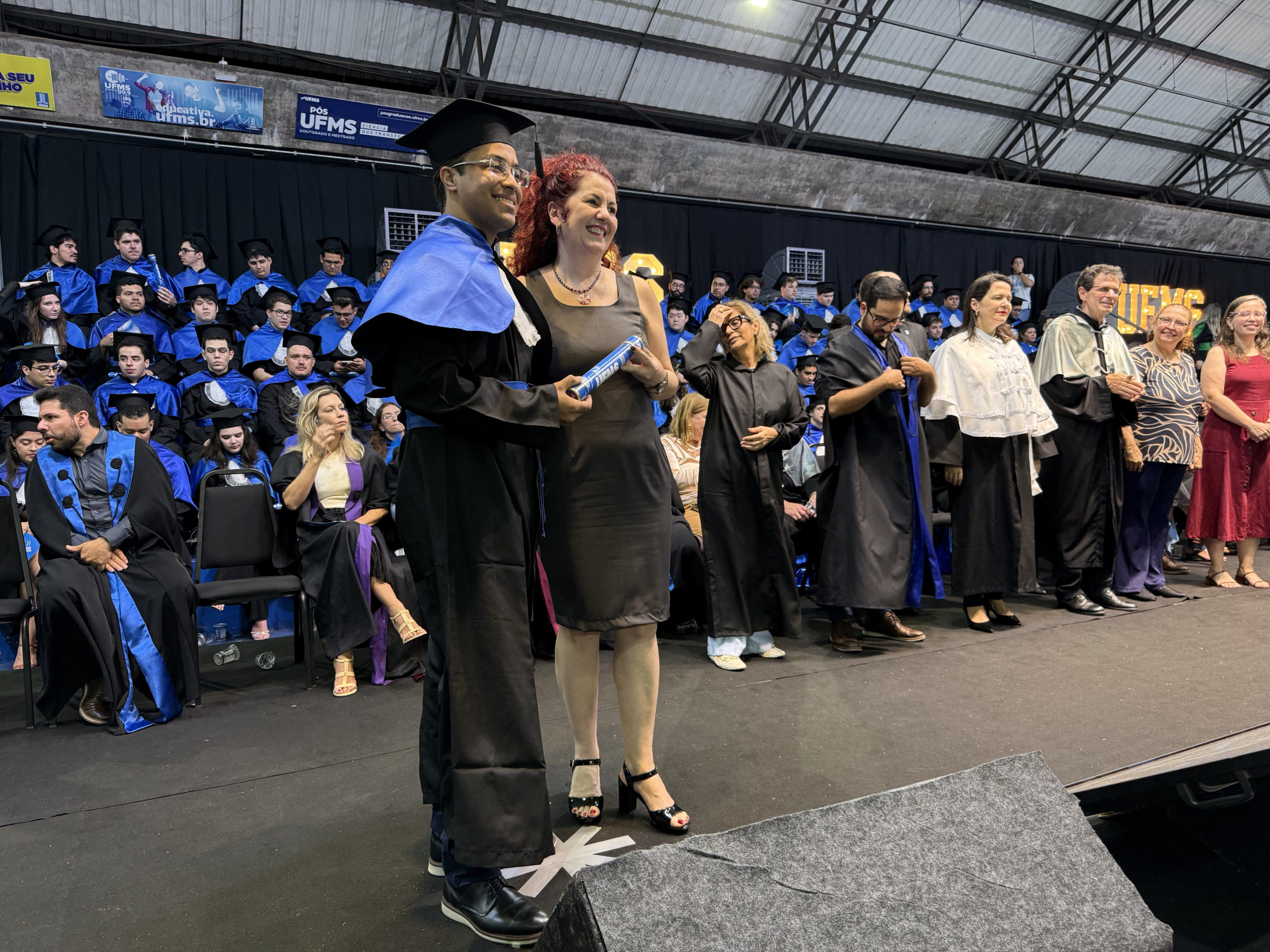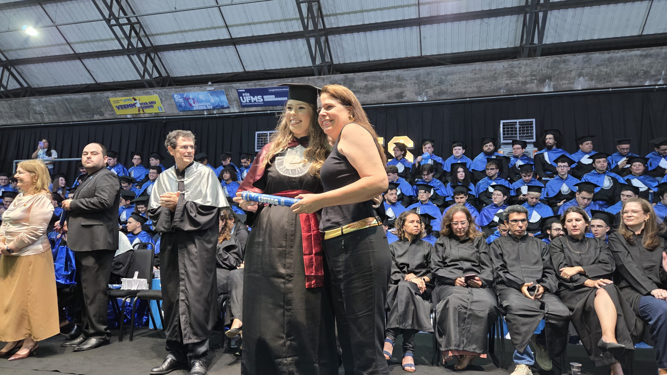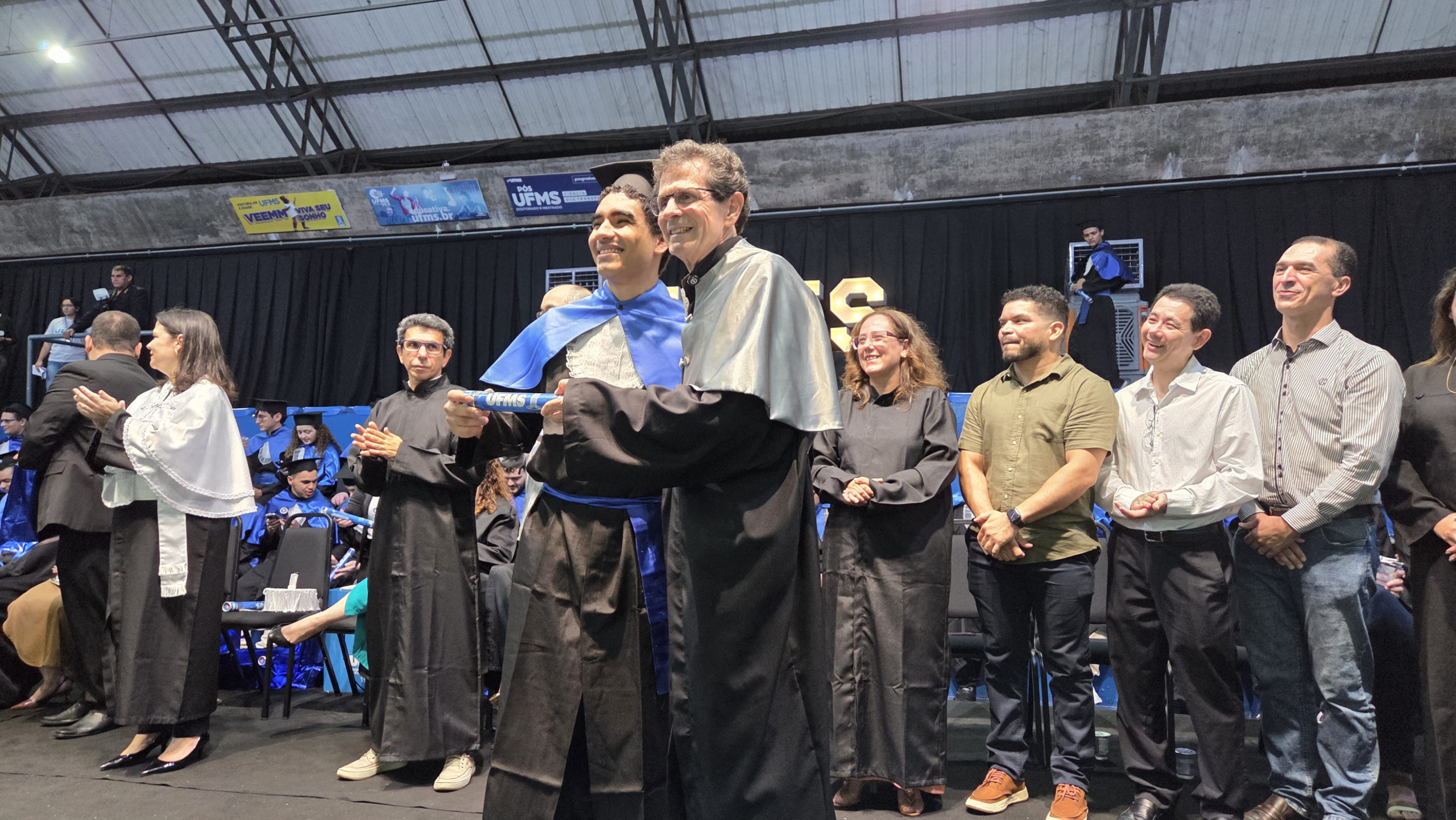 A UFMS de Campo Grande celebrou neste sábado, 13, a cerimônia de colação de grau de 308 formandos da Escola de Administração e Negócios (Esan), das faculdades de Computação (Facom) e de Odontologia (Faodo), além dos institutos de Biociências (Inbio), Matemática (Inma) e Química (Inqui). A solenidade foi realizada no Ginásio Moreninho, com transmissão ao vivo no canal da TV UFMS.