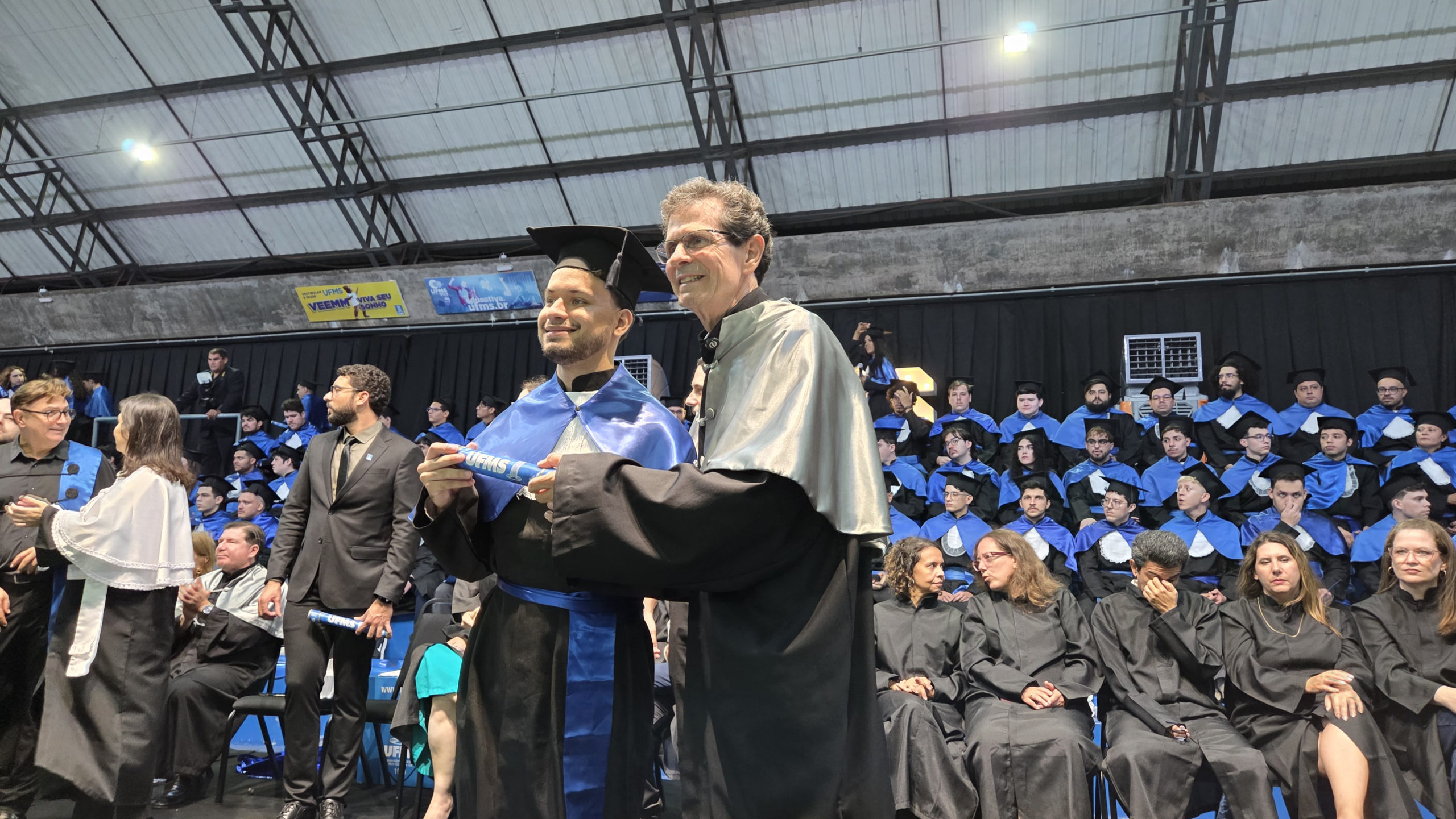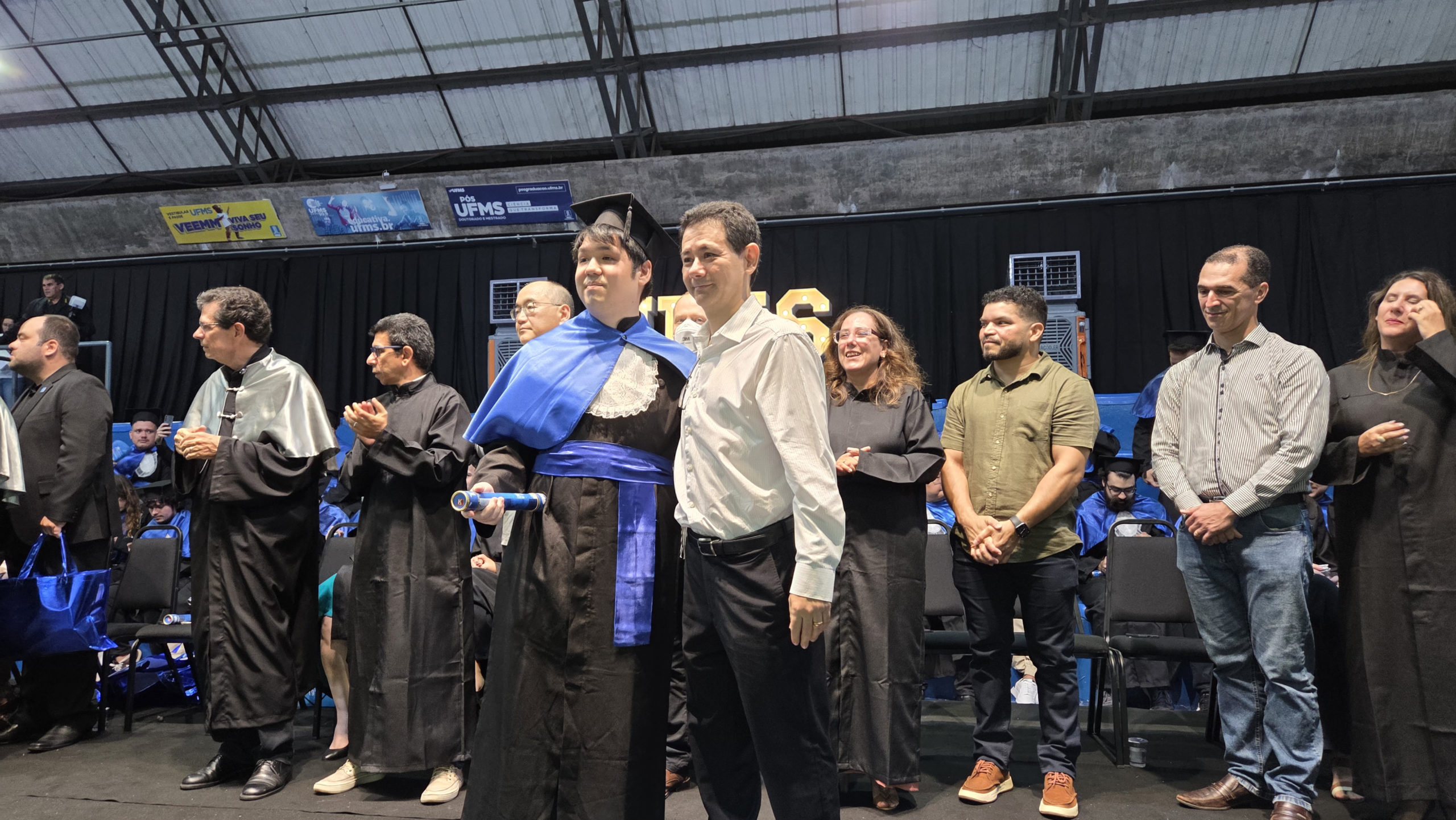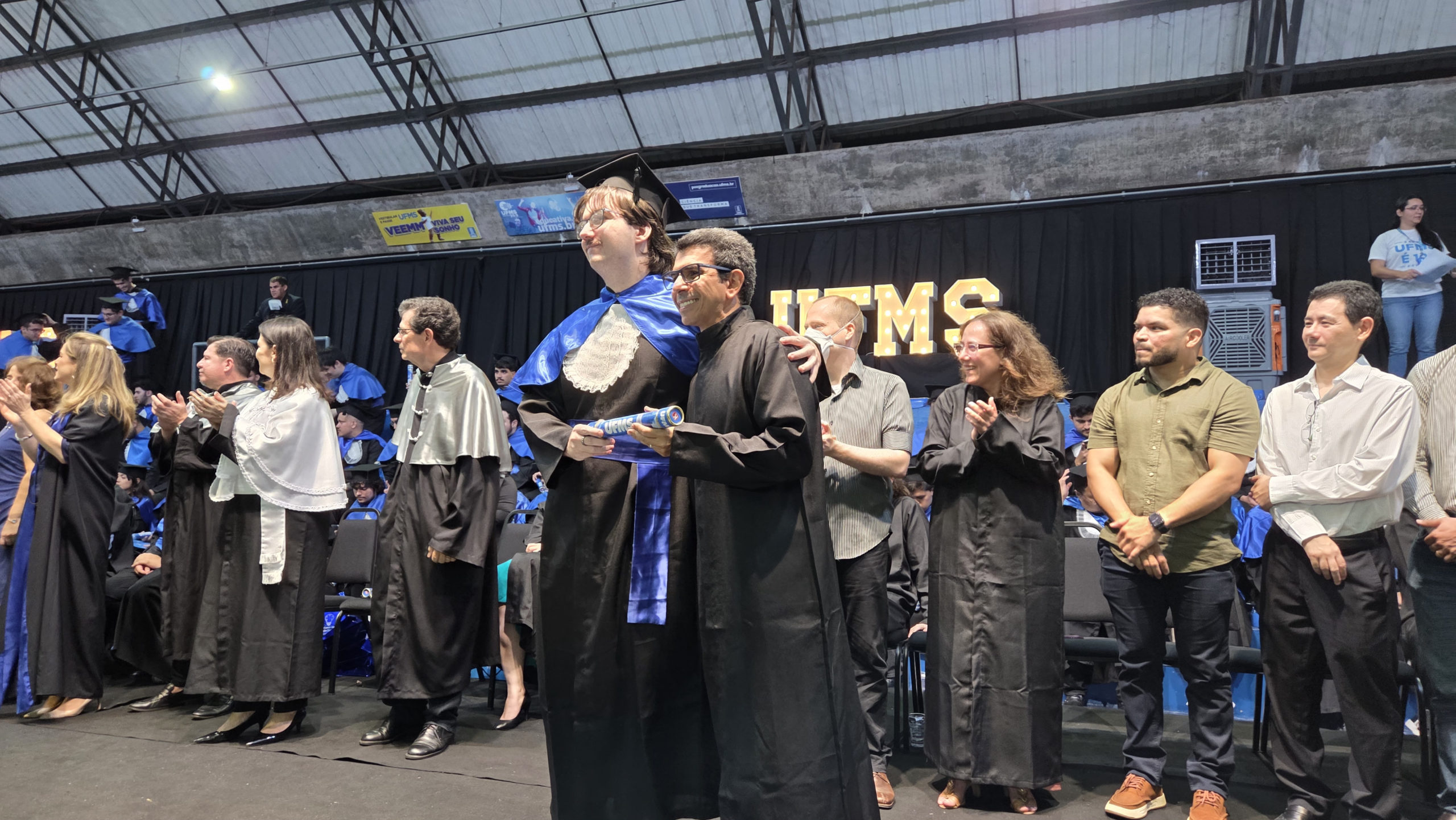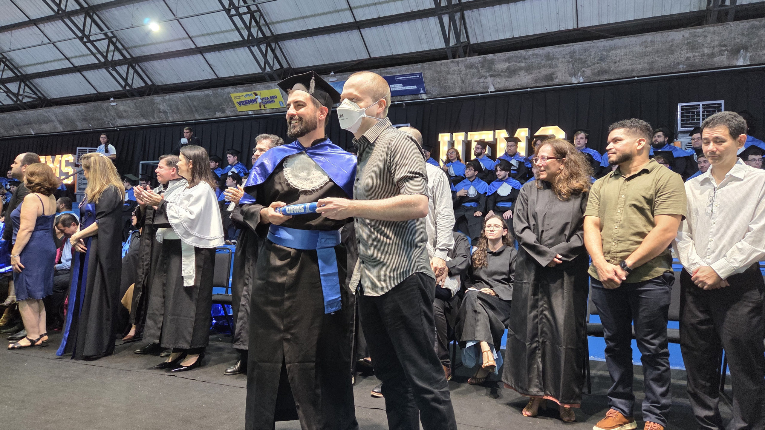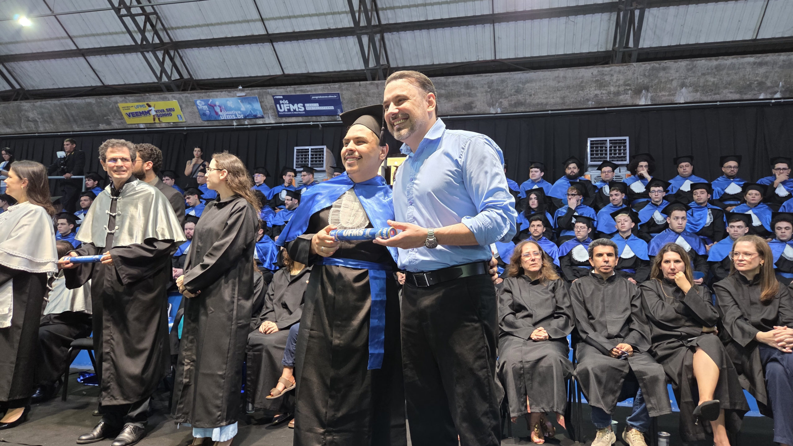 A UFMS de Campo Grande celebrou neste sábado, 13, a cerimônia de colação de grau de 308 formandos da Escola de Administração e Negócios (Esan), das faculdades de Computação (Facom) e de Odontologia (Faodo), além dos institutos de Biociências (Inbio), Matemática (Inma) e Química (Inqui). A solenidade foi realizada no Ginásio Moreninho, com transmissão ao vivo no canal da TV UFMS.