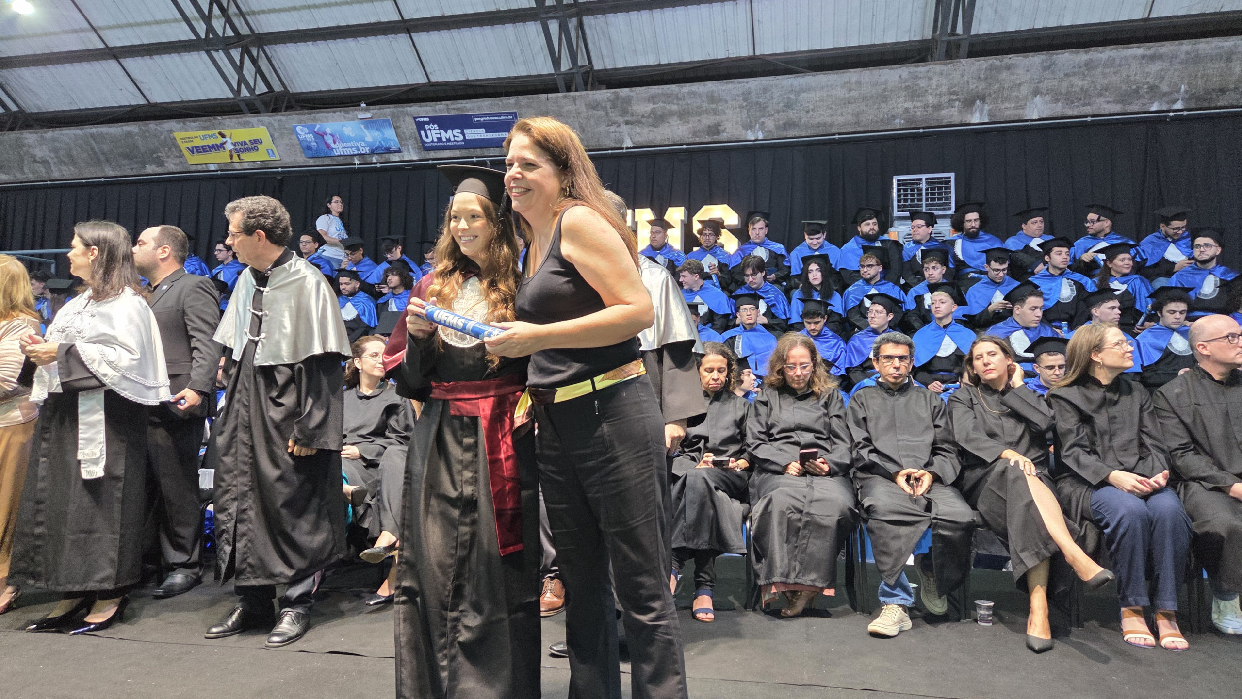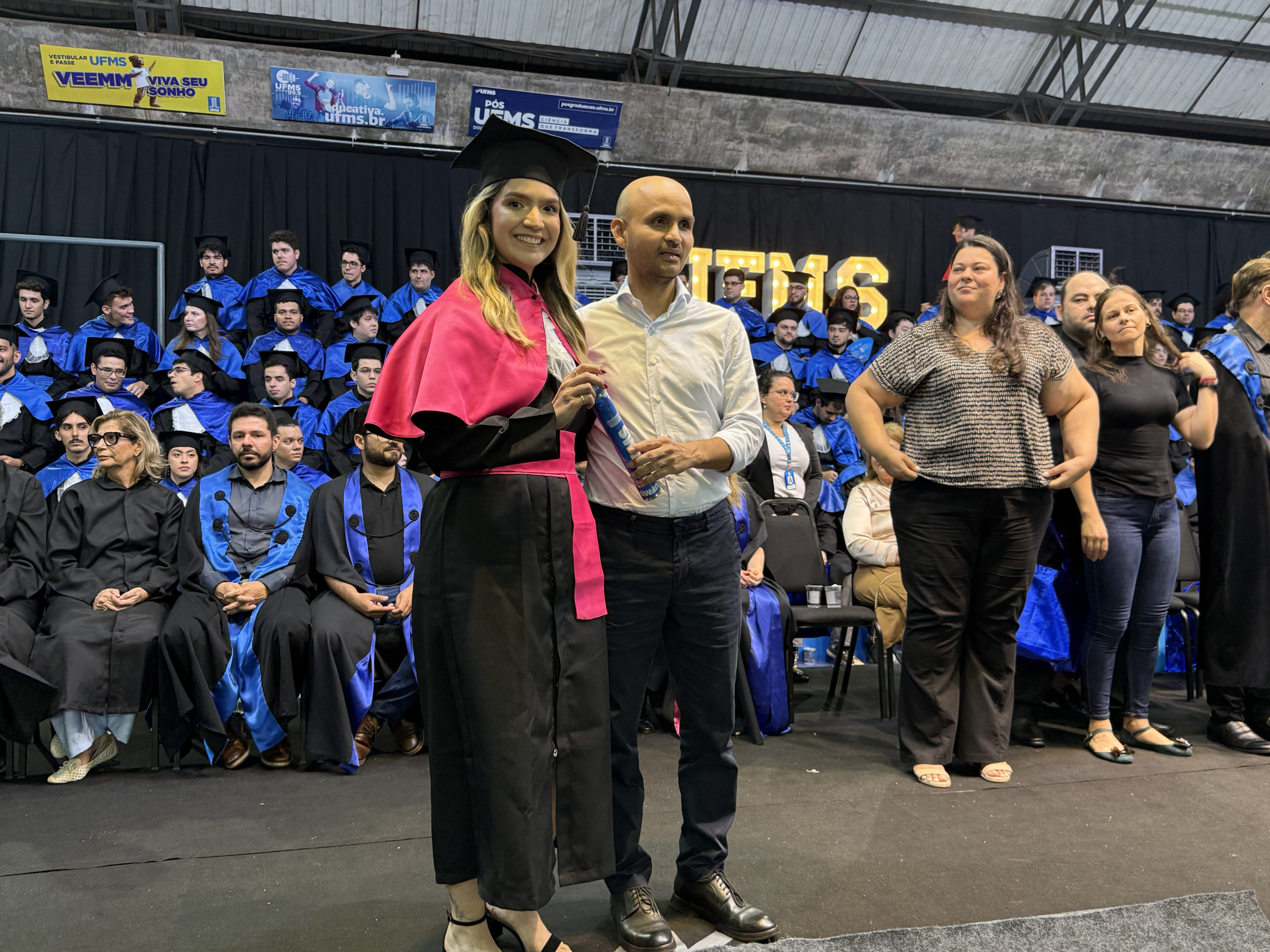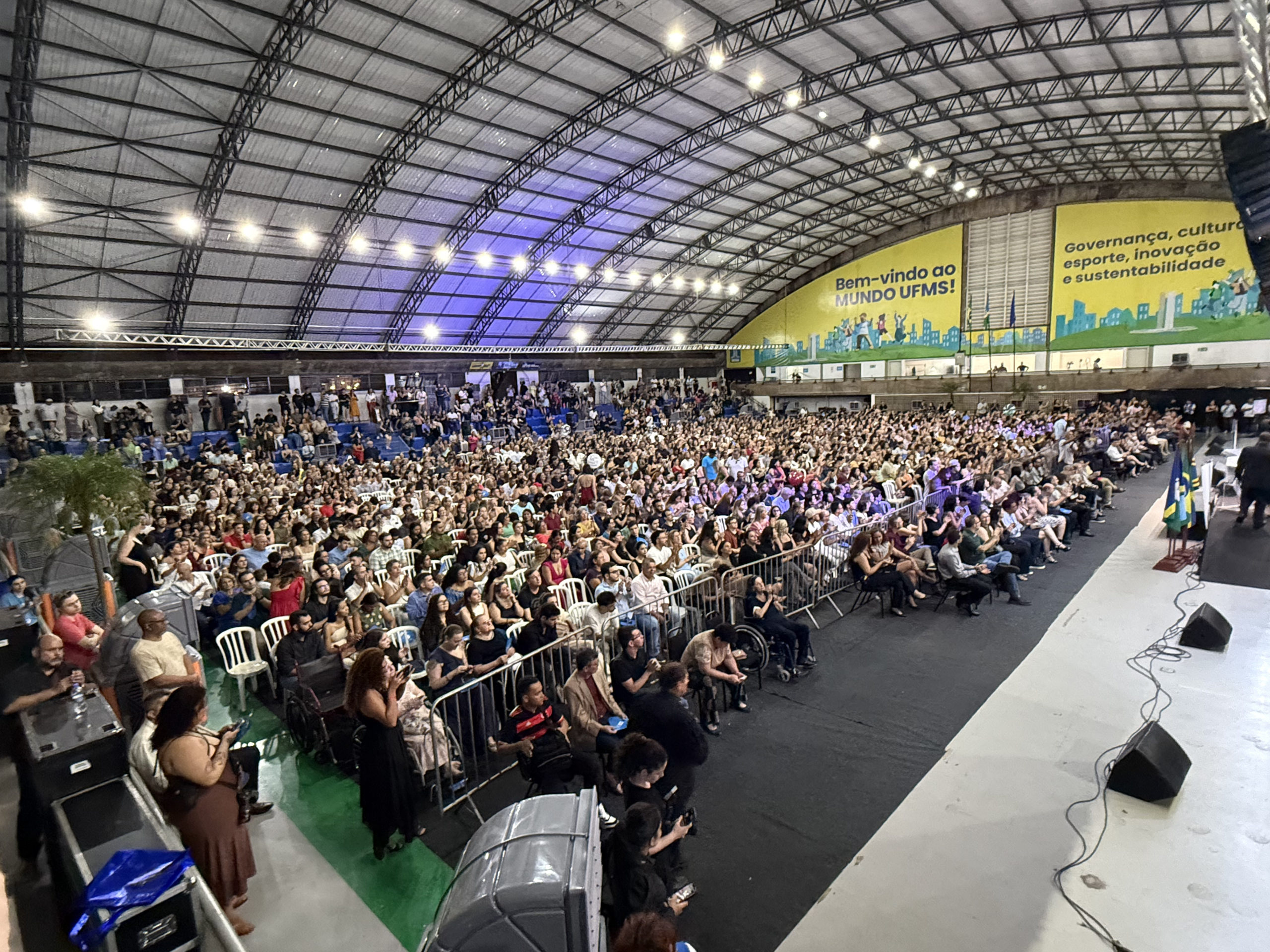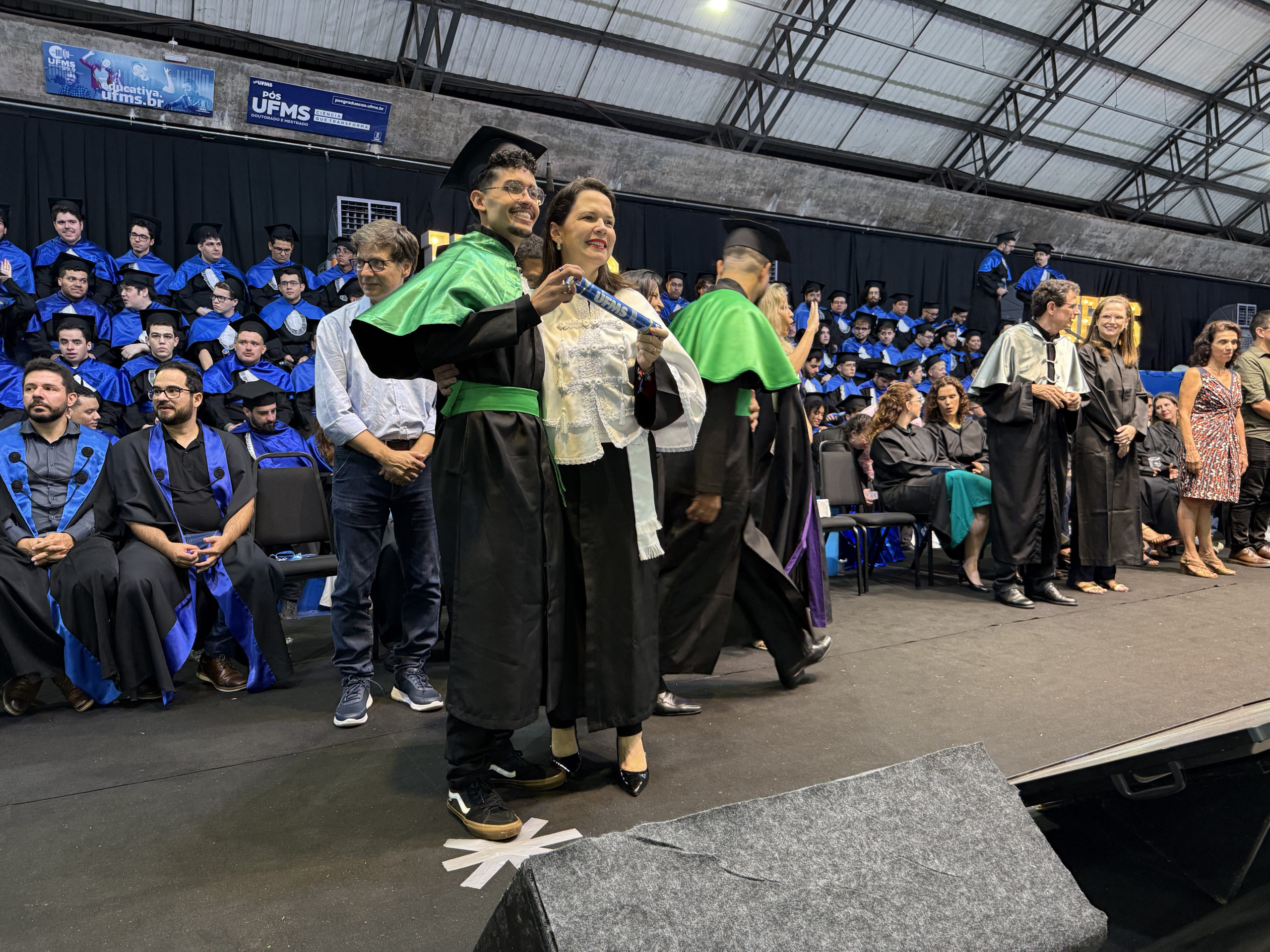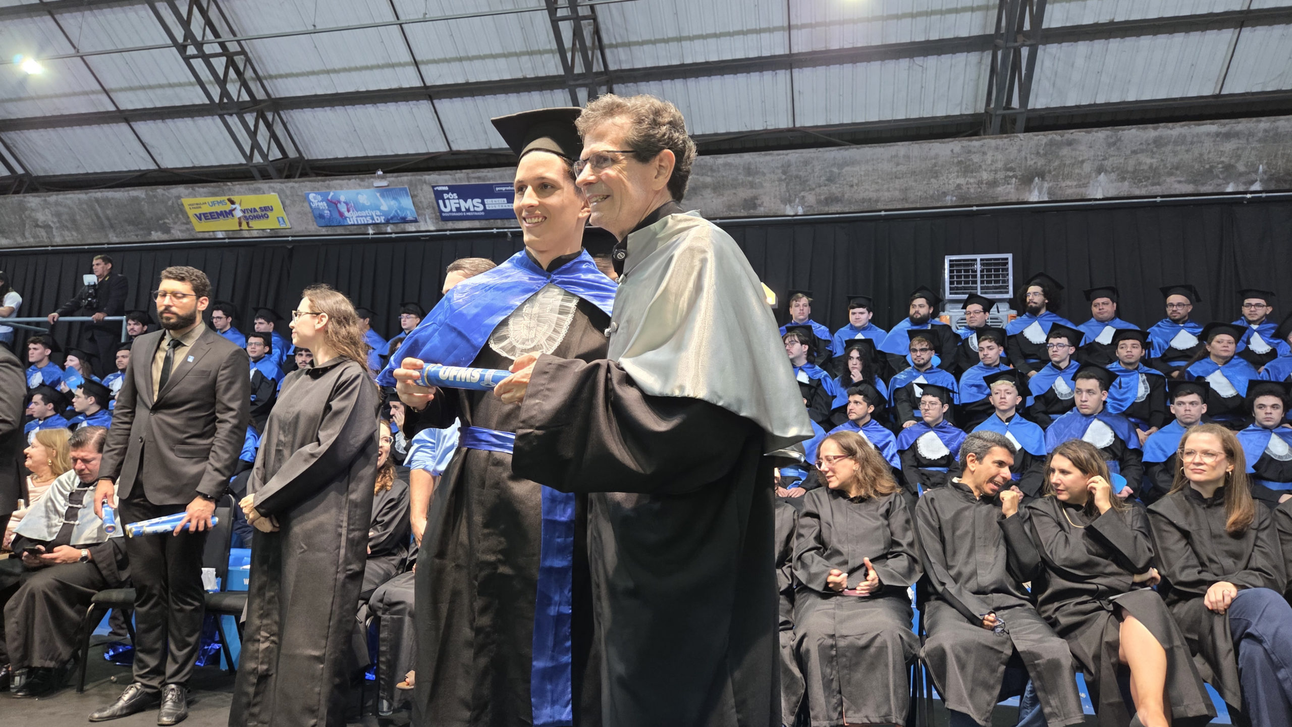 A UFMS de Campo Grande celebrou neste sábado, 13, a cerimônia de colação de grau de 308 formandos da Escola de Administração e Negócios (Esan), das faculdades de Computação (Facom) e de Odontologia (Faodo), além dos institutos de Biociências (Inbio), Matemática (Inma) e Química (Inqui). A solenidade foi realizada no Ginásio Moreninho, com transmissão ao vivo no canal da TV UFMS.