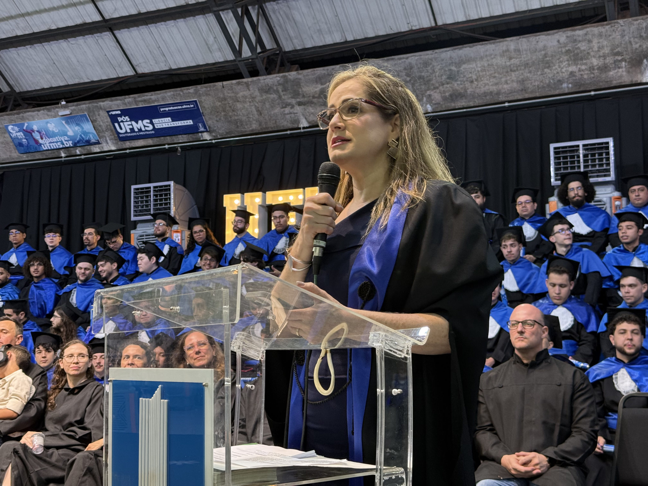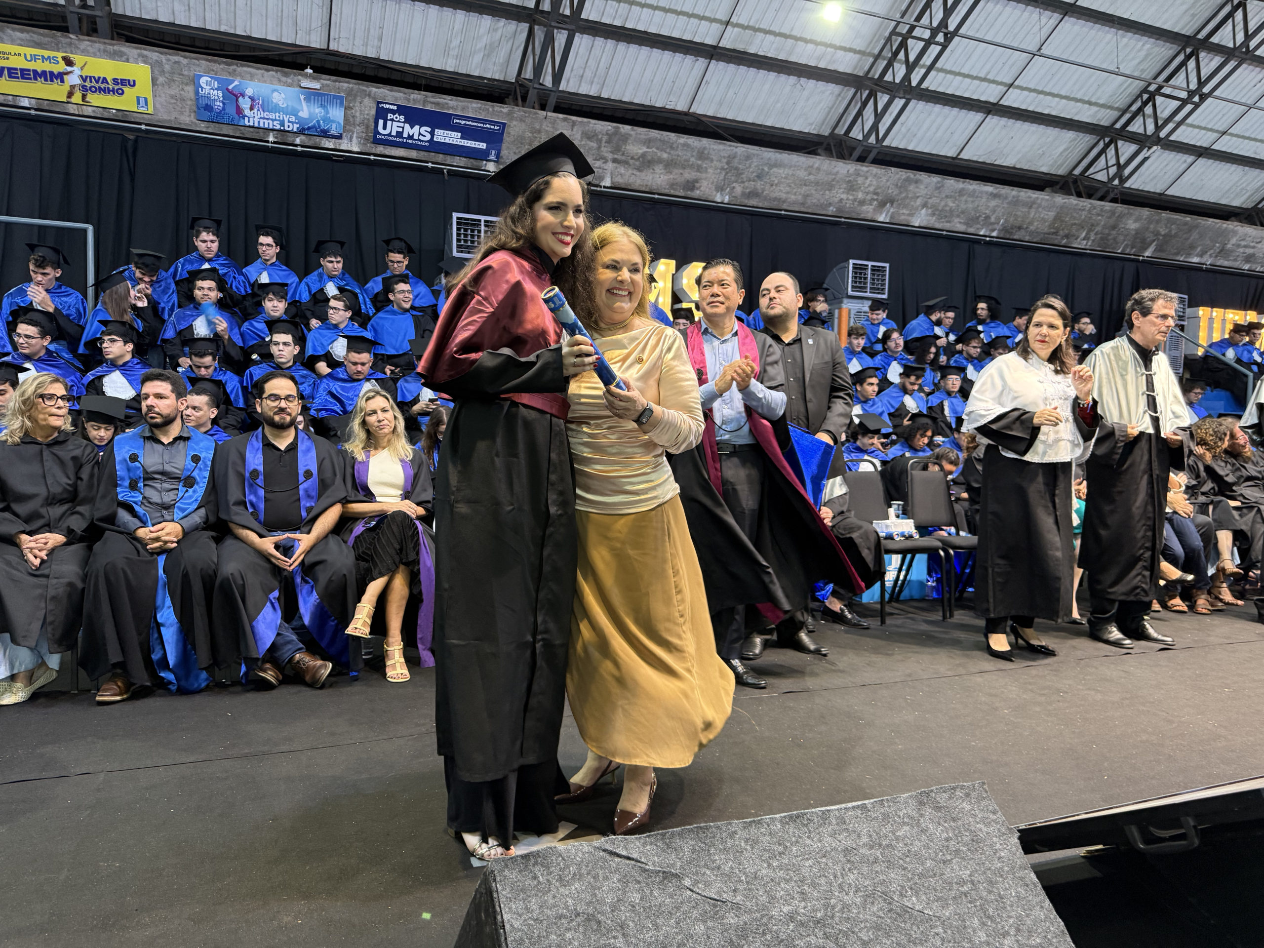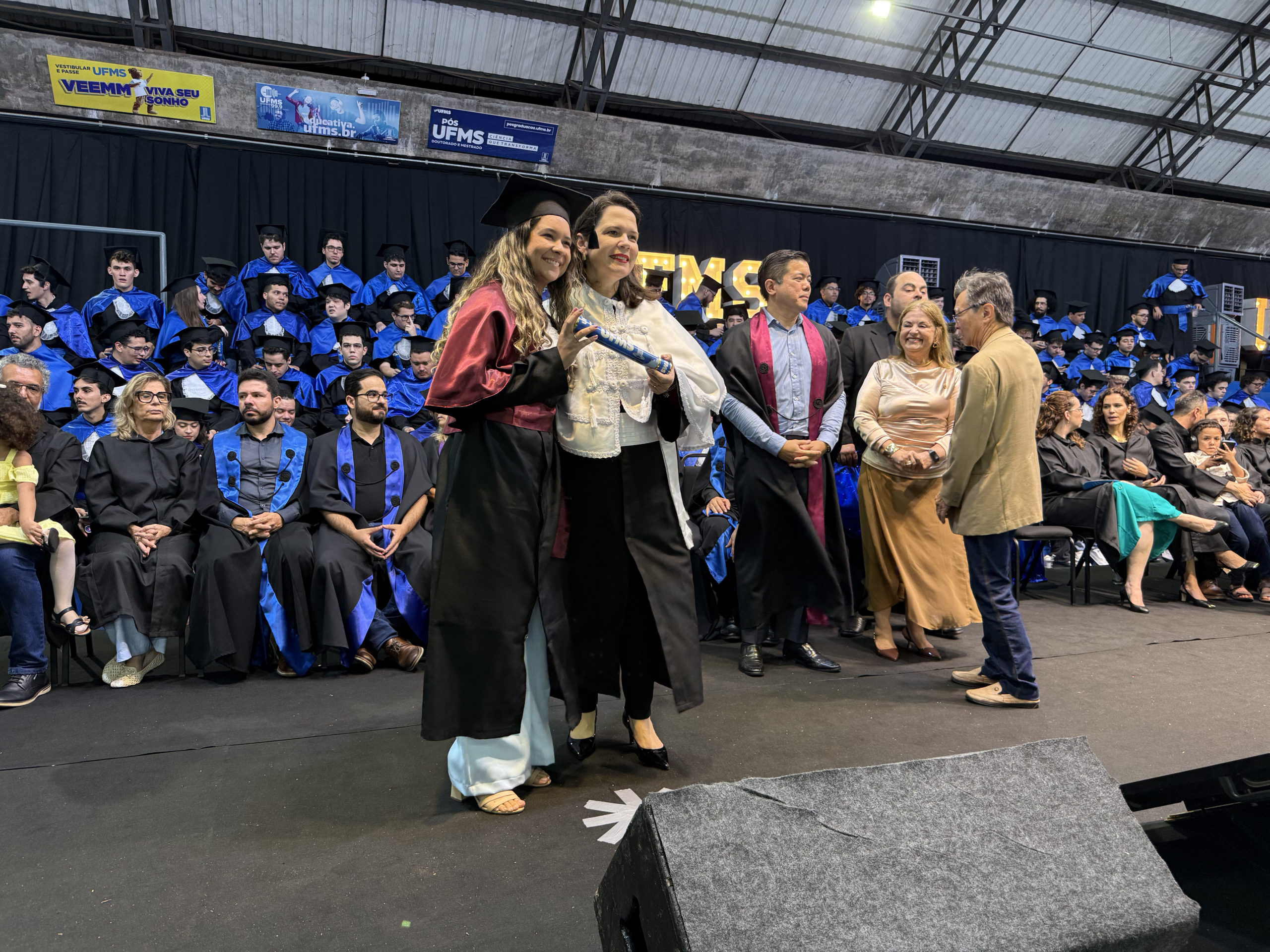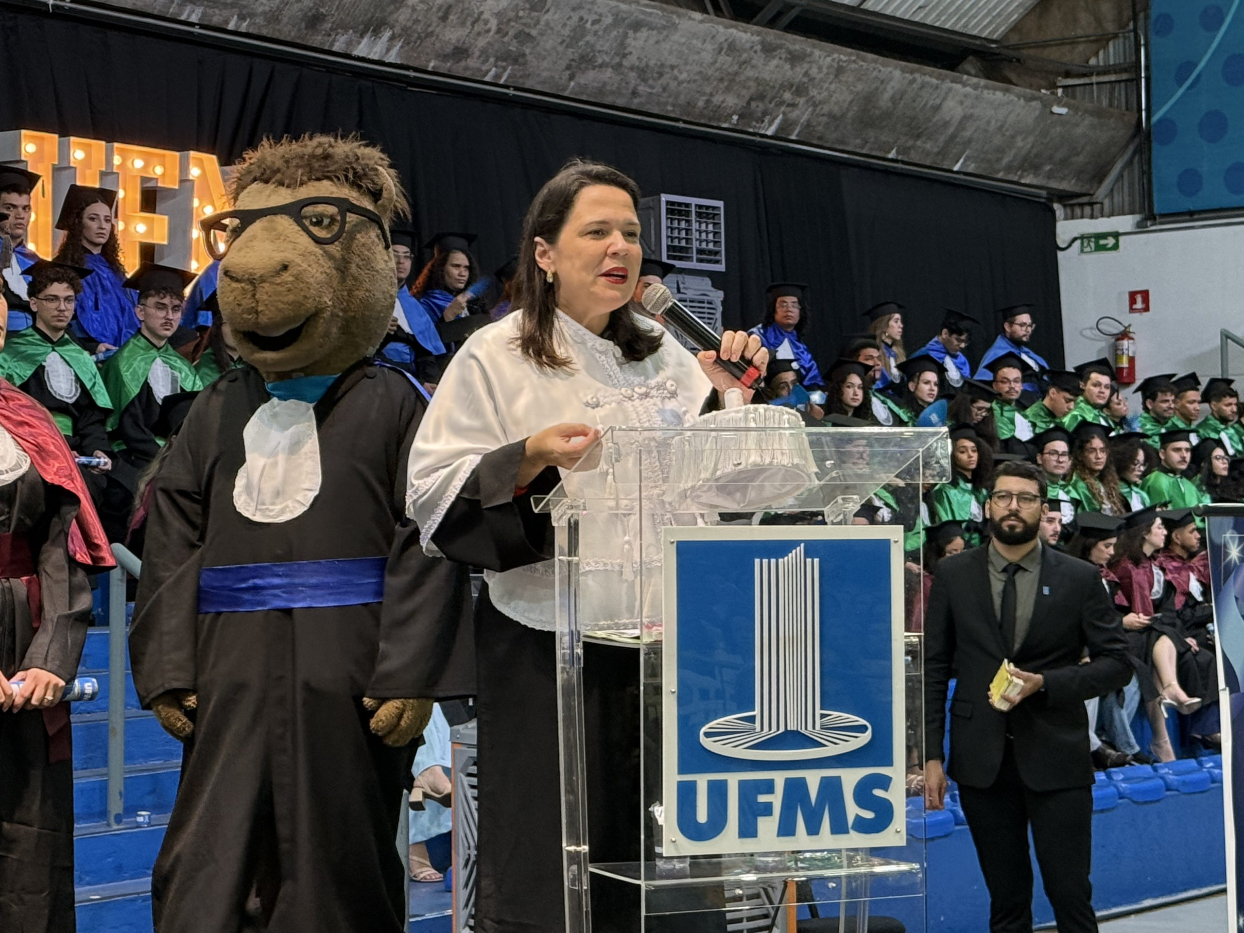 A reitora Camila Ítavo celebrou a conquista dos formandos. “Isso é UFMS, essa é a força da qualidade do ensino de uma Universidade que não é nota 10, é nota mil, mas pelo esforço de todos nós. De todos os estudantes, porque não é fácil, […] mas a gente tem certeza da qualidade que todos nós, professores e técnicos, dedicamos a cada um de vocês”, afirmou. A reitora ainda comemorou a inovação das cerimônias de todos os câmpus ainda em dezembro e parabenizou a todos. “Nós conseguimos bater um recorde de formandos e formandos na nossa Universidades, estamos com 18 cerimônias como estas em todo o Estado. Esse é o momento de agradecer e hoje o que estamos fazendo aqui é celebrando, é o momento de celebrar. Eu fiquei super feliz que ao ouvir os colegas, vocês ficaram felizes pelos colegas, isso é algo que passa a formação técnica, é a formação humana, cidadã, íntegra, que nós realmente confiamos que atuamos desse jeito na nossa Universidade. A gente tem que celebrar esses momentos porque momentos difíceis ocorrerão, mas os momentos que a gente pode comemorar, a gente tem que fortalecer”, acrescentou.
