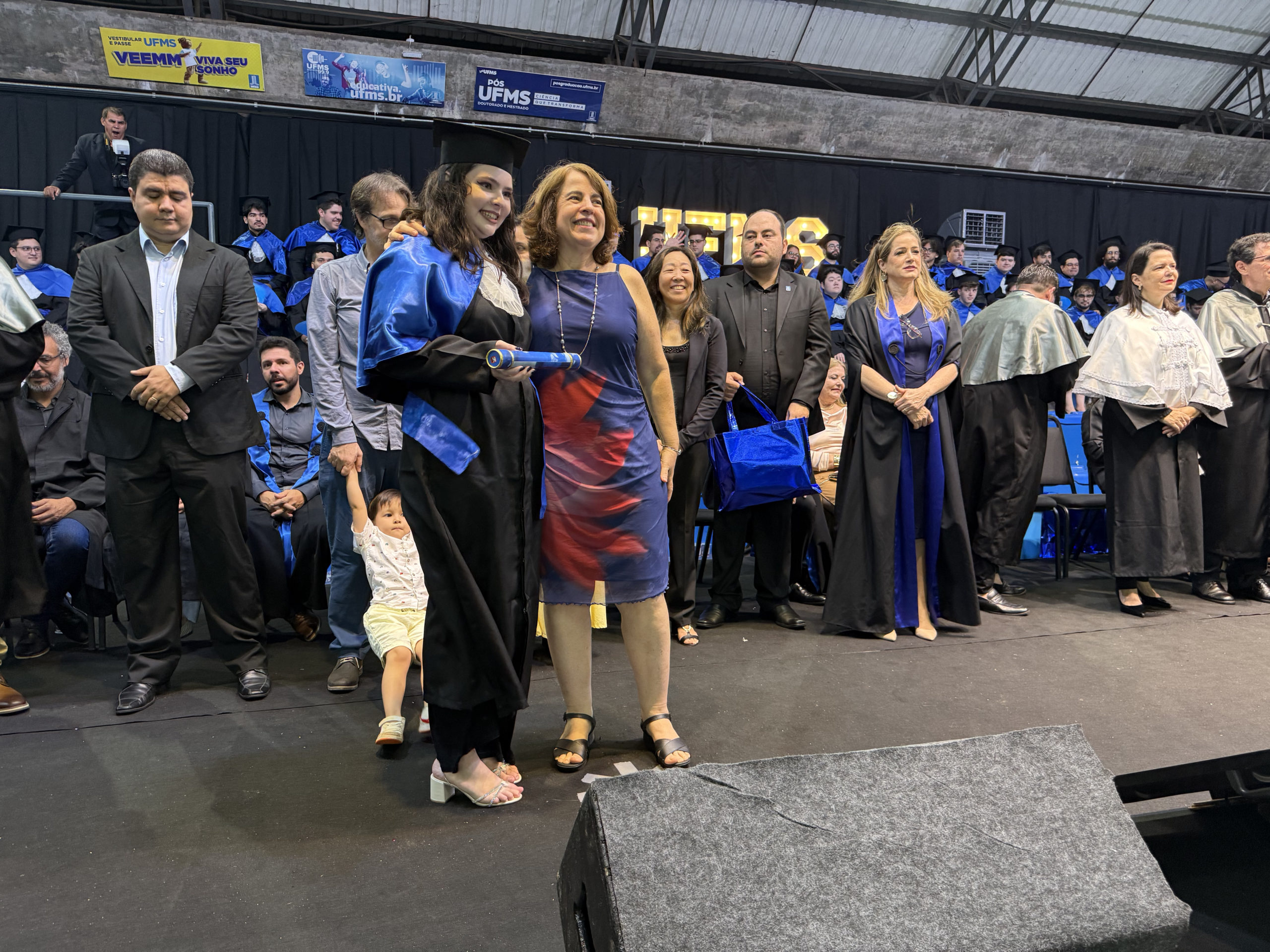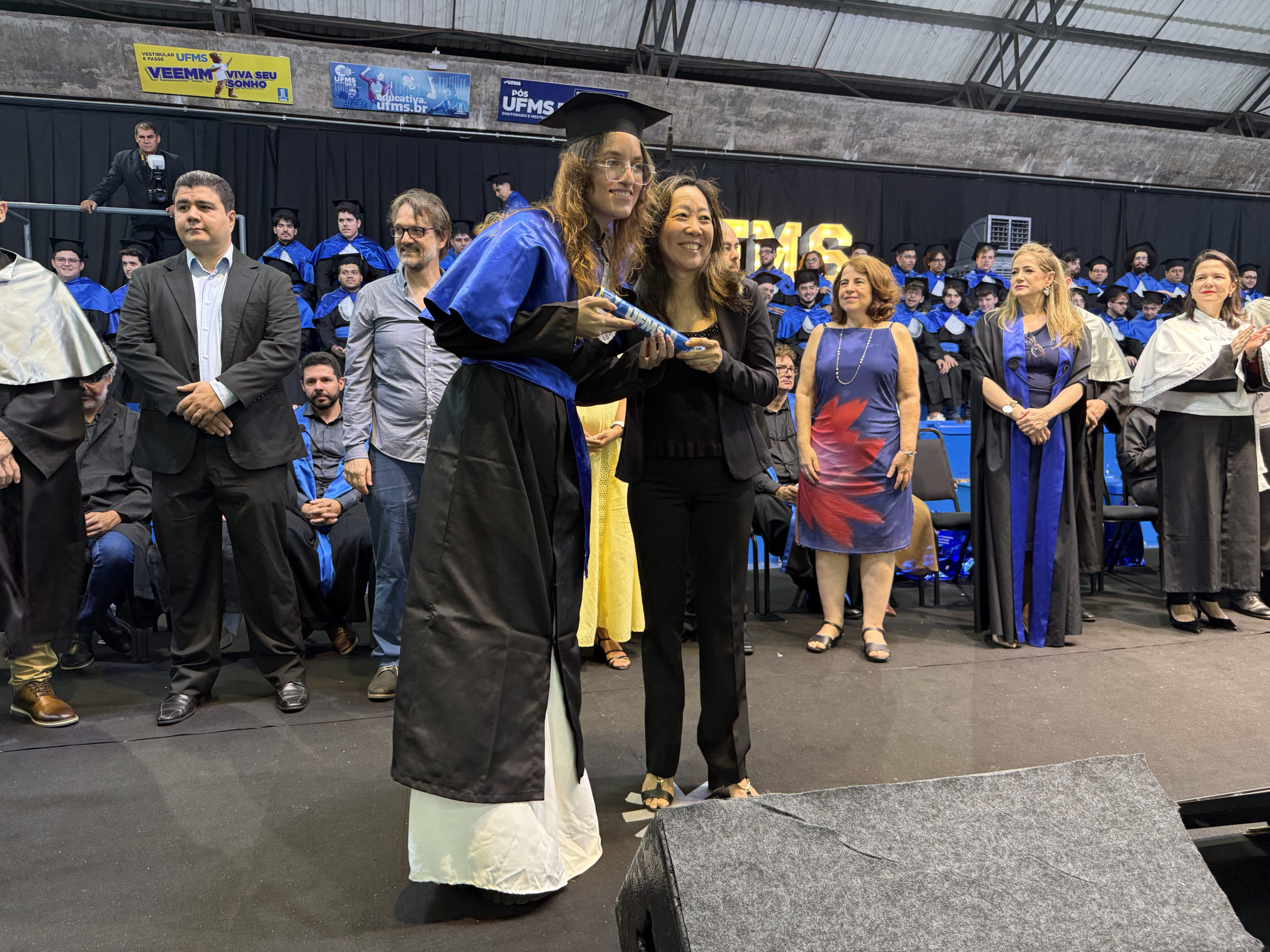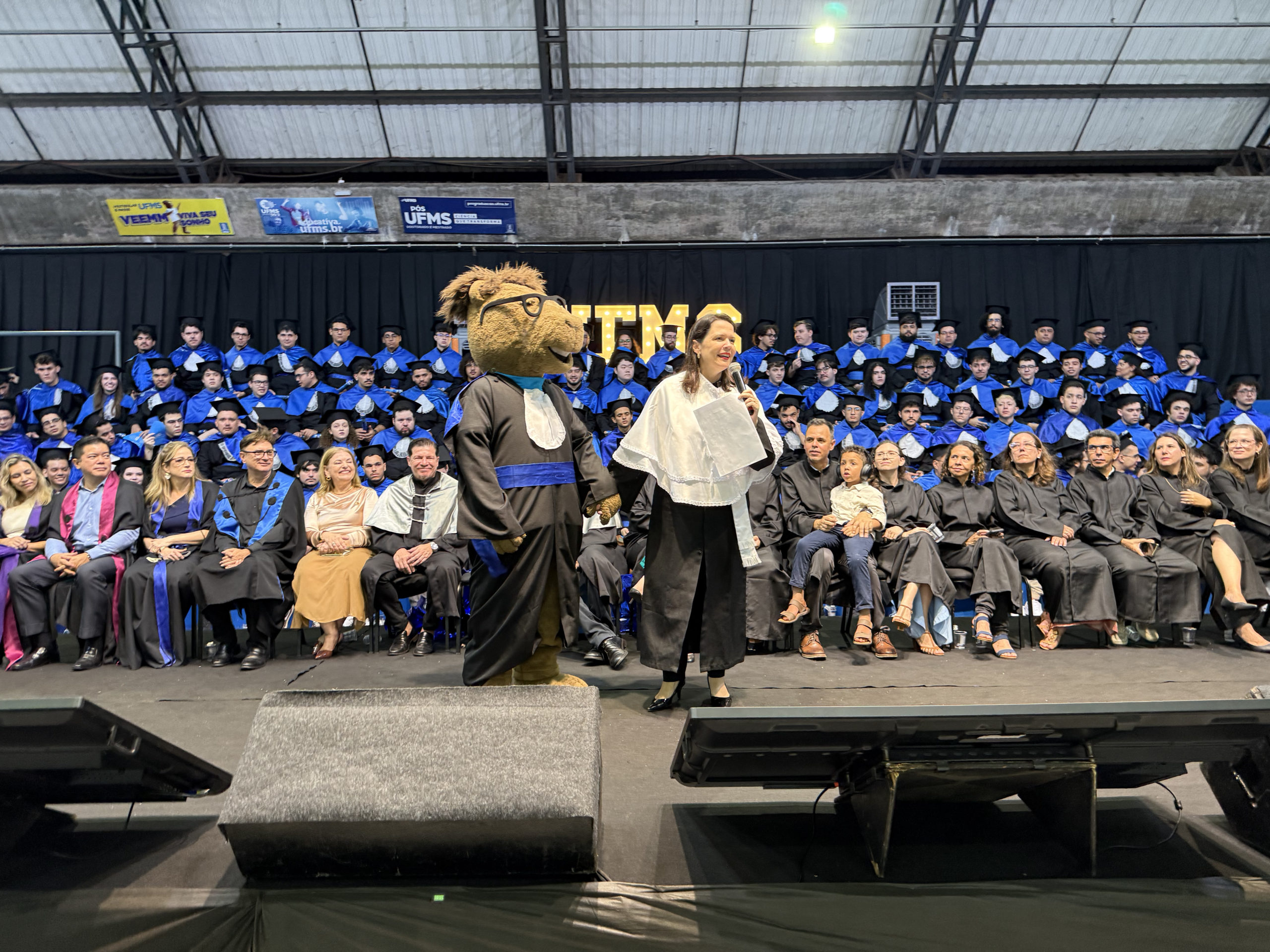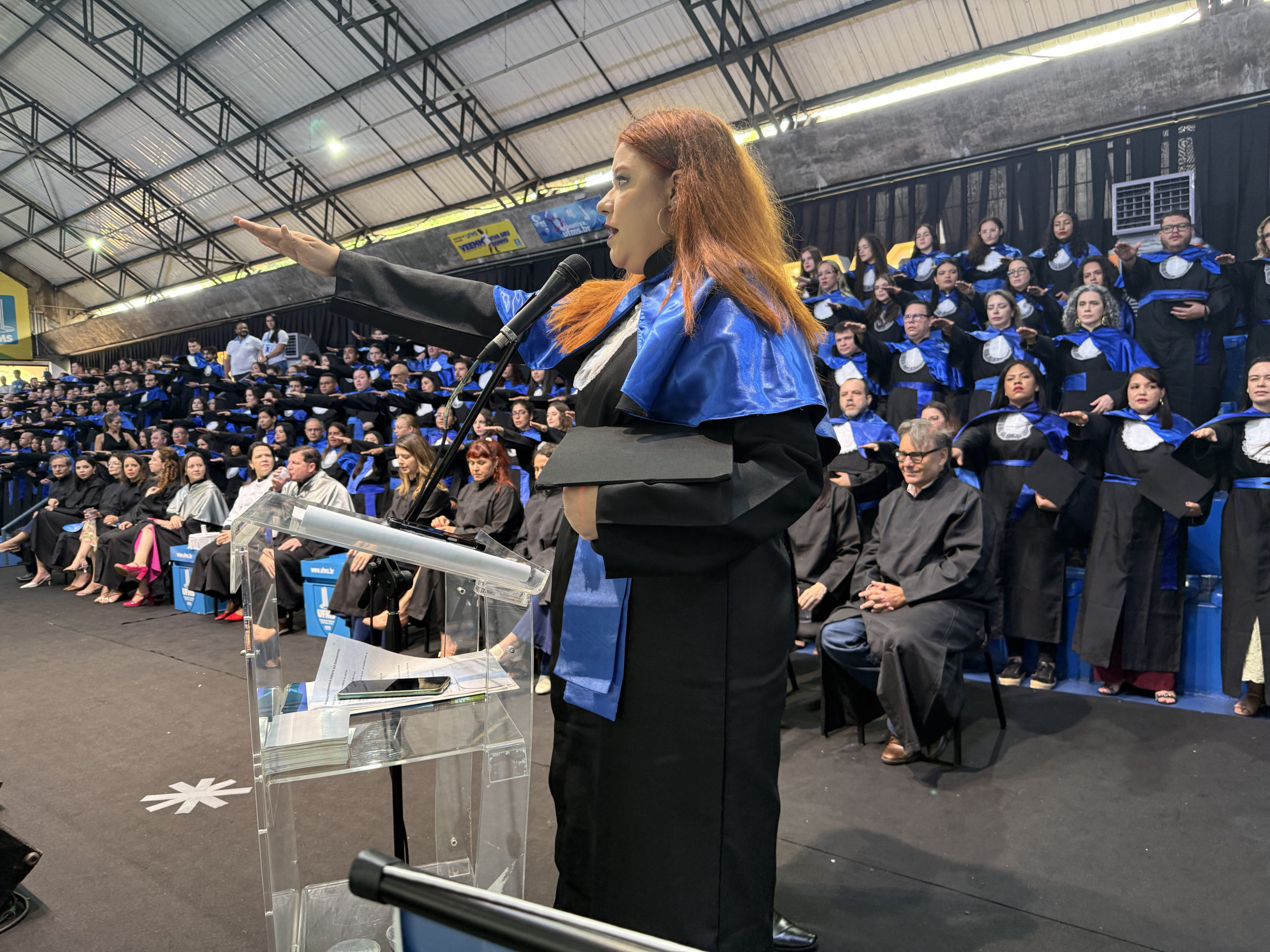 A reitora Camila Ítavo celebrou a conquista dos formandos. “Isso é UFMS, essa é a força da qualidade do ensino de uma Universidade que não é nota 10, é nota mil, mas pelo esforço de todos nós. De todos os estudantes, porque não é fácil, […] mas a gente tem certeza da qualidade que todos nós, professores e técnicos, dedicamos a cada um de vocês”, afirmou. A reitora ainda comemorou a inovação das cerimônias de todos os câmpus ainda em dezembro e parabenizou a todos. “Nós conseguimos bater um recorde de formandos e formandos na nossa Universidades, estamos com 18 cerimônias como estas em todo o Estado. Esse é o momento de agradecer e hoje o que estamos fazendo aqui é celebrando, é o momento de celebrar. Eu fiquei super feliz que ao ouvir os colegas, vocês ficaram felizes pelos colegas, isso é algo que passa a formação técnica, é a formação humana, cidadã, íntegra, que nós realmente confiamos que atuamos desse jeito na nossa Universidade. A gente tem que celebrar esses momentos porque momentos difíceis ocorrerão, mas os momentos que a gente pode comemorar, a gente tem que fortalecer”, acrescentou.