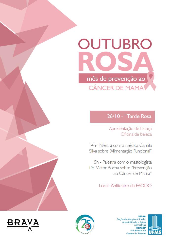 A “Tarde Rosa” promovida pela Pró-Reitoria de Gestão de Pessoas (PROGEP), por intermédio da Seção de Atenção à Saúde, Acessibilidade e Ações Afirmativas (SESAA), em parceria com o Programa de Assistência à Saúde da Universidade Federal de Mato Grosso do Sul (PAS-UFMS), acontecerá no dia 26 de outubro às 14 h no Auditório da Faculdade de Odontologia (FAODO).