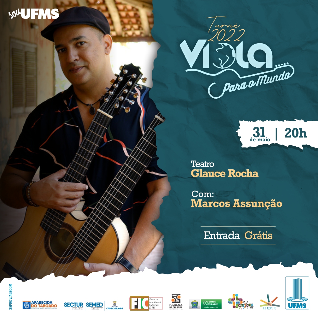 Na próxima terça-feira, 31, a partir das 20h, o músico Marcos Assunção realiza show de sua turnê “Viola para o Mundo” no Teatro Glauce Rocha. A apresentação é gratuita, aberta ao público e encerra uma série realizada entre abril e maio por todo o estado, nos Câmpus da UFMS.